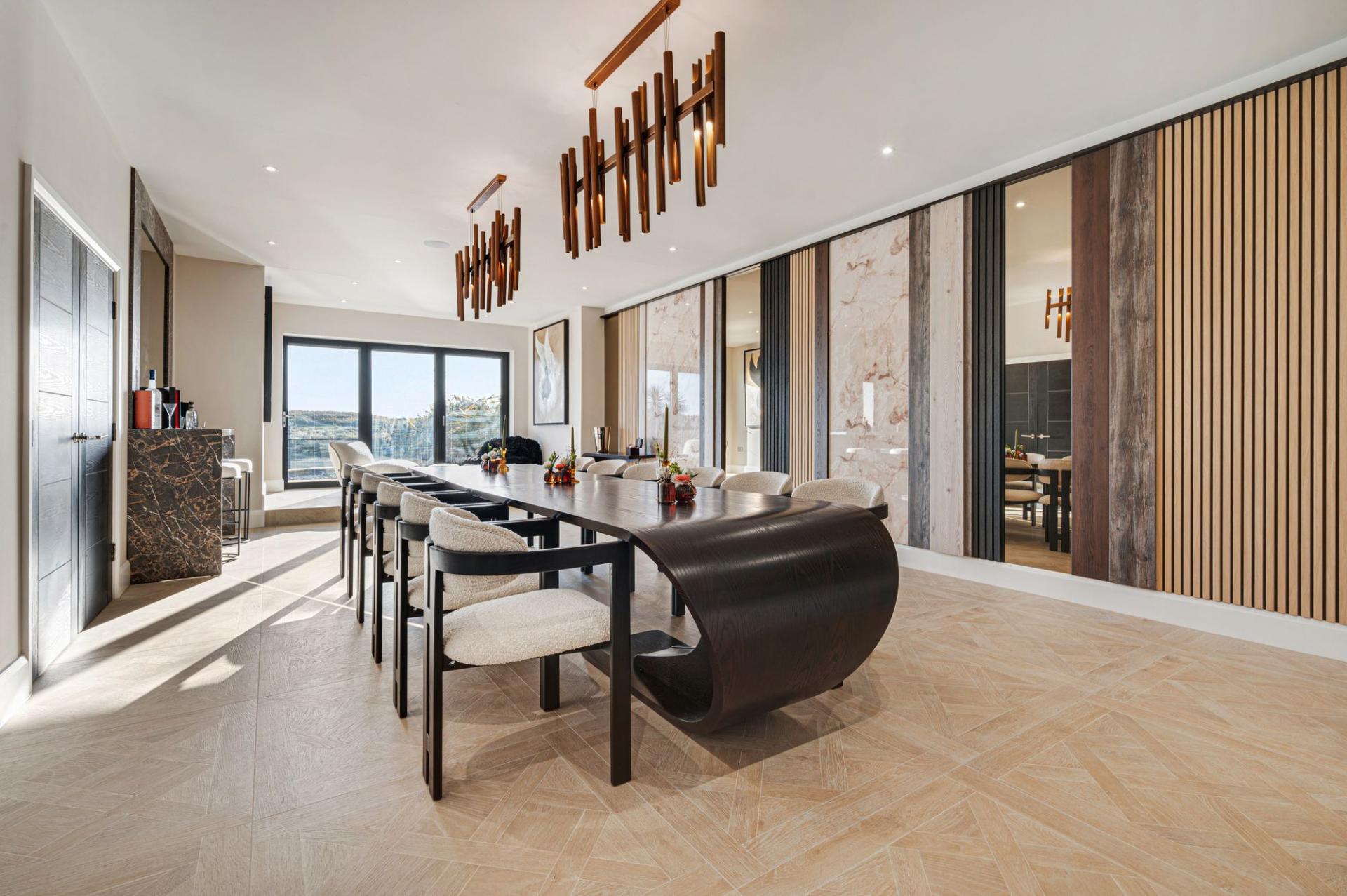 The formal dining room, equally grand in scale, also features bi-fold doors opening to the front, offering a perfect space for entertaining while maximizing the stunning coastal views. A ground-floor cloakroom adds convenience, while two separate utility rooms ensure effortless day-to-day living.