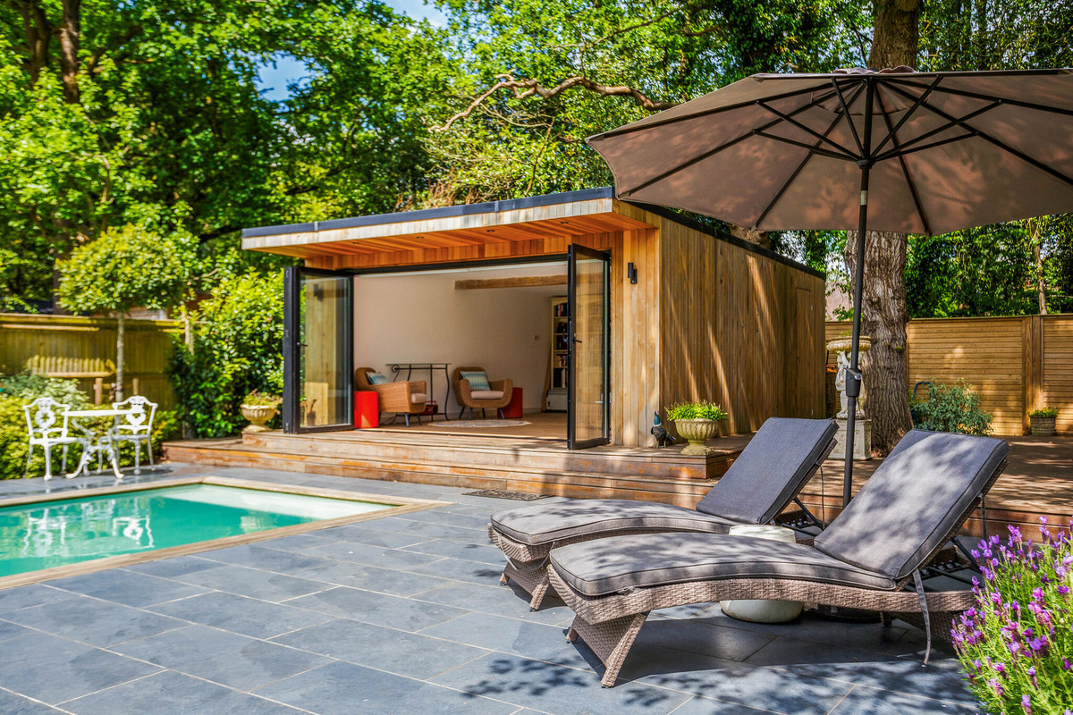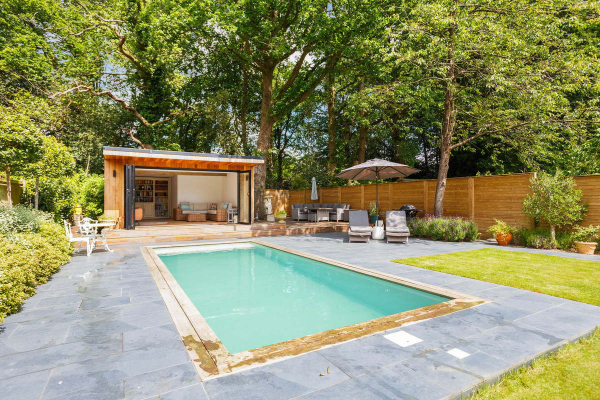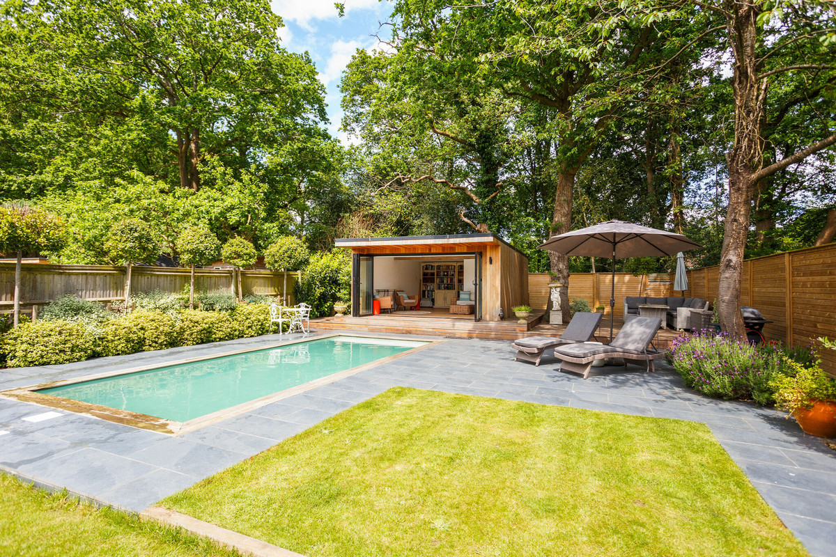 Outside - This property presents an impressive exterior, featuring a driveway with space for X cars, and a swimming pool. Additionally, a multipurpose Cedar wood outbuilding offers opportunity as a pool house, gym, or home office. The generously sized, private garden provides plenty of room for outdoor entertainment and enjoyment.