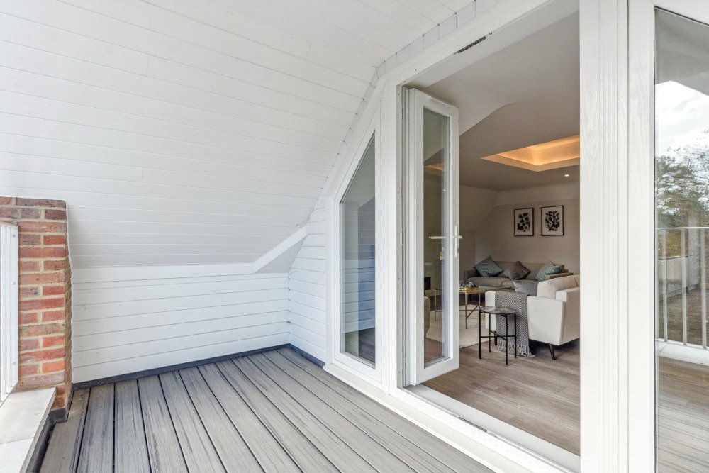 French doors lead from the living room to a 4m wide south-facing terrace, offering seamless indoor-outdoor living. Additionally, a Juliet balcony adds to the apartment's charm.