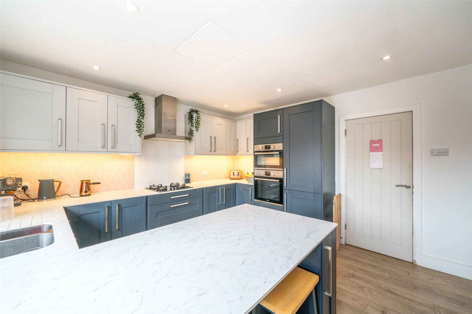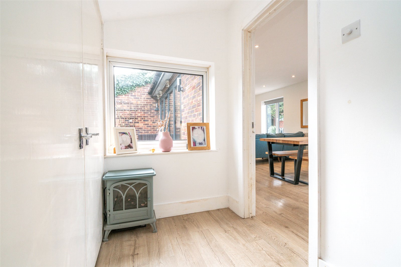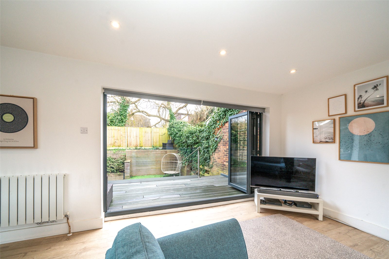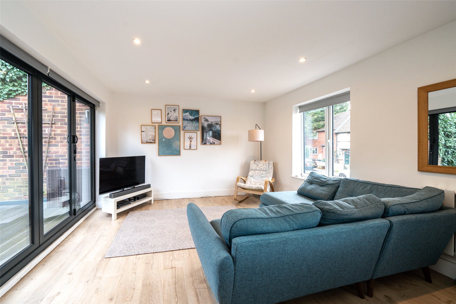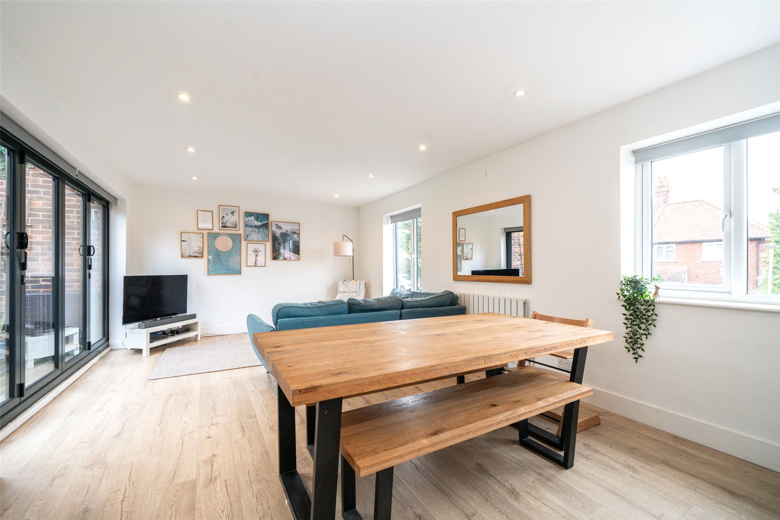 The first floor features a stylish, modern open plan living space, seamlessly connecting to a private balcony through elegant bifold doors, overlooking the rear garden. The contemporary kitchen is fully equipped with modern appliances and includes a convenient breakfast table. The space effortlessly flows from a dedicated dining area to a comfortable family living zone, creating the perfect setting for both relaxation and entertaining.