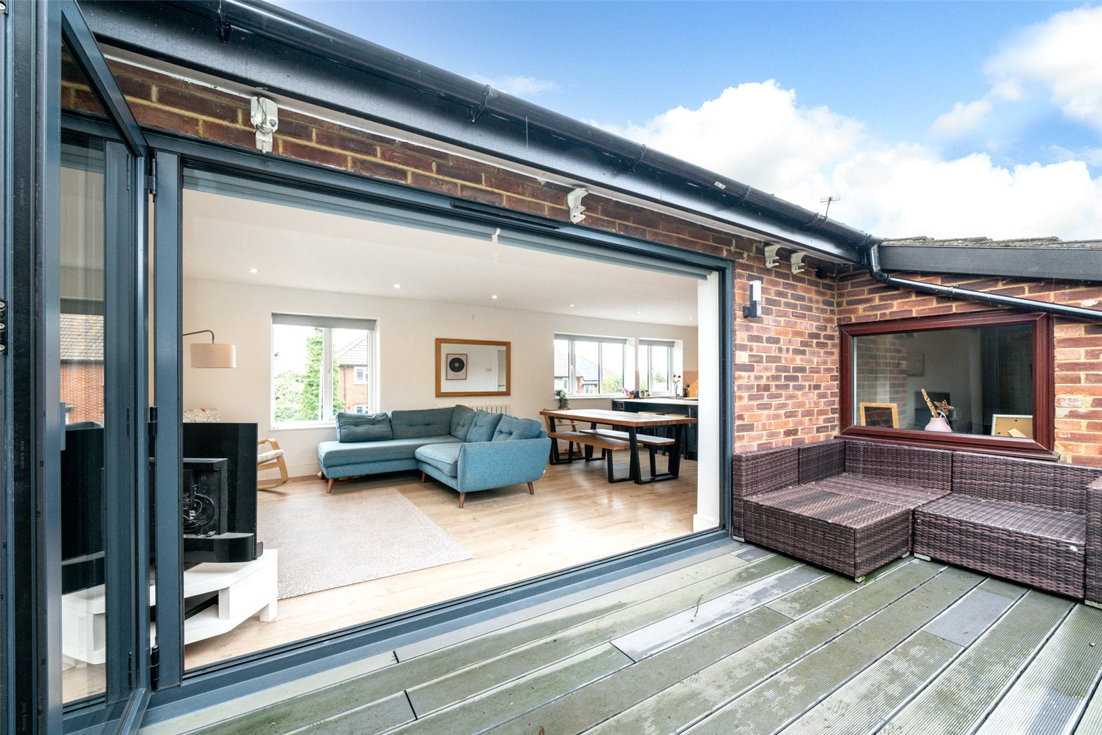 The decked balcony flows onto a charming, terraced garden with multiple levels and individual sections, offering the perfect setting for both family relaxation and entertaining.