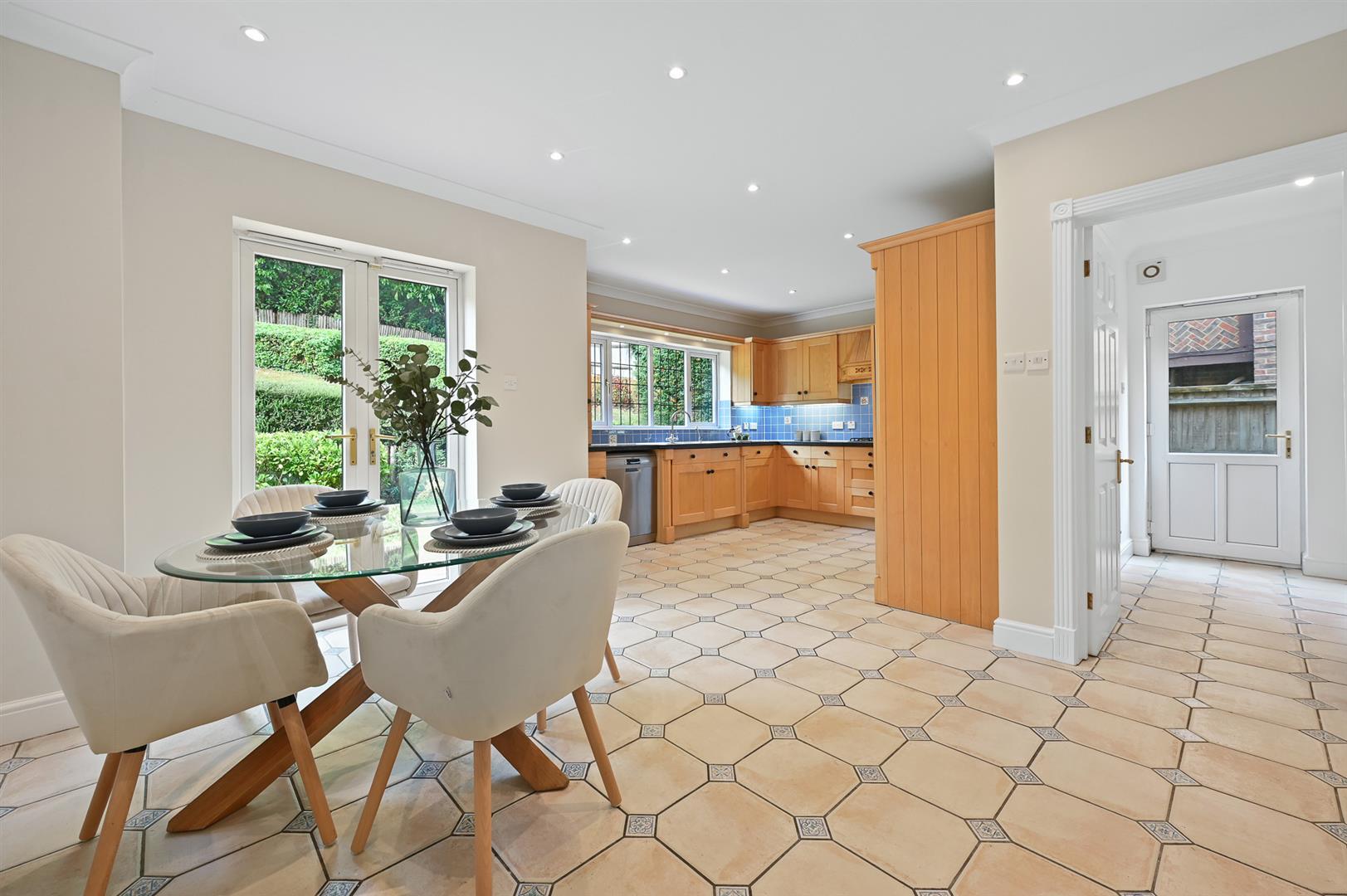A spacious reception hallway leads to four versatile reception rooms, a cloakroom, and a well-appointed kitchen/breakfast room. The kitchen is extensively fitted with units and integrated appliances, with ample space for family dining. The sitting room enjoys dual-aspect views and an elegant inglenook-style brick fireplace, while the additional dining room, family room, and study provide further flexibility. A separate staircase leads to the integral double garage, offering parking for two cars, storage, or scope for a home gym.