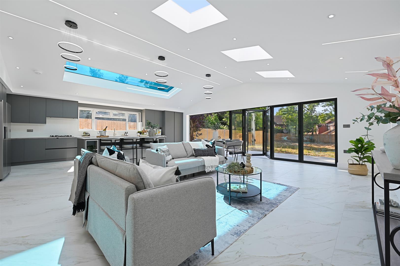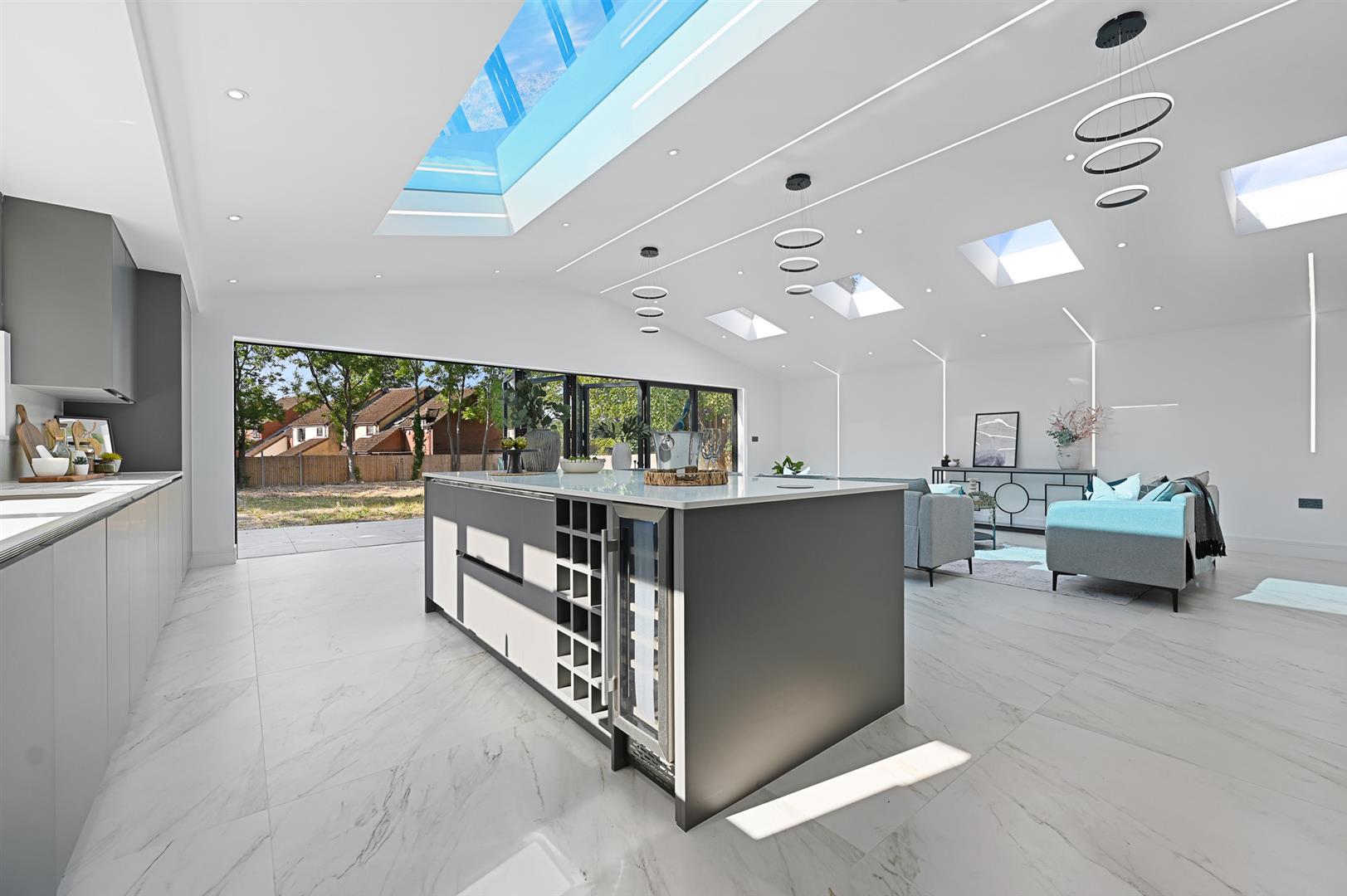 At the heart of the residence is a striking open-plan kitchen and living area, featuring sleek, high-spec finishes and expansive bi-fold doors that open onto a large garden and patio-offering the perfect setting for entertaining or enjoying private outdoor moments.
