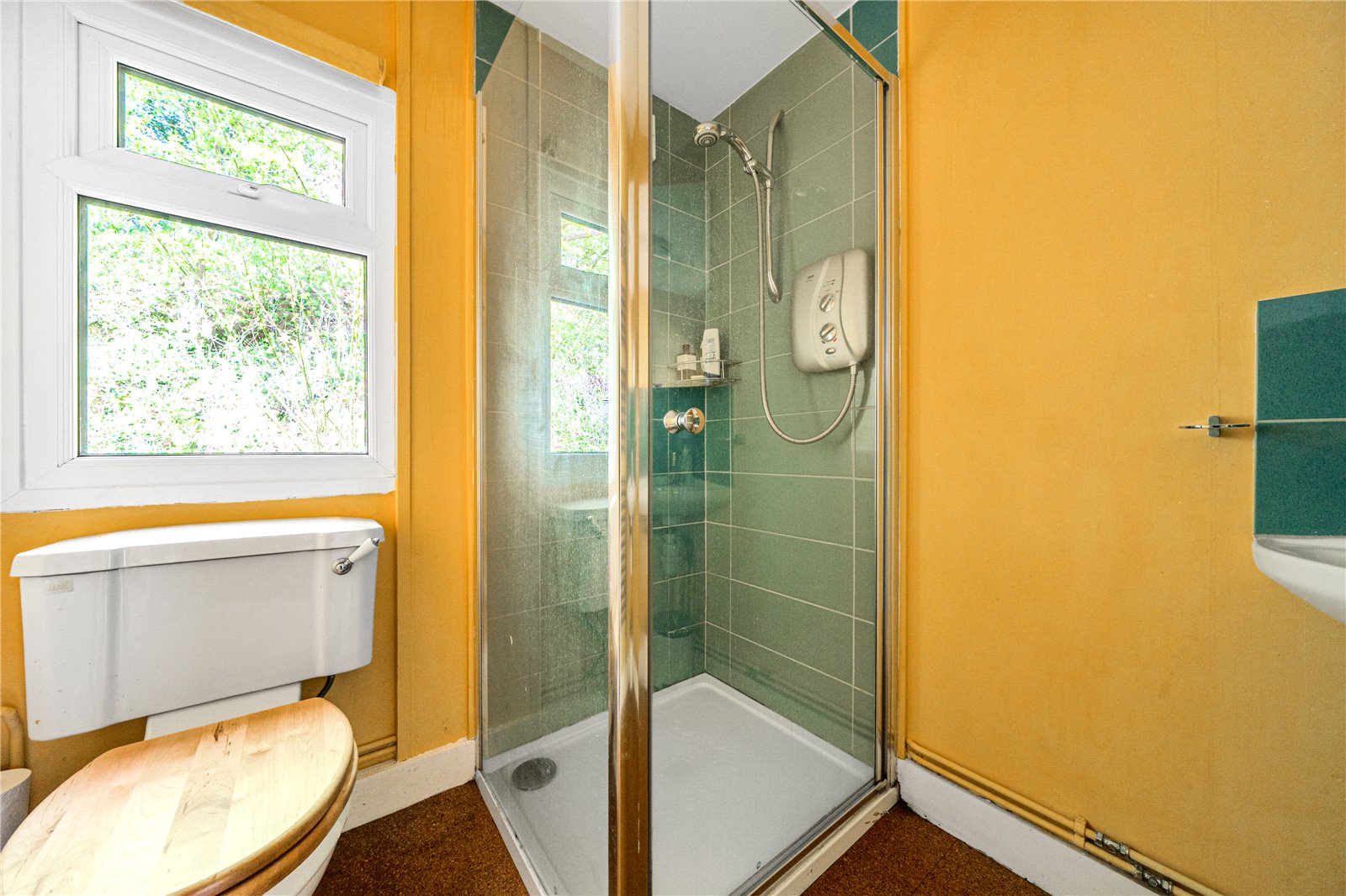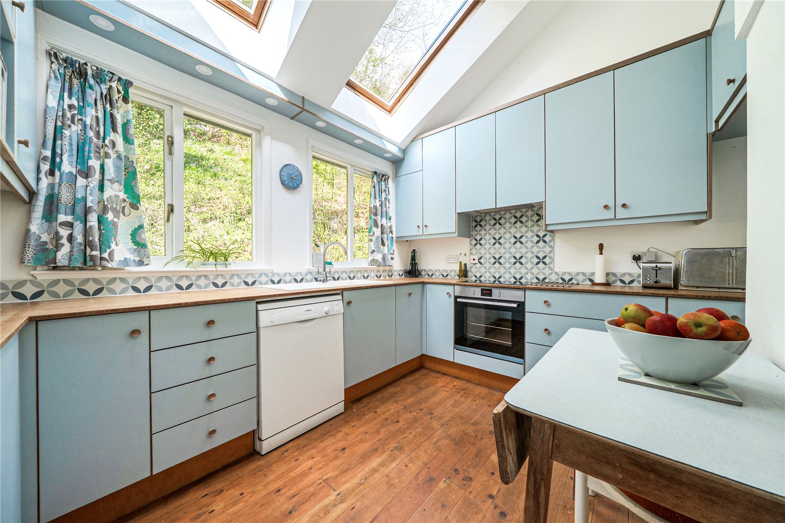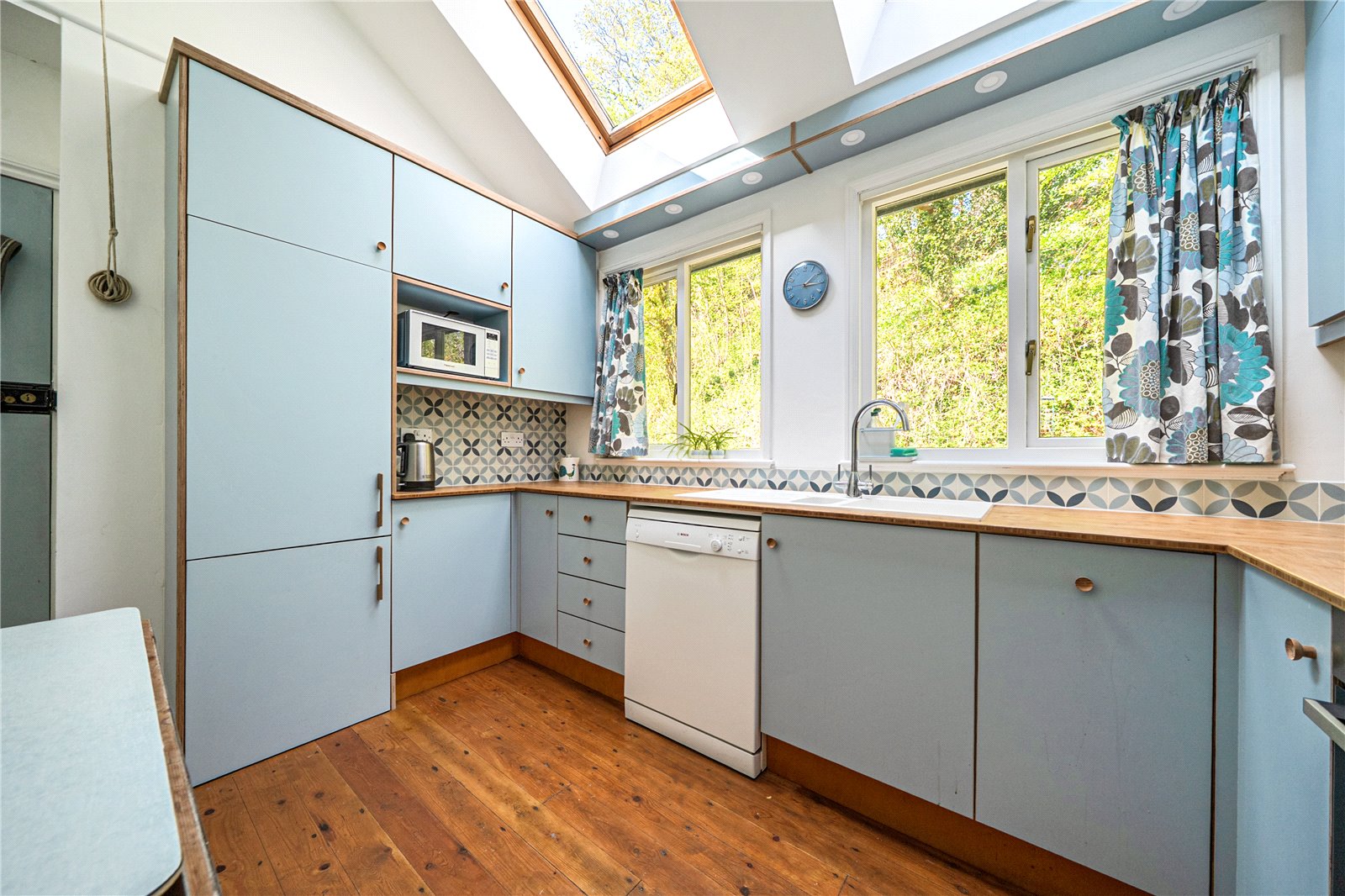 Steps lead up to the front door, which opens into a welcoming entrance hall. To the right, you’ll find the light and airy open-plan living and dining room, featuring two beautiful bay windows that frame the views of the river and surrounding hills. A painted exposed stone fireplace with a wood-burning stove creates a cosy focal point, with built-in shelves beside it, perfect for storing logs. A service hatch links the space to the kitchen, making it ideal for entertaining. From the dining area, a door to the left opens into a small inner hallway that leads to the shower room and the second bedroom. This is a generous double bedroom, with plenty of space for a desk or work area if needed. To the rear of the dining room, another door leads into the master bedroom, which benefits from a large window overlooking the side garden and rolling hills beyond, offering a peaceful and picturesque outlook