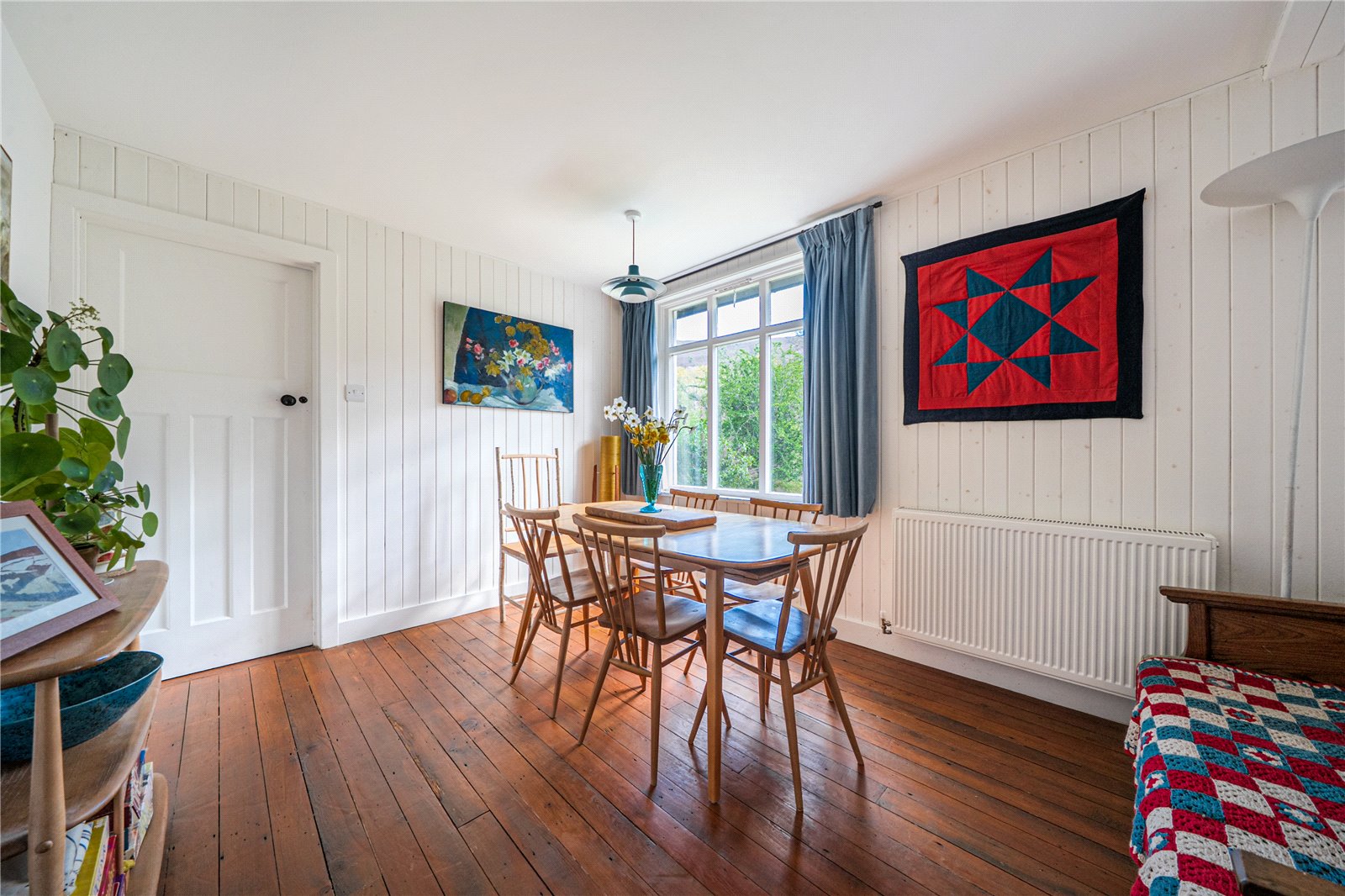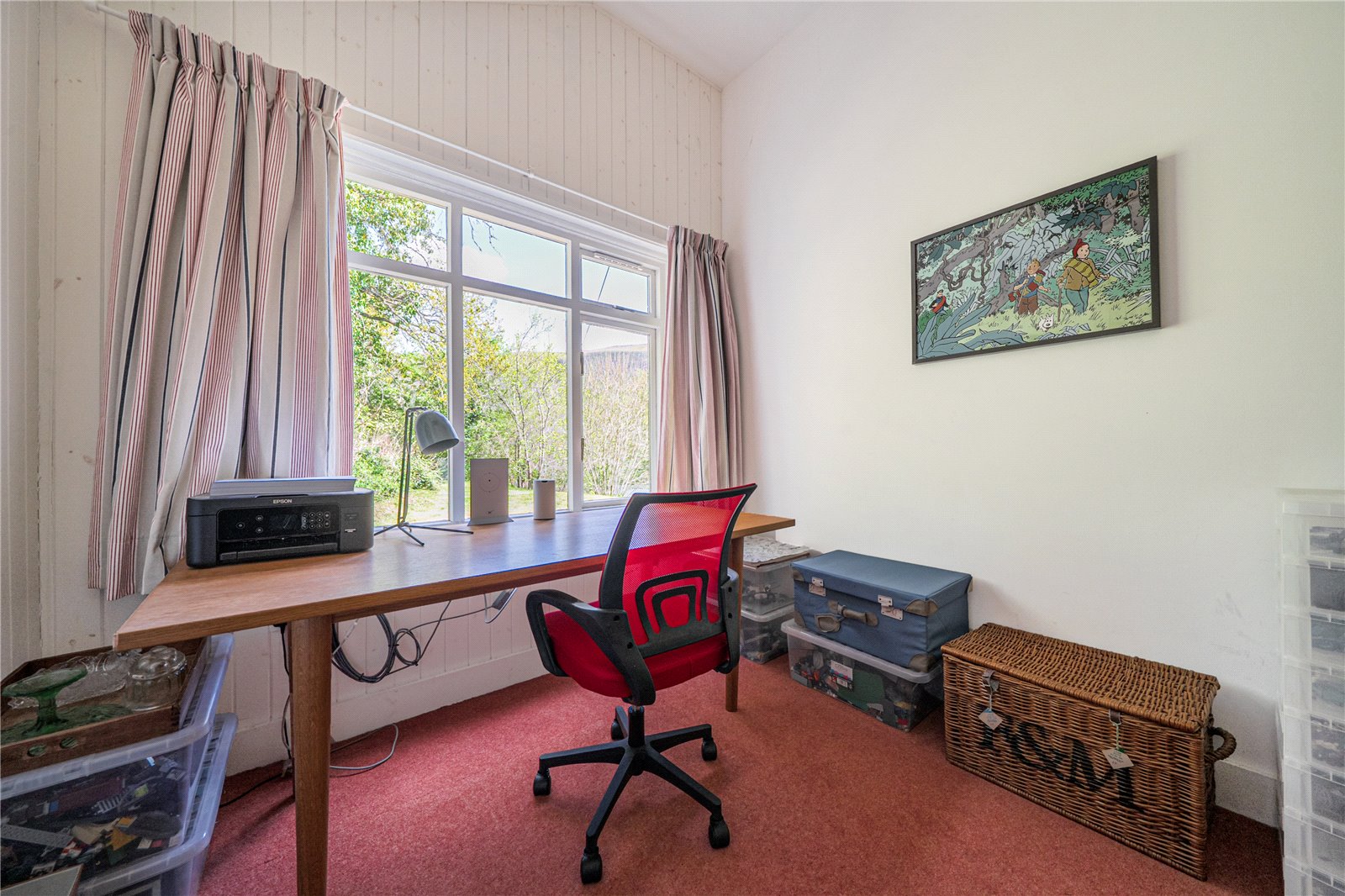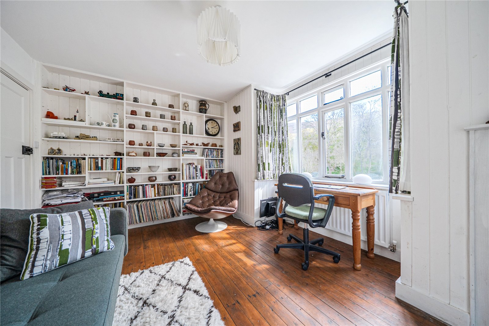 From the entrance hall, straight ahead is the family bathroom, featuring attractive wall panelling, built-in cupboards, and a light, welcoming feel. A further door to the right leads into the kitchen—a bright and airy space with high ceilings. The current owners have had a bespoke kitchen fitted to maximise both style and functionality, and there’s ample room for a breakfast table and chairs, making it a great spot for casual dining. To the left of the entrance hall, you'll find the useful storage cupboard and the third bedroom, which includes a built-in wardrobe and a window overlooking the garden. A further versatile room is also located to the left—a beautiful space with built-in shelving, a modern-style wood-burning stove, and a charming bay window. Double doors open out onto the raised decking area, creating an ideal indoor-outdoor connection and a perfect place to relax and enjoy the peaceful surroundings.