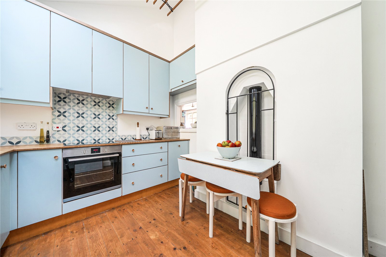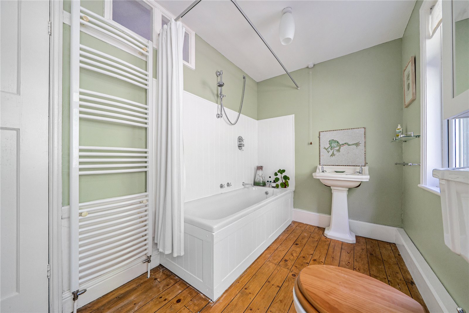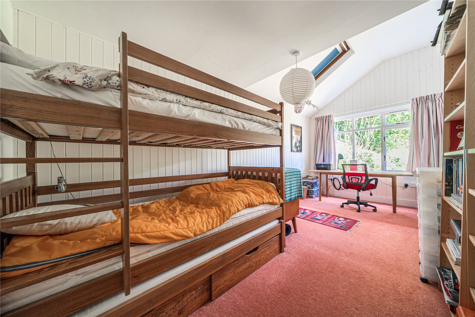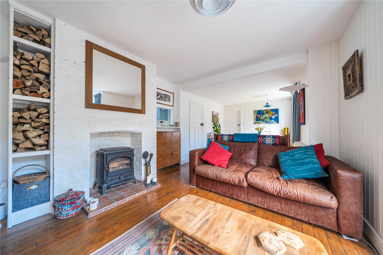 From the entrance hall, straight ahead is the family bathroom, featuring attractive wall panelling, built-in cupboards, and a light, welcoming feel. A further door to the right leads into the kitchen—a bright and airy space with high ceilings. The current owners have had a bespoke kitchen fitted to maximise both style and functionality, and there’s ample room for a breakfast table and chairs, making it a great spot for casual dining. To the left of the entrance hall, you'll find the useful storage cupboard and the third bedroom, which includes a built-in wardrobe and a window overlooking the garden. A further versatile room is also located to the left—a beautiful space with built-in shelving, a modern-style wood-burning stove, and a charming bay window. Double doors open out onto the raised decking area, creating an ideal indoor-outdoor connection and a perfect place to relax and enjoy the peaceful surroundings.