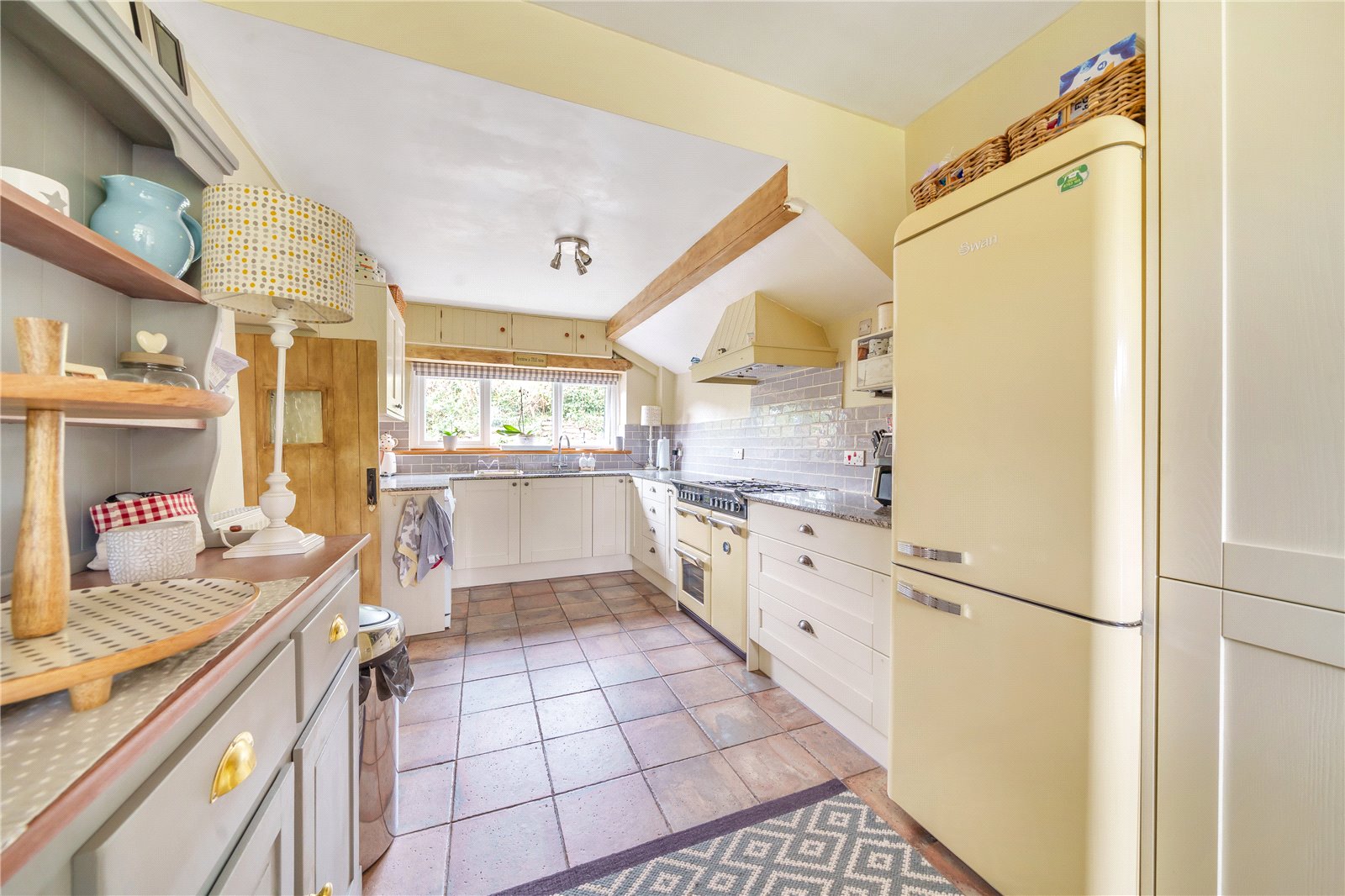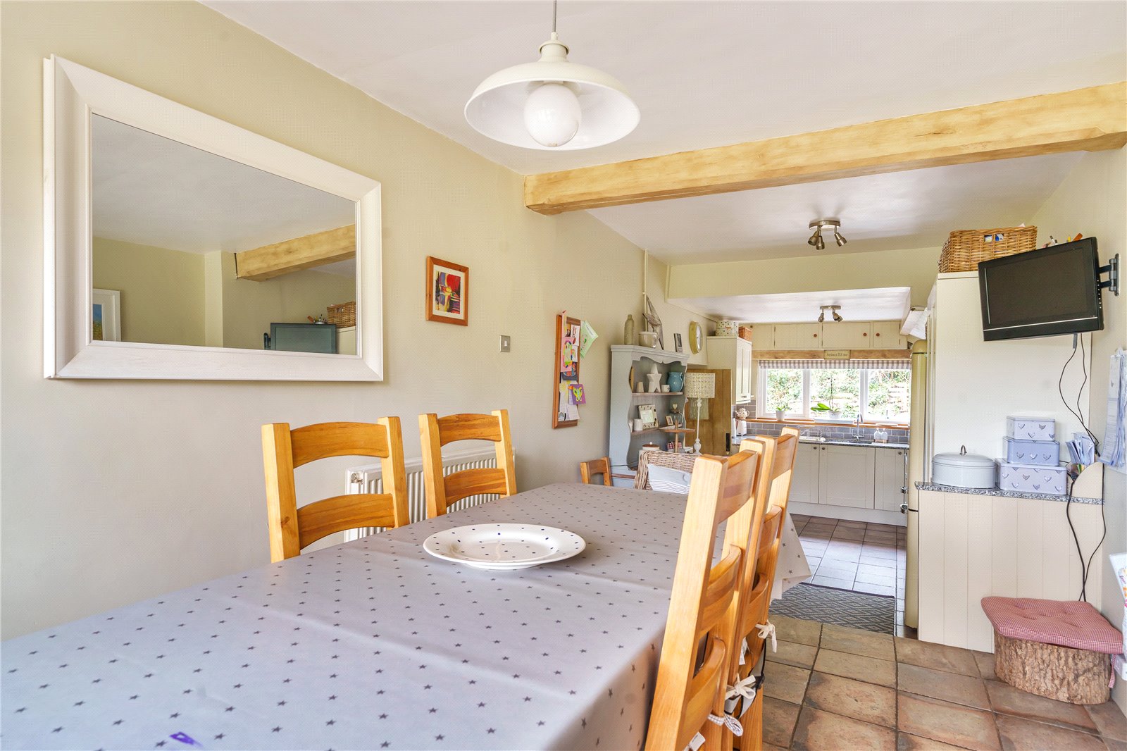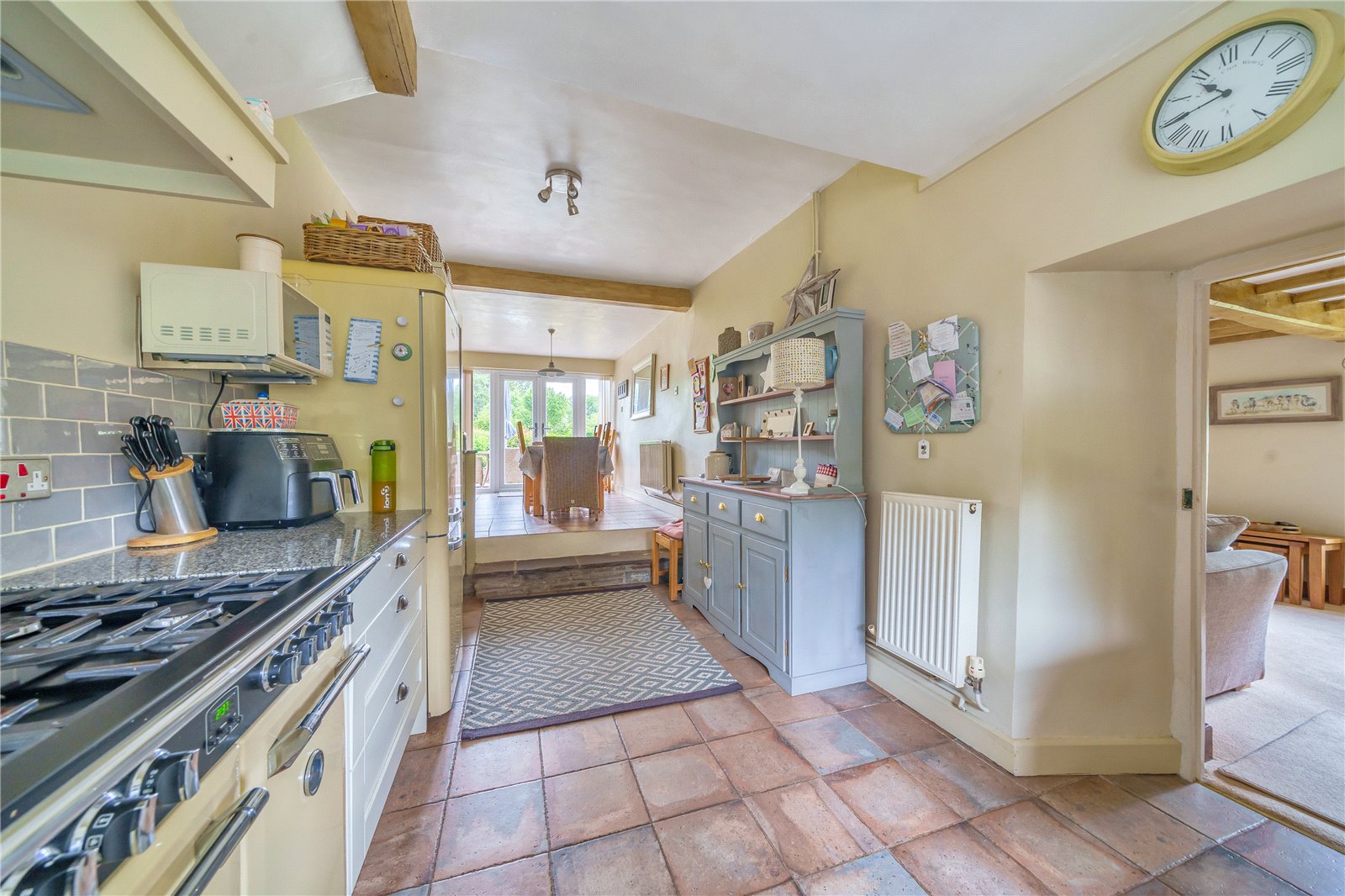 The property is approached by a spacious entrance porch with attractive wooden door opening into the living room. This room is full of character having exposed timbers, stone chimney breasts at either side of the room with one having an inset multi fuel stove. To the left is a door to the kitchen dining room, a lovely light room with tiled floor, shaker style fitted wall and base units, granite worktops with inset 1 ½ bowl sink, large window, and recess for cooker and white goods. Steps lead up to the dining room with French doors opening onto the patio area and further door to the utility. The utility has a separate rear stable door, worktop space and door to cloakroom.