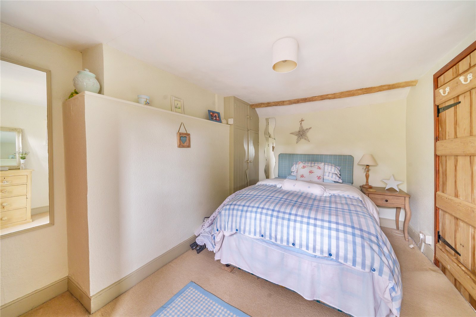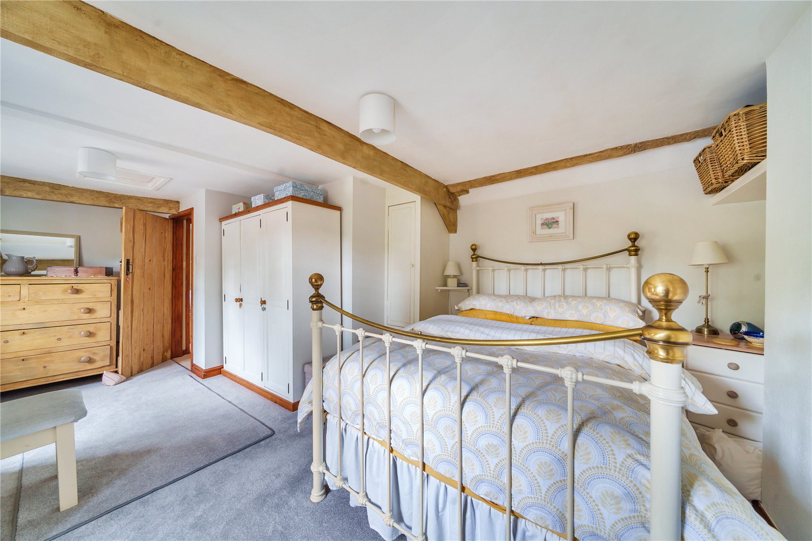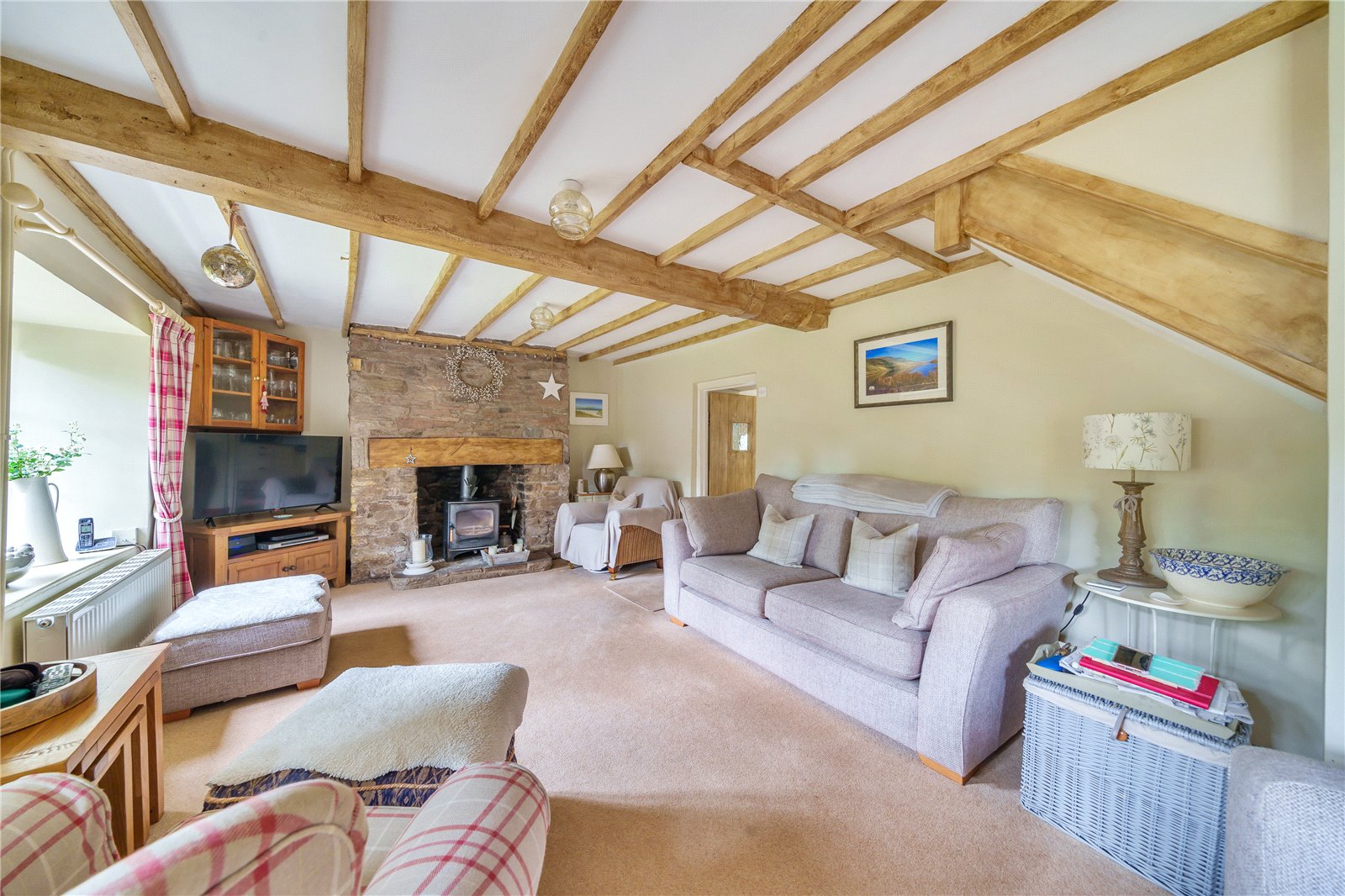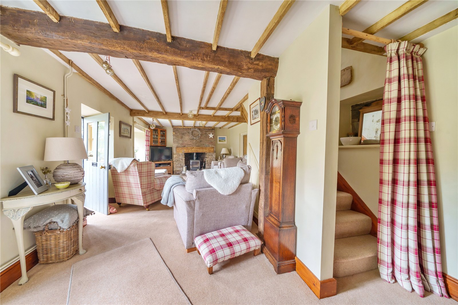 The staircase provides access to the landing with exposed timbers, and Velux. To the right are two good sized bedrooms, both with built in cupboards, windows to the front and the master benefitting from exposed timbers. A further set of stairs take you to a third double bedroom with window overlooking the pretty gardens, and family bathroom comprising panelled bath, shower cubicle with tiled splashback, wash hand basin, wc and Velux.