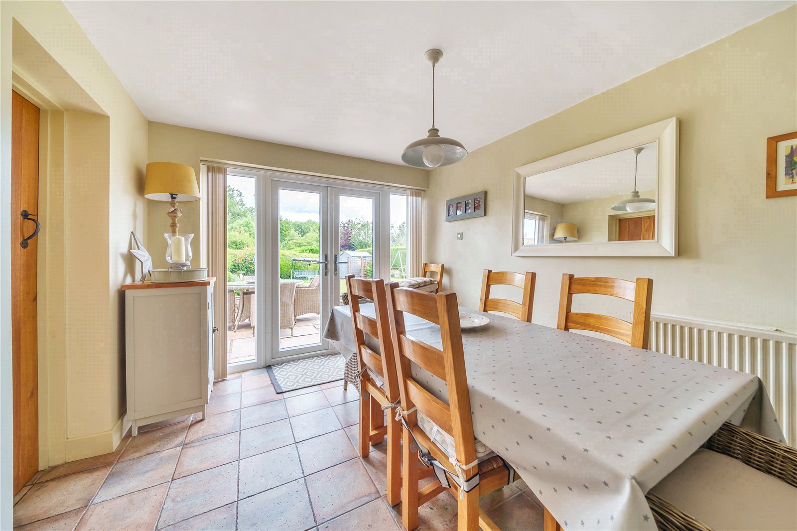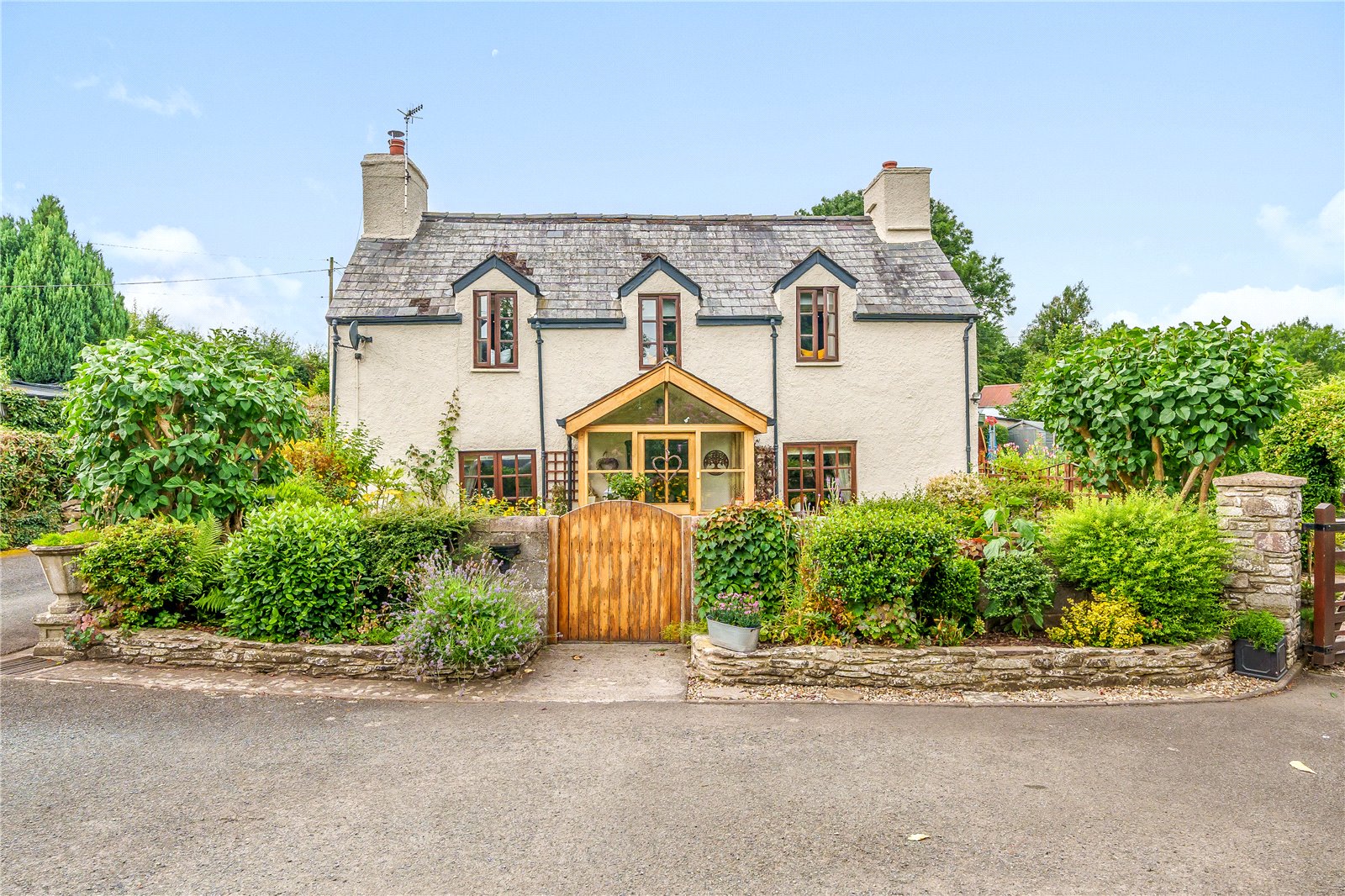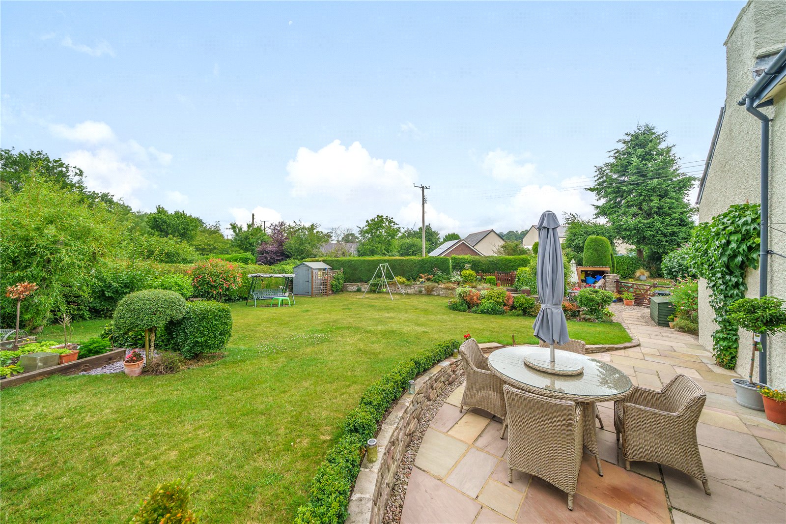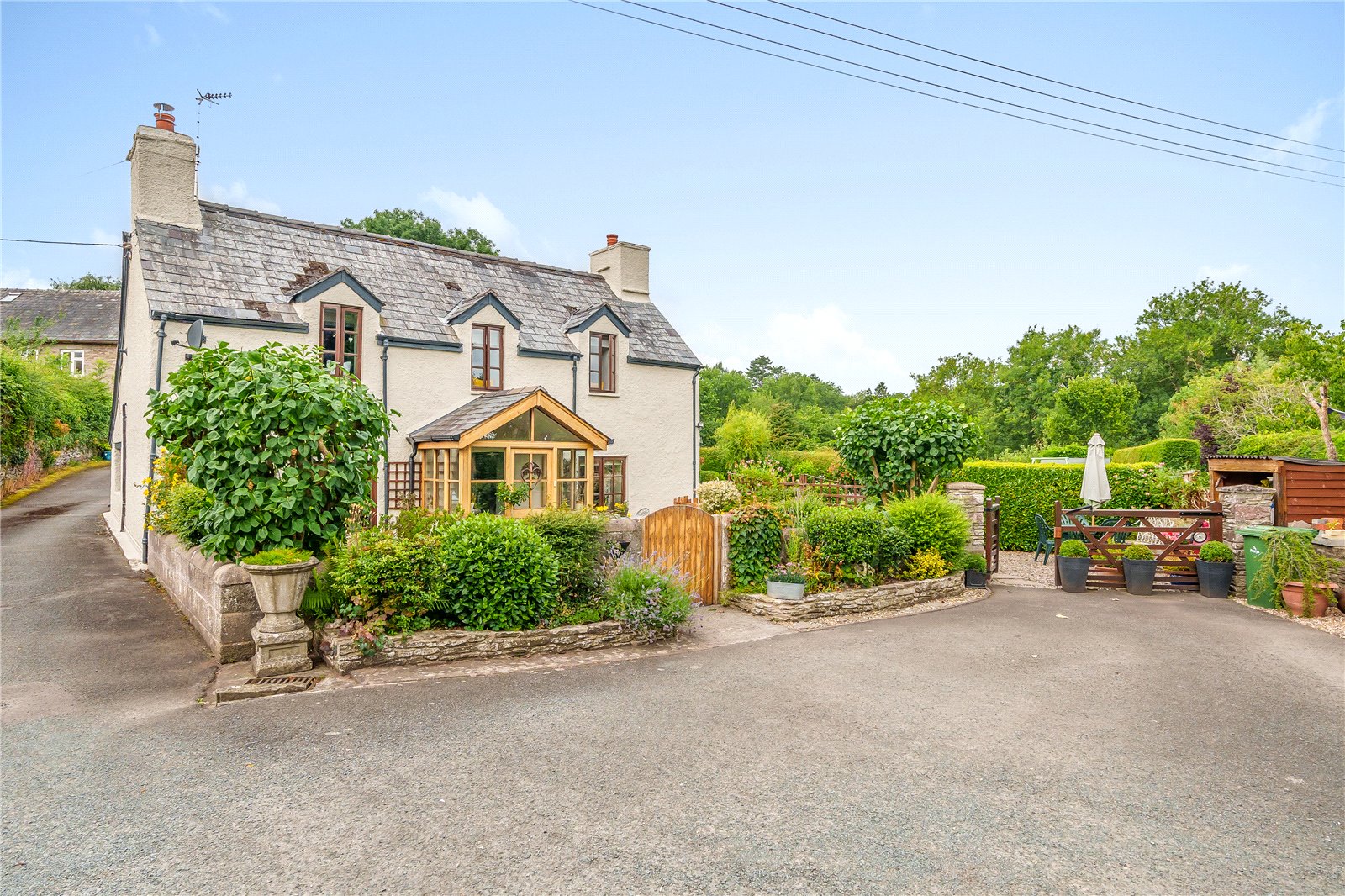 The property is approached by a driveway with a low levelled wall and pedestrian gate to the main entrance with raised flower borders, lawned area to either side of the pathway and gate to the rear garden. There is a driveway with gated entrance with pathway taking you to the rear garden with log store. The beautifully presented garden is enclosed with mature hedges, a lovely patio area that can be accessed via the dining room French doors and has steps up to a handy garden workshop, the lawned garden benefits from raised vegetable beds, mature trees, shrubs, and pretty flower borders and another garden shed. At the bottom of the garden there are steps leading to another seating area to enjoy the sunshine and steps to the babbling brook.