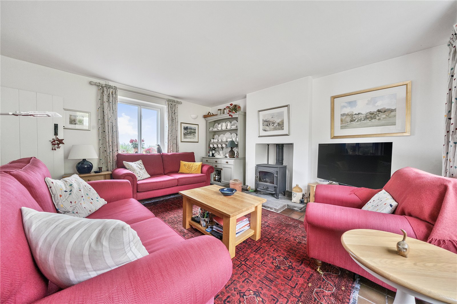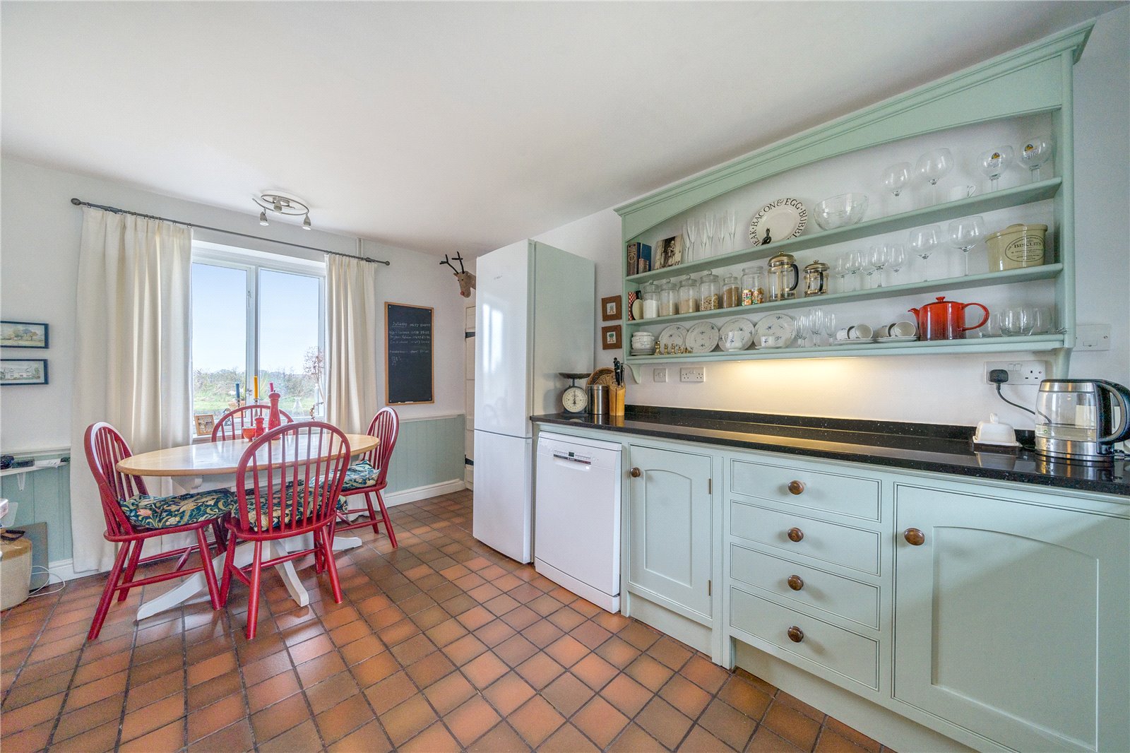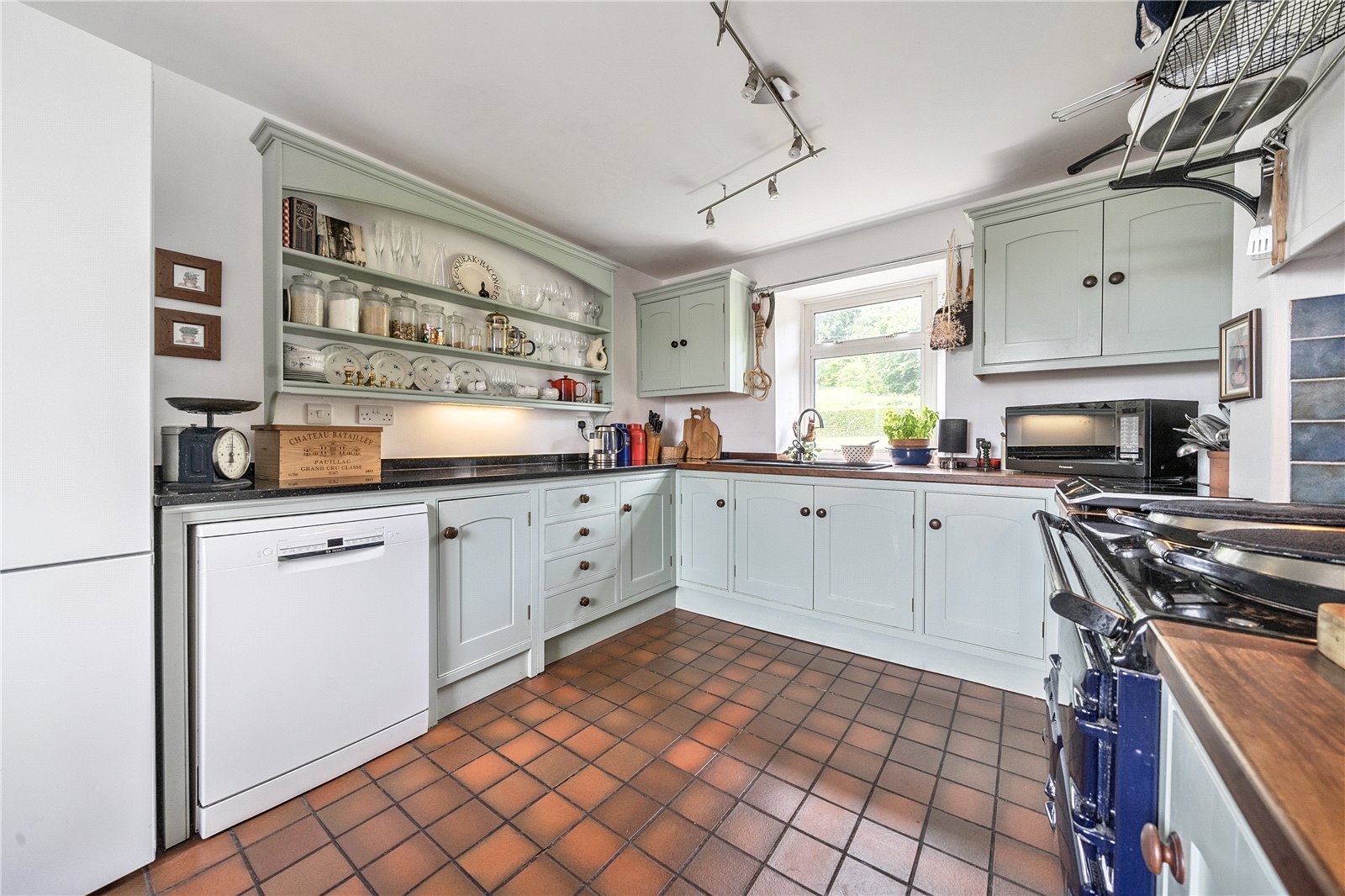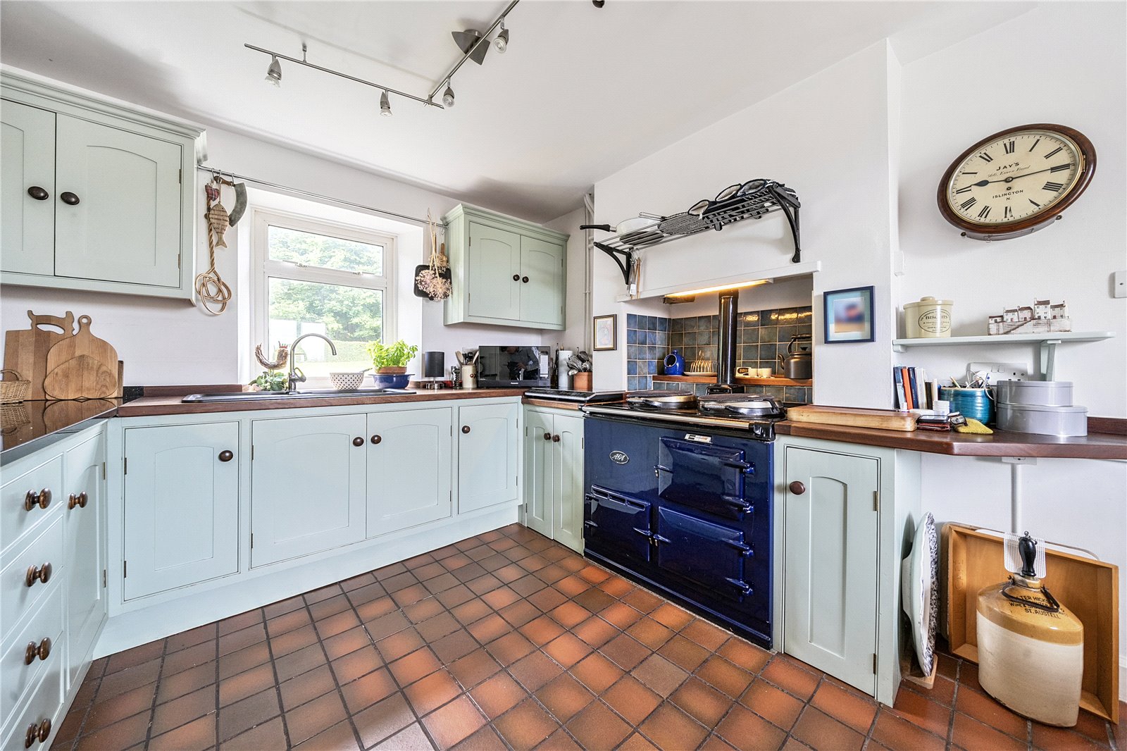 The original front door opens into a welcoming entrance hall with a staircase leading to the first floor.To the left is a charming living room, featuring a fireplace with a Clearview wood-burning stove. This room enjoys dual-aspect windows, bringing in natural light, and a glass door that opens onto steps leading to the garden. Additional storage is available under the stairs. To the right of the entrance hall is the kitchen-dining room, also benefitting from dual-aspect windows. This space includes bespoke handmade kitchen units with an oil-fired Aga set in a recessed alcove, as well as a dresser-style shelving unit.From here, a door opens into a practical utility area and a downstairs cloakroom, with further access to the garden.