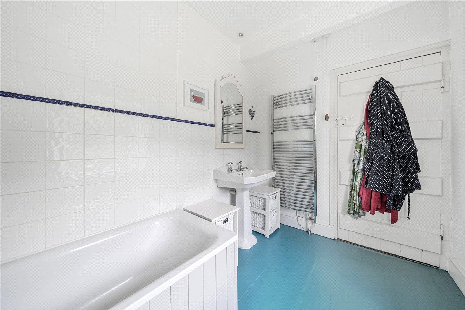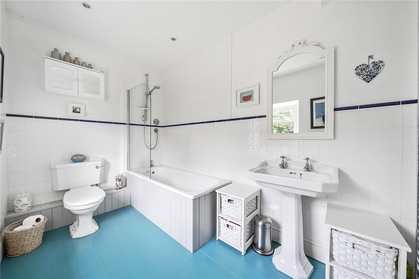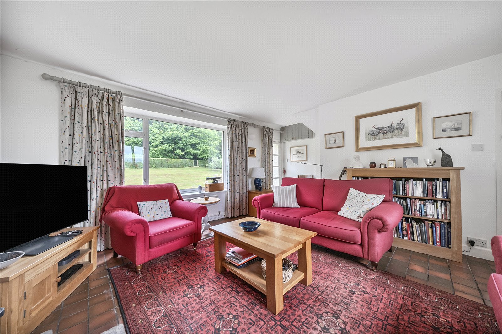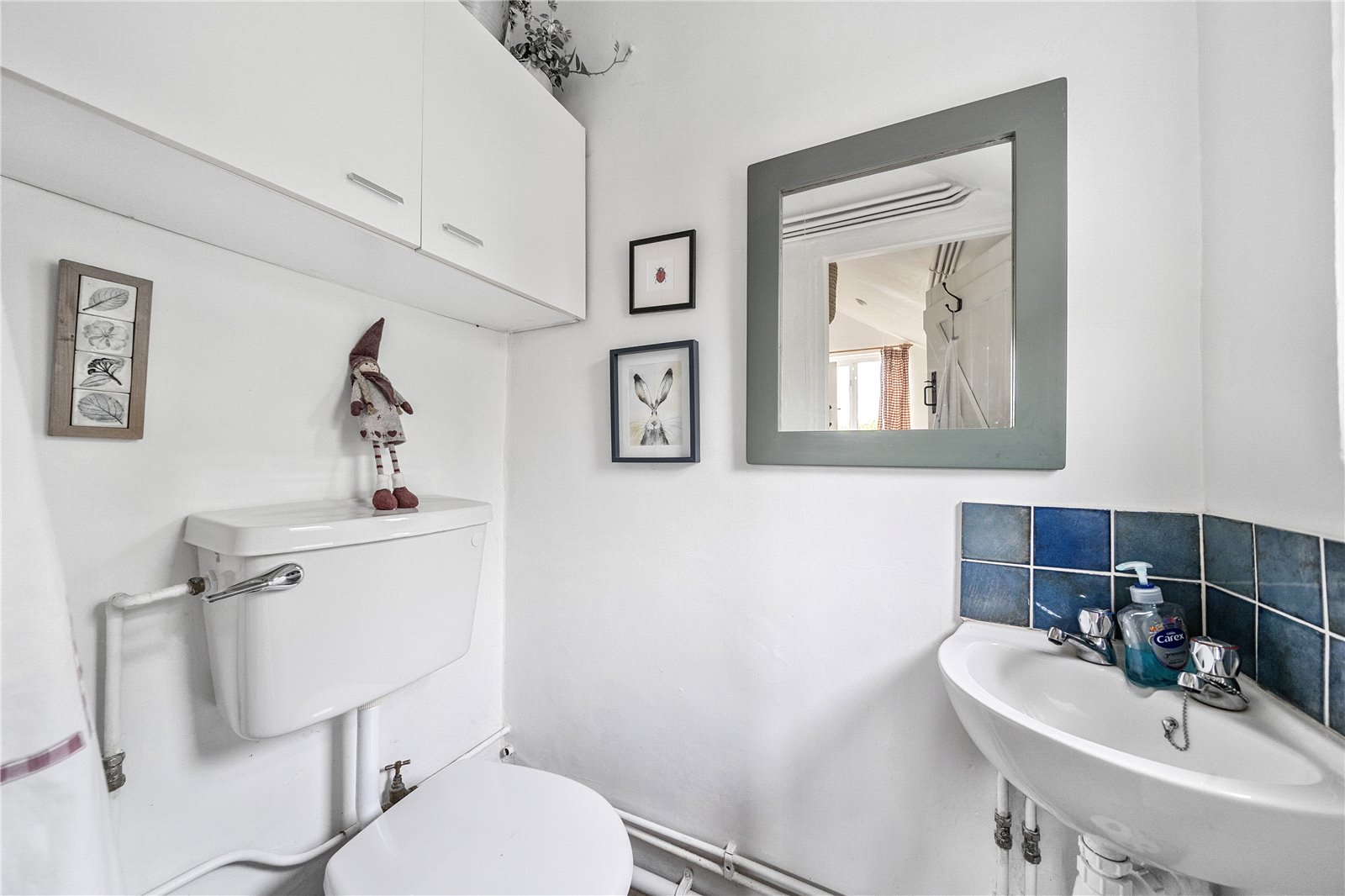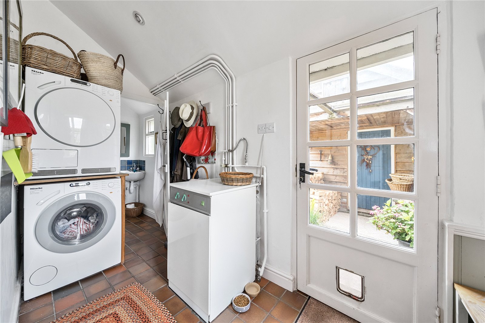 The original front door opens into a welcoming entrance hall with a staircase leading to the first floor.To the left is a charming living room, featuring a fireplace with a Clearview wood-burning stove. This room enjoys dual-aspect windows, bringing in natural light, and a glass door that opens onto steps leading to the garden. Additional storage is available under the stairs. To the right of the entrance hall is the kitchen-dining room, also benefitting from dual-aspect windows. This space includes bespoke handmade kitchen units with an oil-fired Aga set in a recessed alcove, as well as a dresser-style shelving unit.From here, a door opens into a practical utility area and a downstairs cloakroom, with further access to the garden.