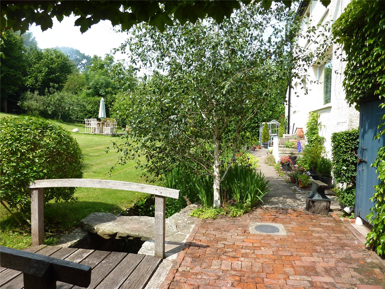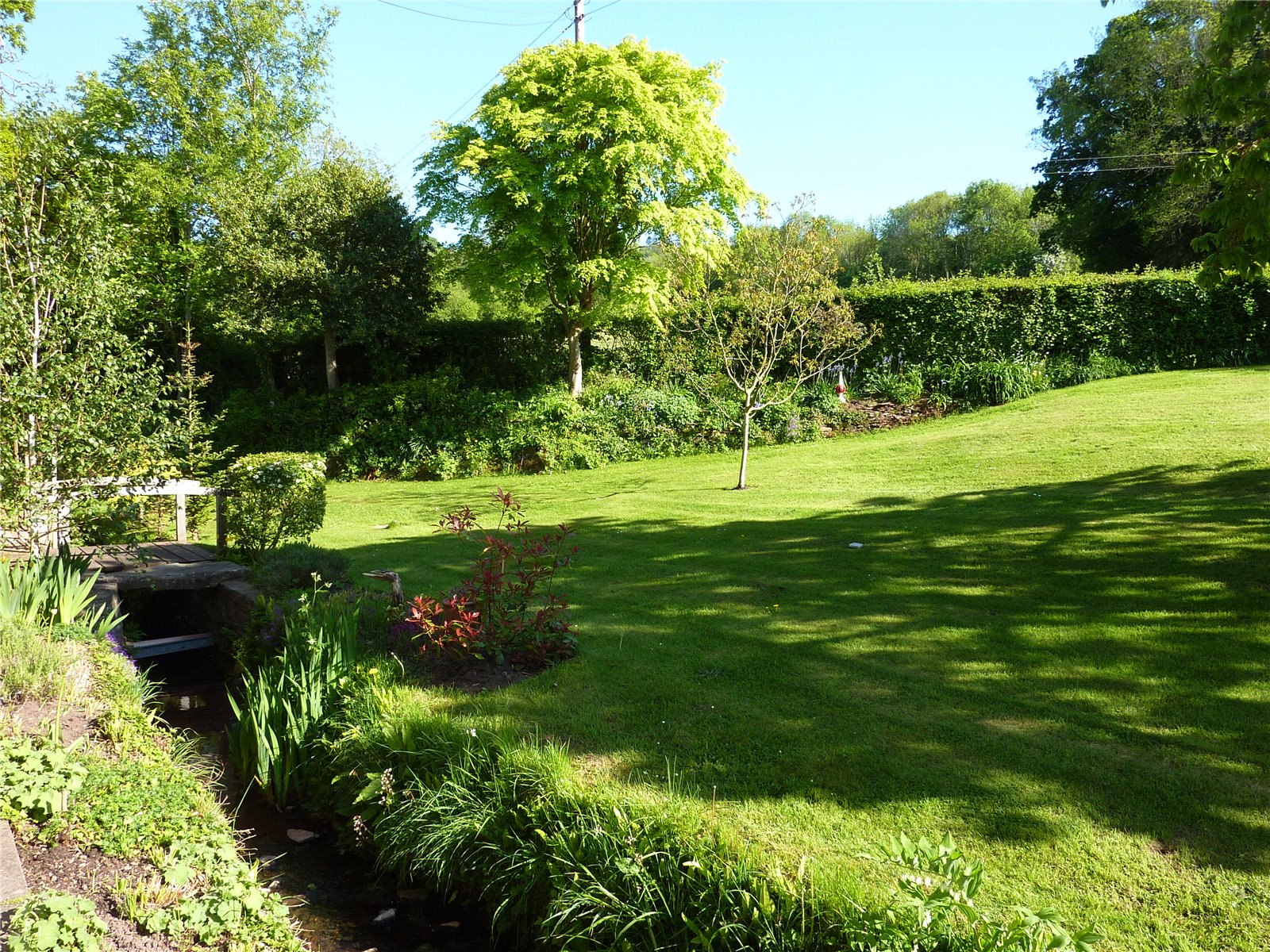 The property is approached via a gated driveway that leads down to the carport. A metal-framed garage/workshop is equipped with a wide up-and-over door, raised mezzanine storage, and a well-insulated workshop area, both benefiting from power and lighting. The garden is a standout feature, with most of it situated across the brook, accessible by a series of charming small bridges.