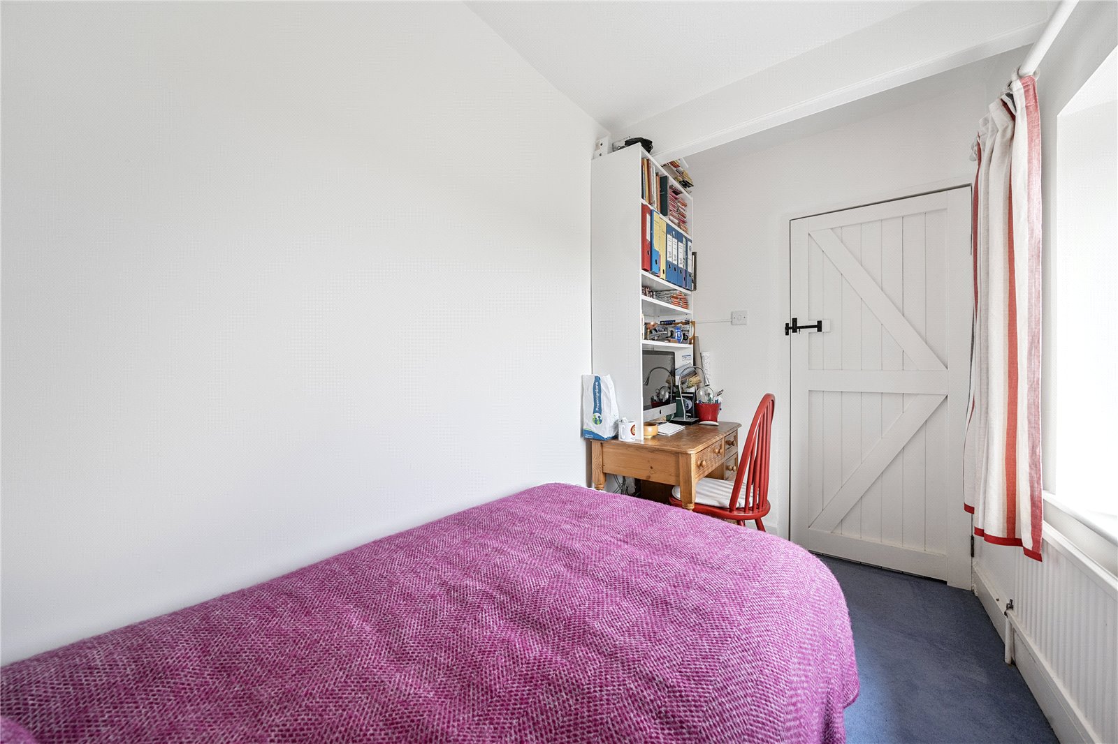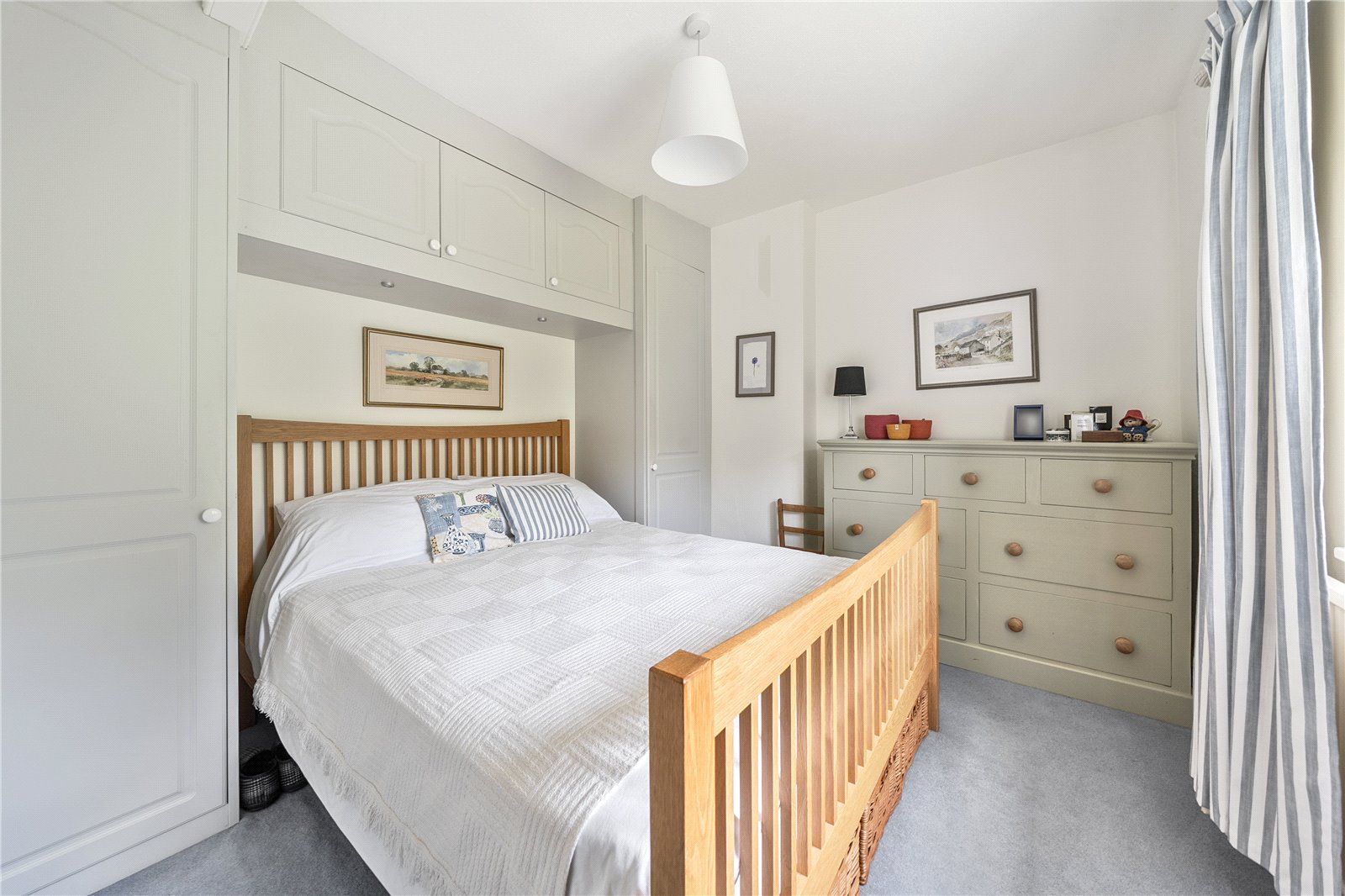 The staircase leads to a first-floor landing, where a window at the top brings in natural light. This landing provides access to two double bedrooms—one of which includes built-in cupboards—and a single bedroom. The family bathroom is also accessed from this floor, offering convenient and well-appointed accommodation.