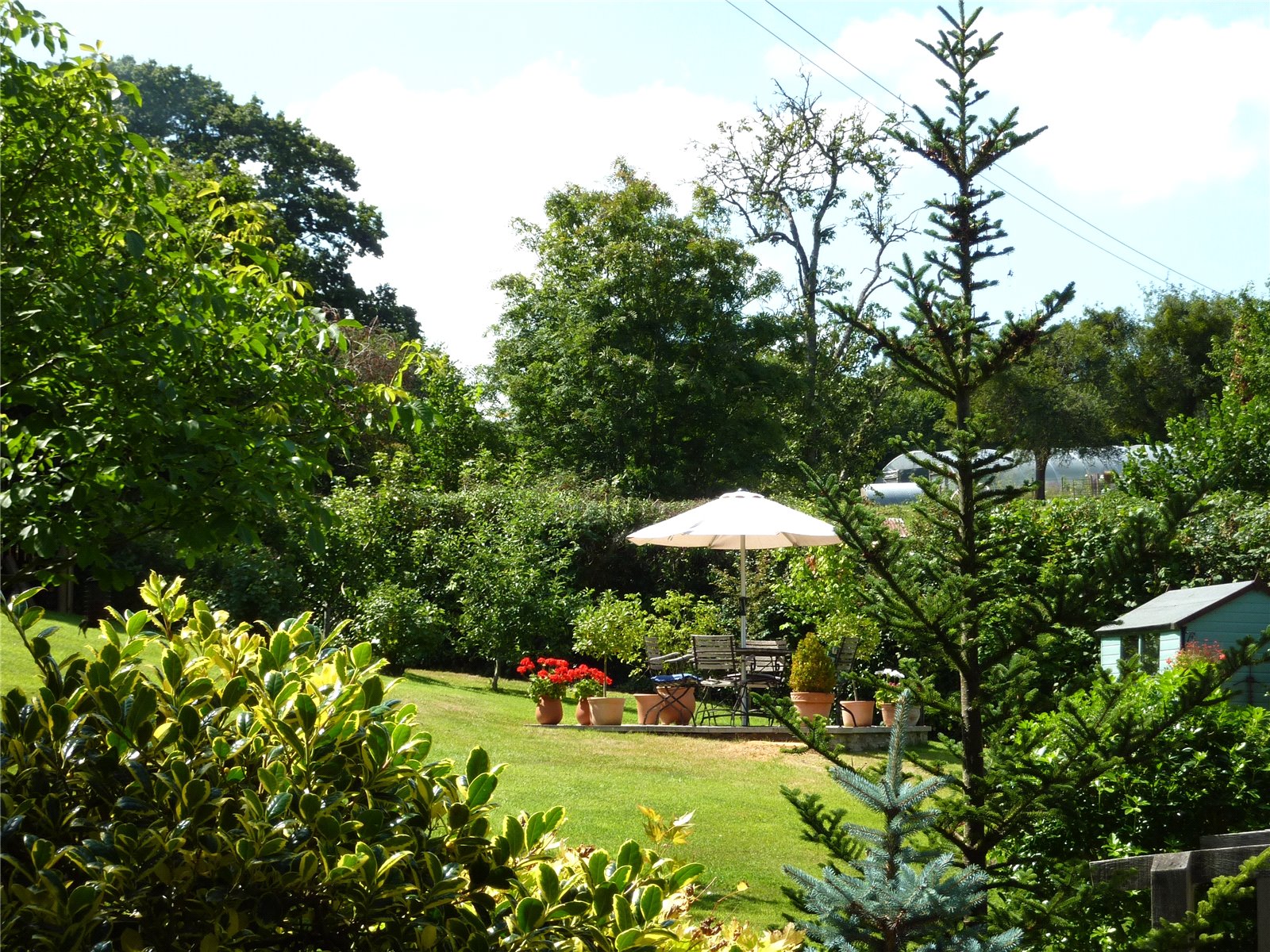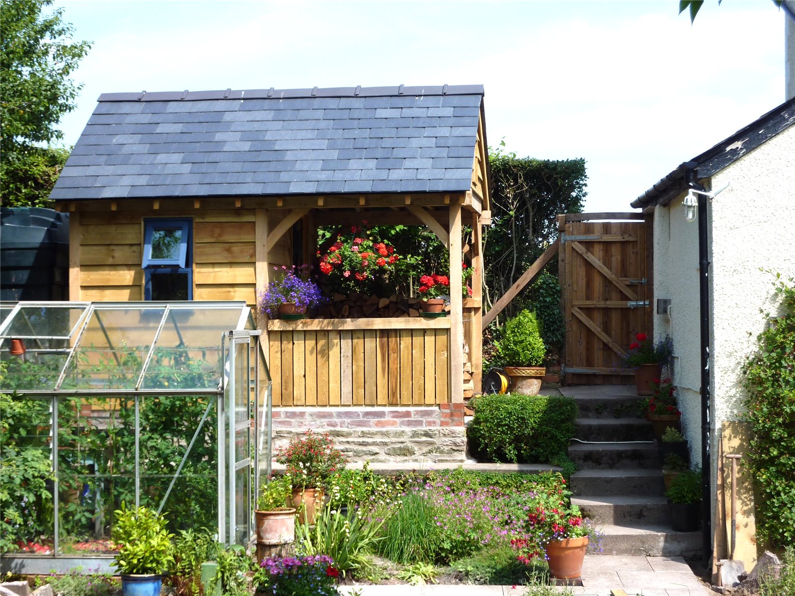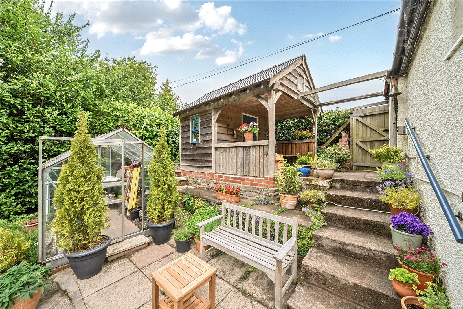 This expansive outdoor space includes an island patio seating area, providing a perfect spot for relaxation. Enclosed by mature hedges and dotted with mature trees, the garden also includes a timber shed, greenhouse, and a lovely oak framed storage building, ideal for garden enthusiasts.
