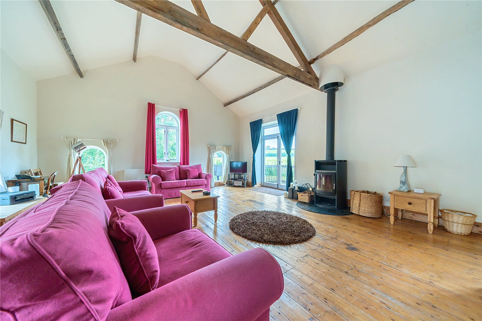 The front door opens into the kitchen/dining room, where vaulted ceilings, beautiful timber beams, and large arched windows flood the space with natural light. The well-equipped kitchen offers a range of units, and stairs lead up from this area to the living room. Here, more exposed timbers and abundant windows continue the light and airy feel. French doors open onto the deck, offering stunning views of the surrounding countryside. The living room also features a modern wood-burning stove, perfect for cozy winter evenings