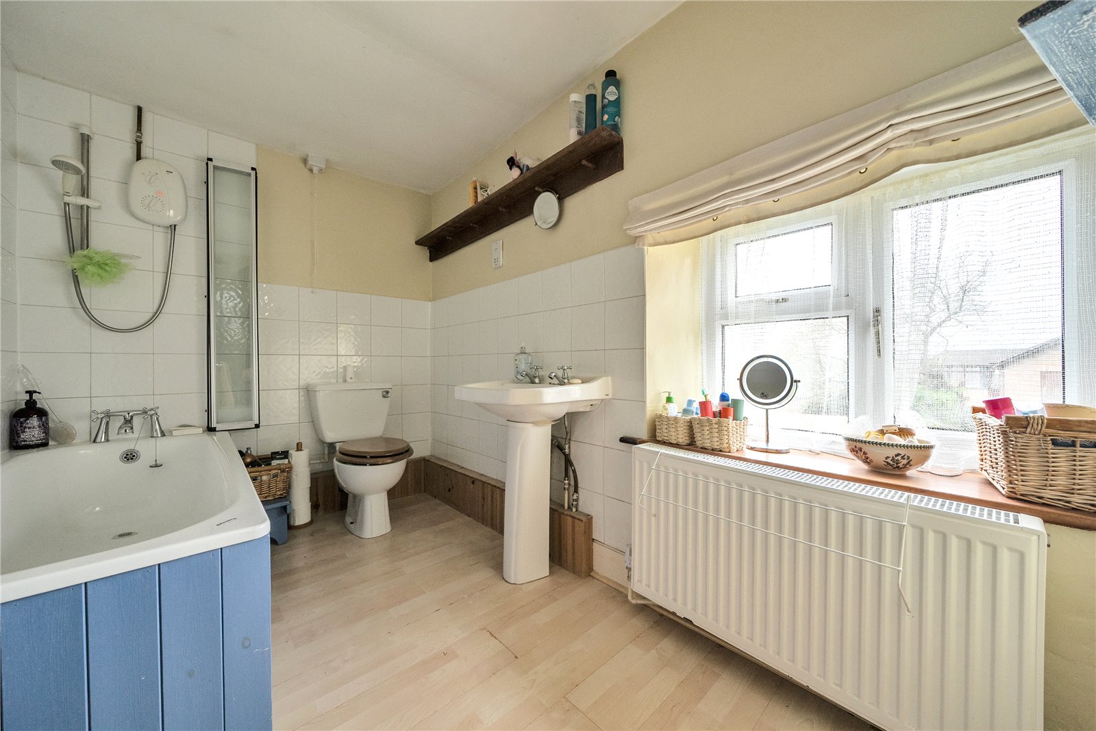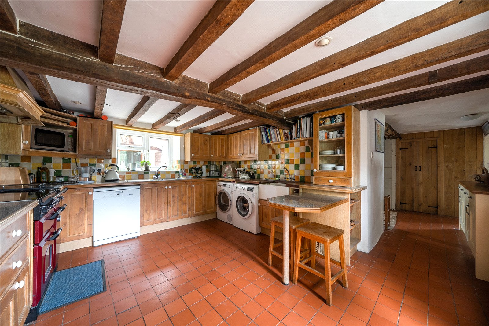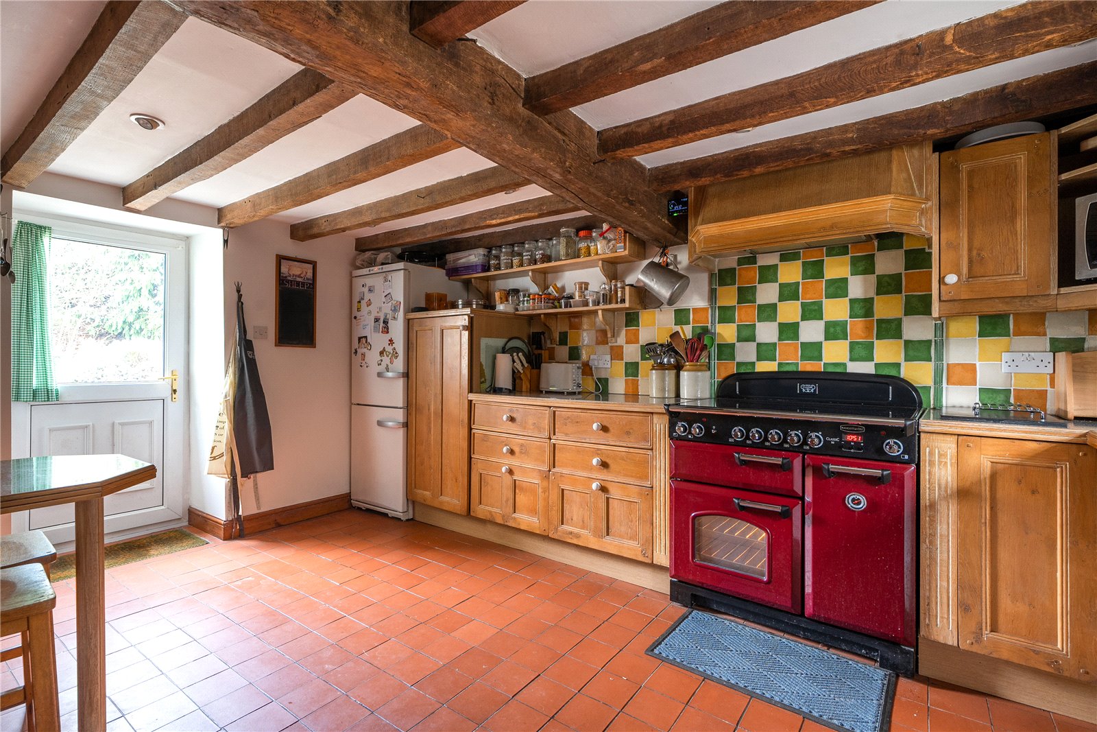 Straight ahead, the dining room boasts wainscoting, dual-aspect windows, and exposed beams retaining the old hooks, reflecting the home’s rich history. To the right of the entrance hall, the spacious kitchen features traditional quarry tiles, a range of fitted units, a Belfast sink, a Rangemaster cooker, and a recess for white goods. Exposed timbers enhance its rustic charm, with window and a door provide access to the rear garden