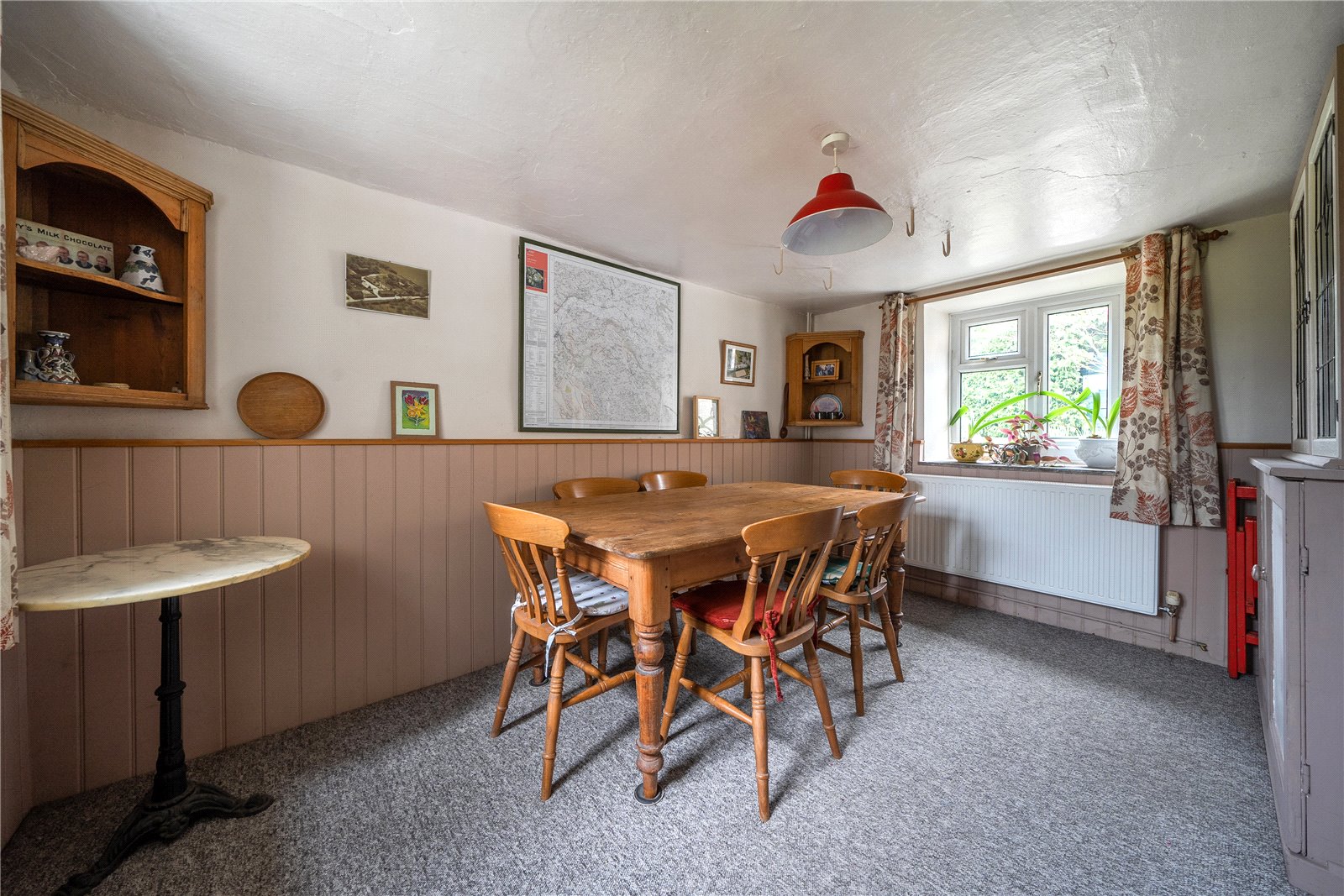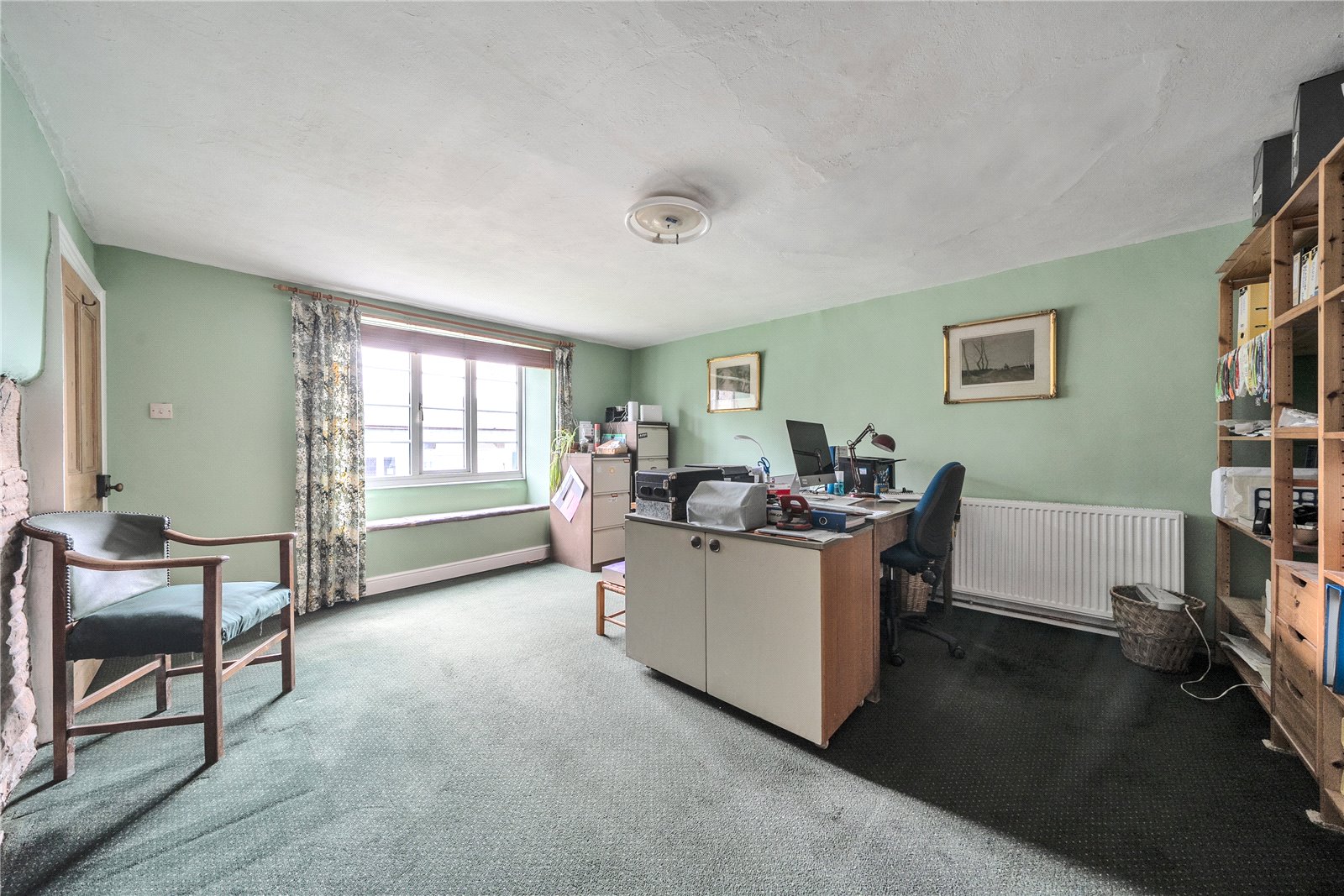 This charming space features a large and attractive inglenook fireplace with a cobbled hearth, a wooden lintel, and a wood-burning stove. The room benefits from dual-aspect windows, one of which includes a cozy window seat, adding to its character and warmth. To the right of the living room is a small room currently used as an office, providing a quiet workspace. To the left of the fireplace, a doorway leads into a spacious room, also used as an office, featuring a window with a stone sill, an exposed stone fireplace, and a wooden lintel, offering plenty of potential for alternative uses.