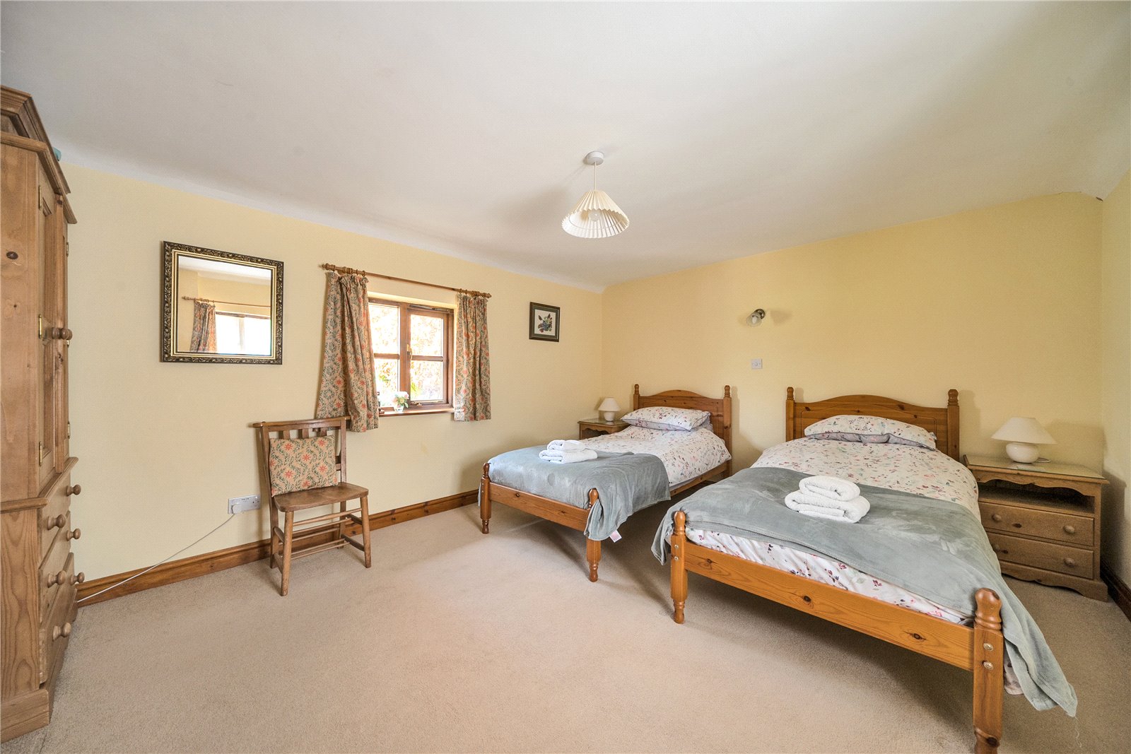 The front door opens into the entrance hall, which features a beautiful stained-glass window, built-in storage, and a further door leading into the open-plan living and kitchen area of the annexe. This charming space boasts exposed timbers, an exposed stone wall, and a Jotul fire set on a stone hearth, adding warmth and character. Natural light floods the room through four windows and a set of patio doors, which provide access to the outdoor space. The kitchen is well-equipped with a range of fitted units, offering both functionality and style. Following on from the kitchen area, an opening leads into bedroom one, which benefits from patio doors that open to the outside.