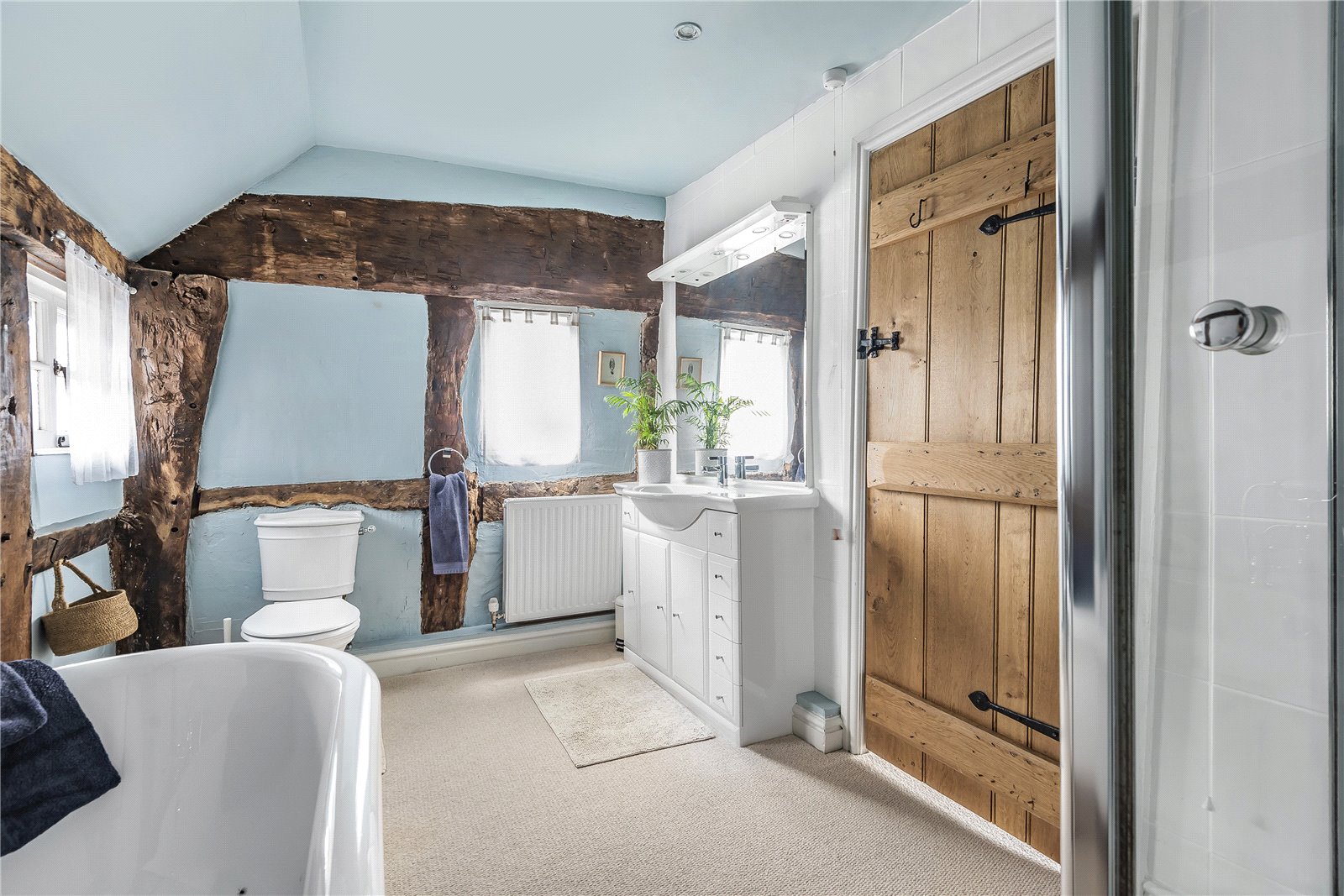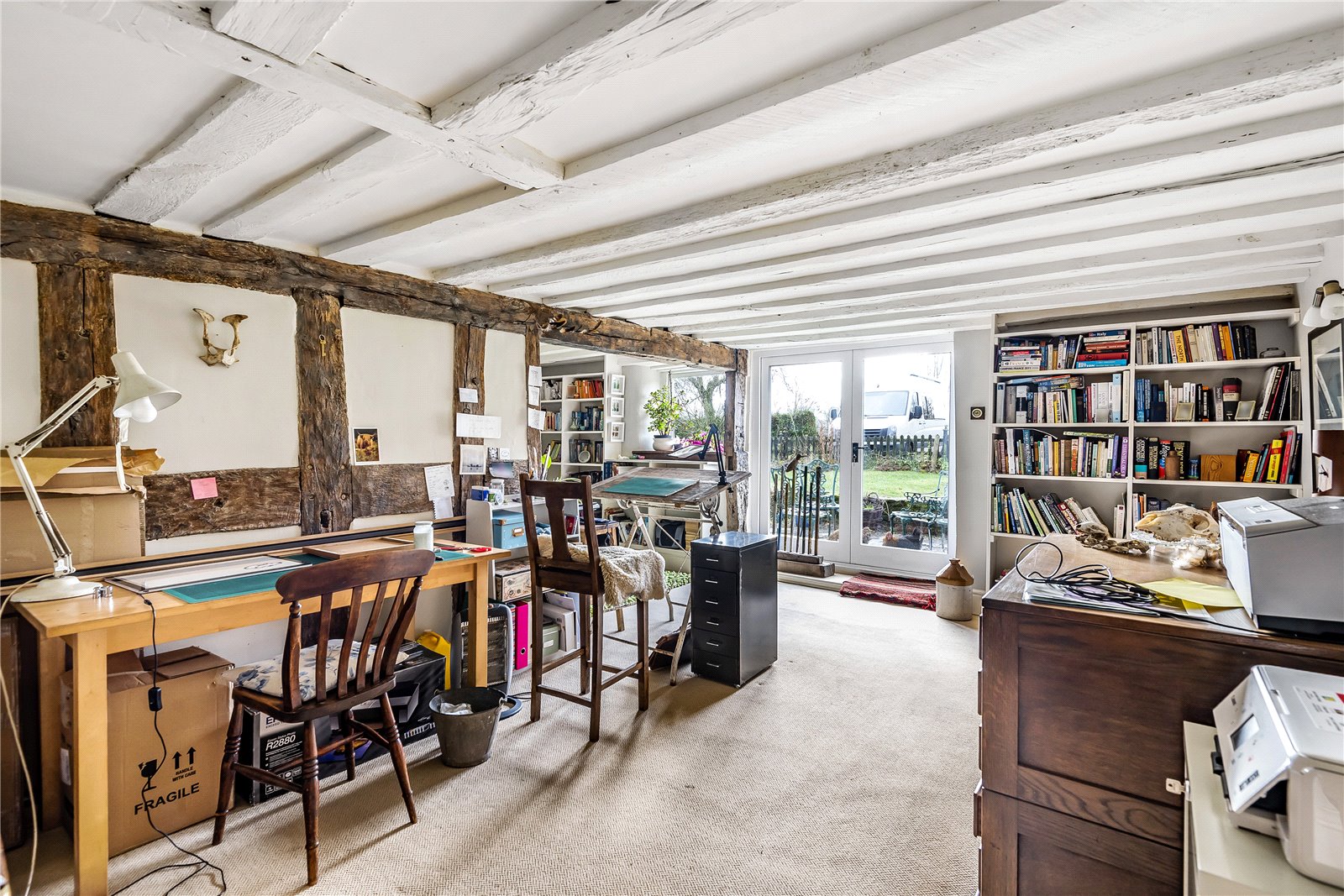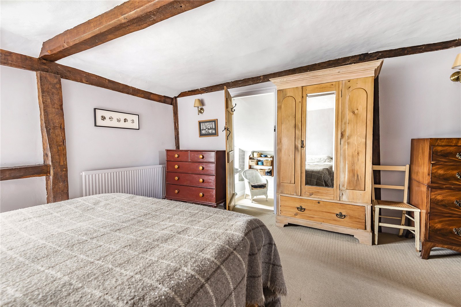 As you step through the timber panelled glazed door you are greeted by an inviting ambiance and a feeling of timeless charm. The windows facing east flood the space with natural light, casting a warm glow upon the flagged stone floor beneath your feet.Your journey begins in the foyer, where a sturdy ledge and brace timbered door welcomes you into the home. Here, revealed timbers to the walls and ceiling, offering a glimpse into the property's rich history and character with a staircase ascends to the first floor.To the right is the dining room, with bay windows facing east, framing views of the front garden and letting in natural light throughout the day. With revealed timbers both to the walls and ceiling and under the stair’s storage.