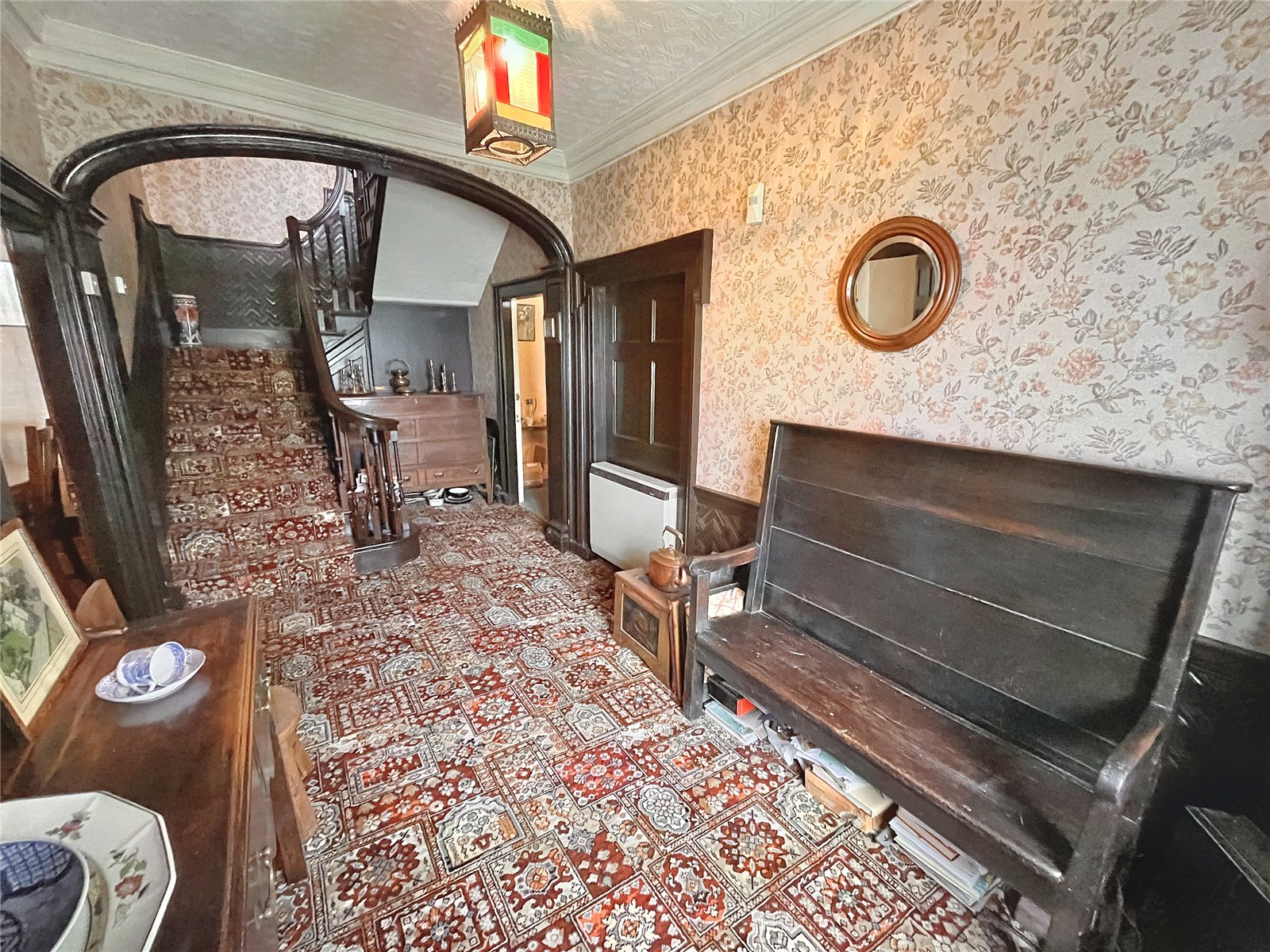 A private lawned garden with attractive wrought iron railings and pedestrian gate, provides access to the porticoed main entrance. The front door leads into the Main Hallway with attractive panelling and staircase to the first floor. To the right is a lovely Sitting room with a wood burning stove and a bay sash window. On the opposite side of the Hallway is the Living/Dining Room with a bay sash window, attractive wooden fire surround with electric fire.
