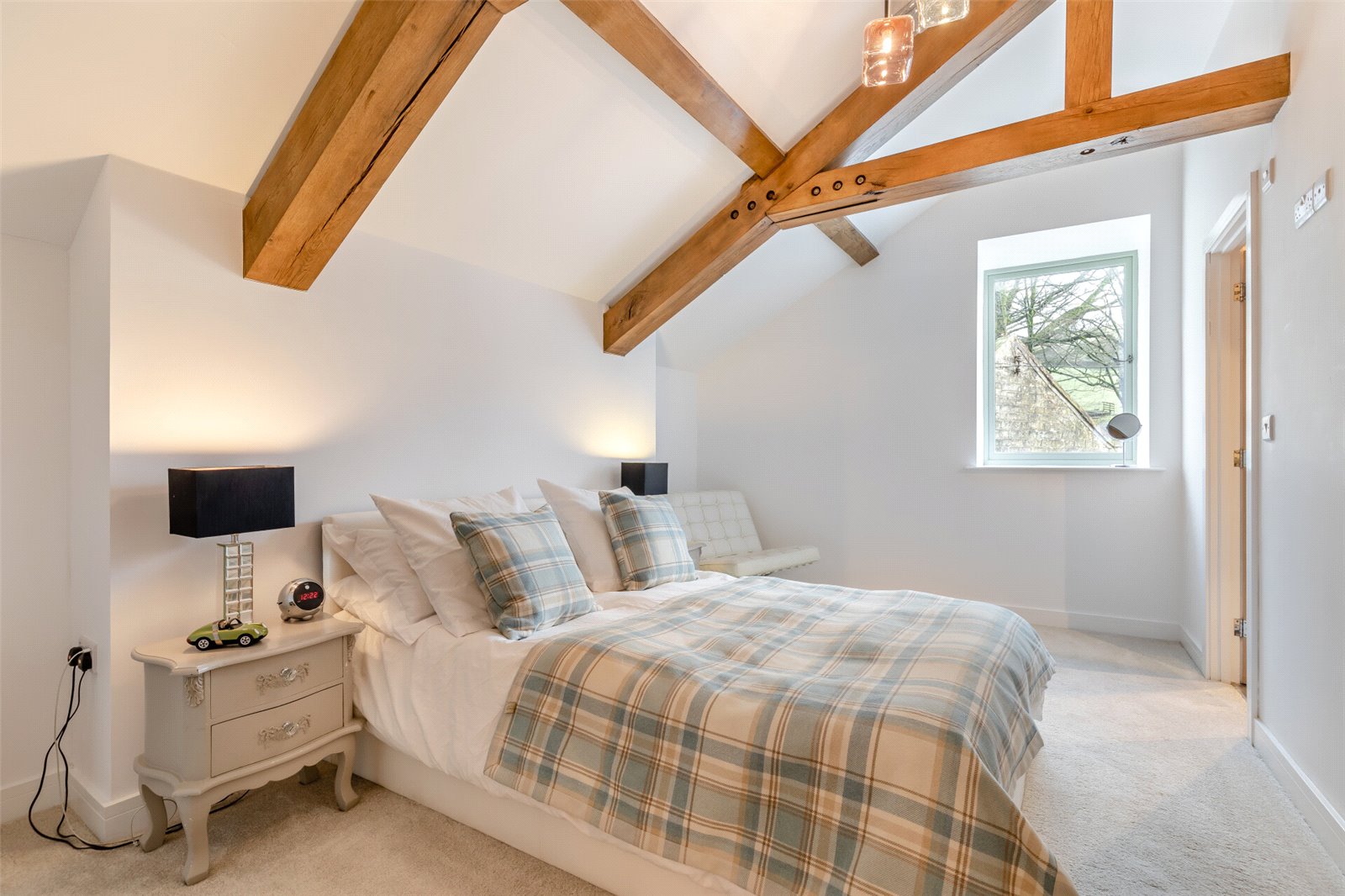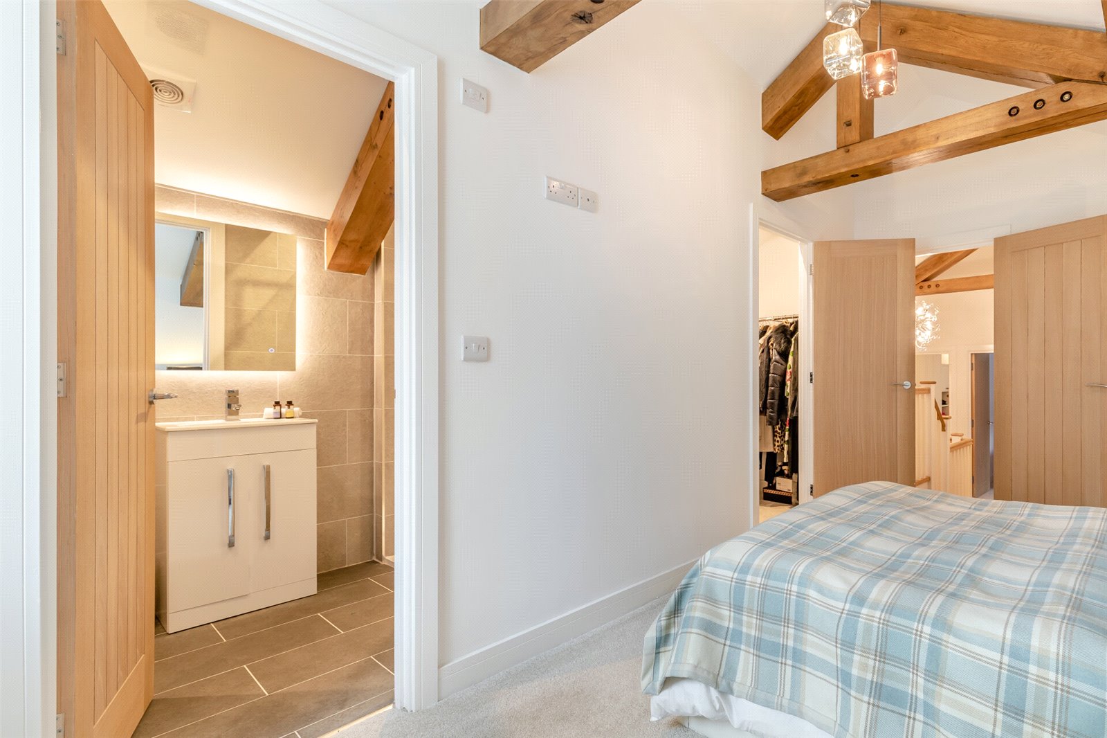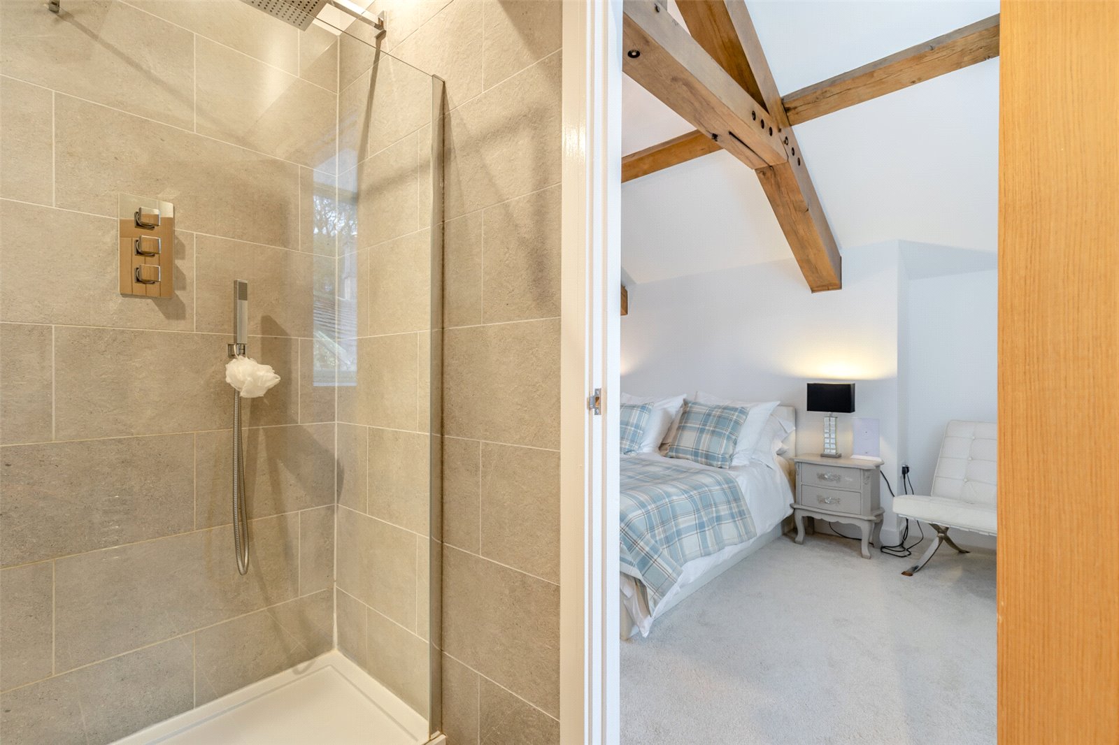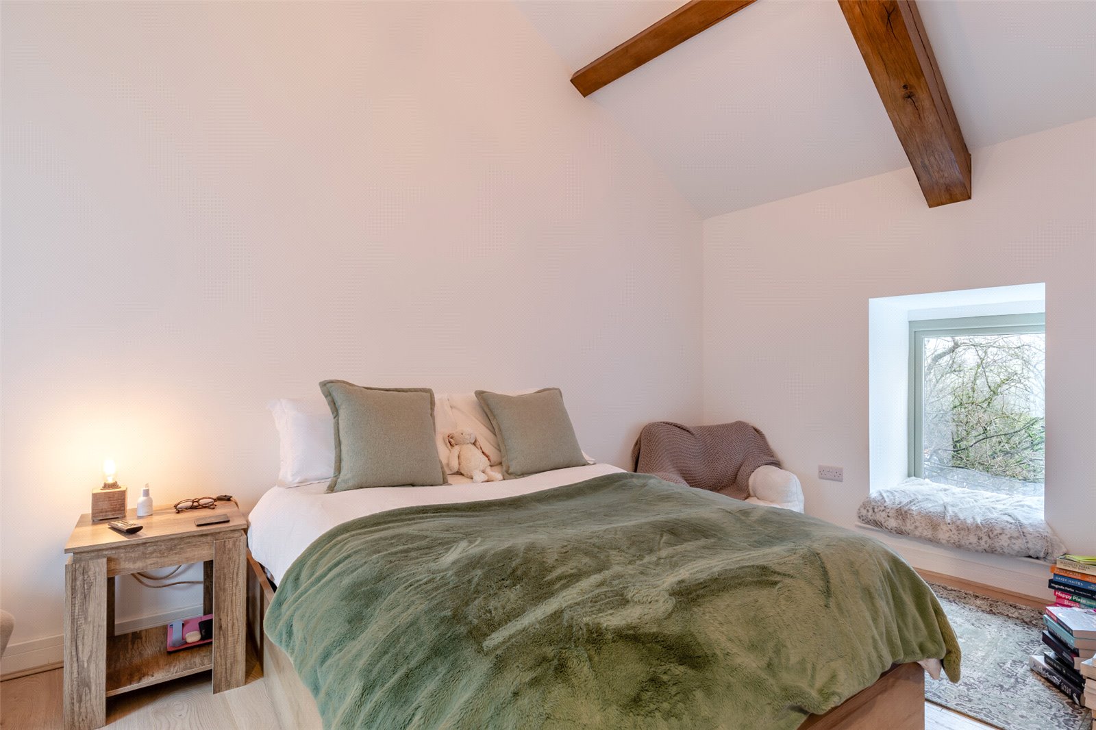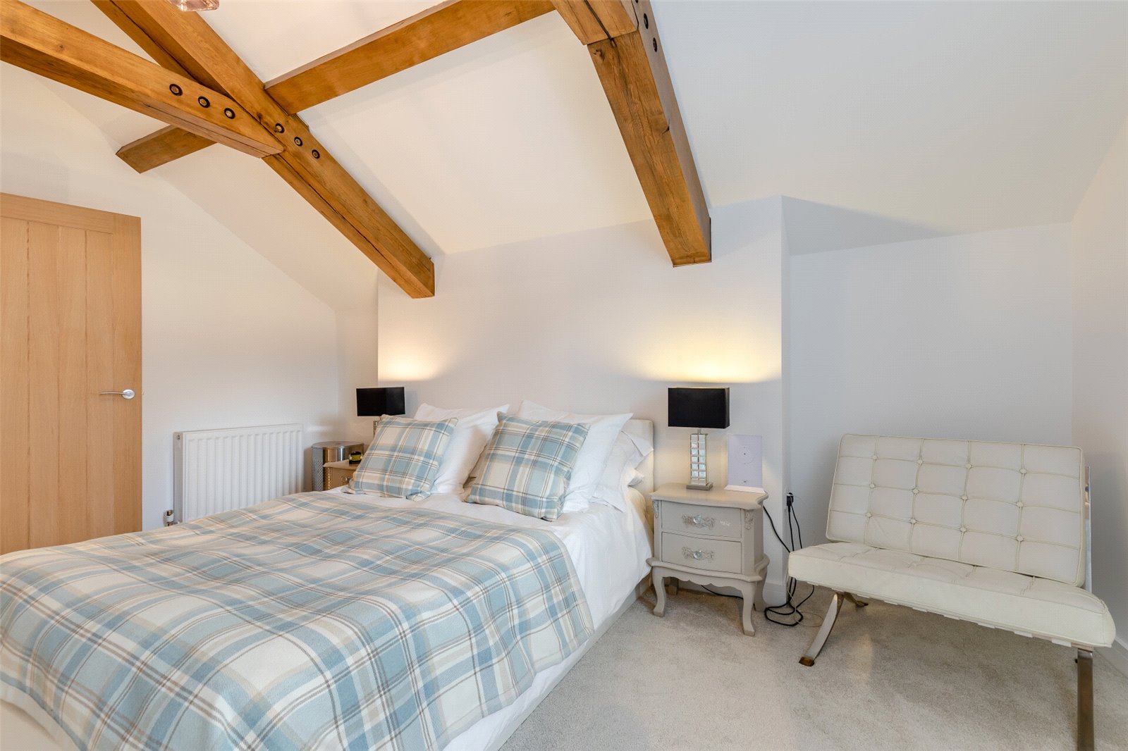 The master suite features striking wooden beams, a walk-in wardrobe, and an en-suite shower room. The second and third bedrooms also boast striking wooden beams and picturesque views. The family bathroom, with its luxurious walk-in shower and freestanding bath, provides a tranquil oasis for rejuvenation.