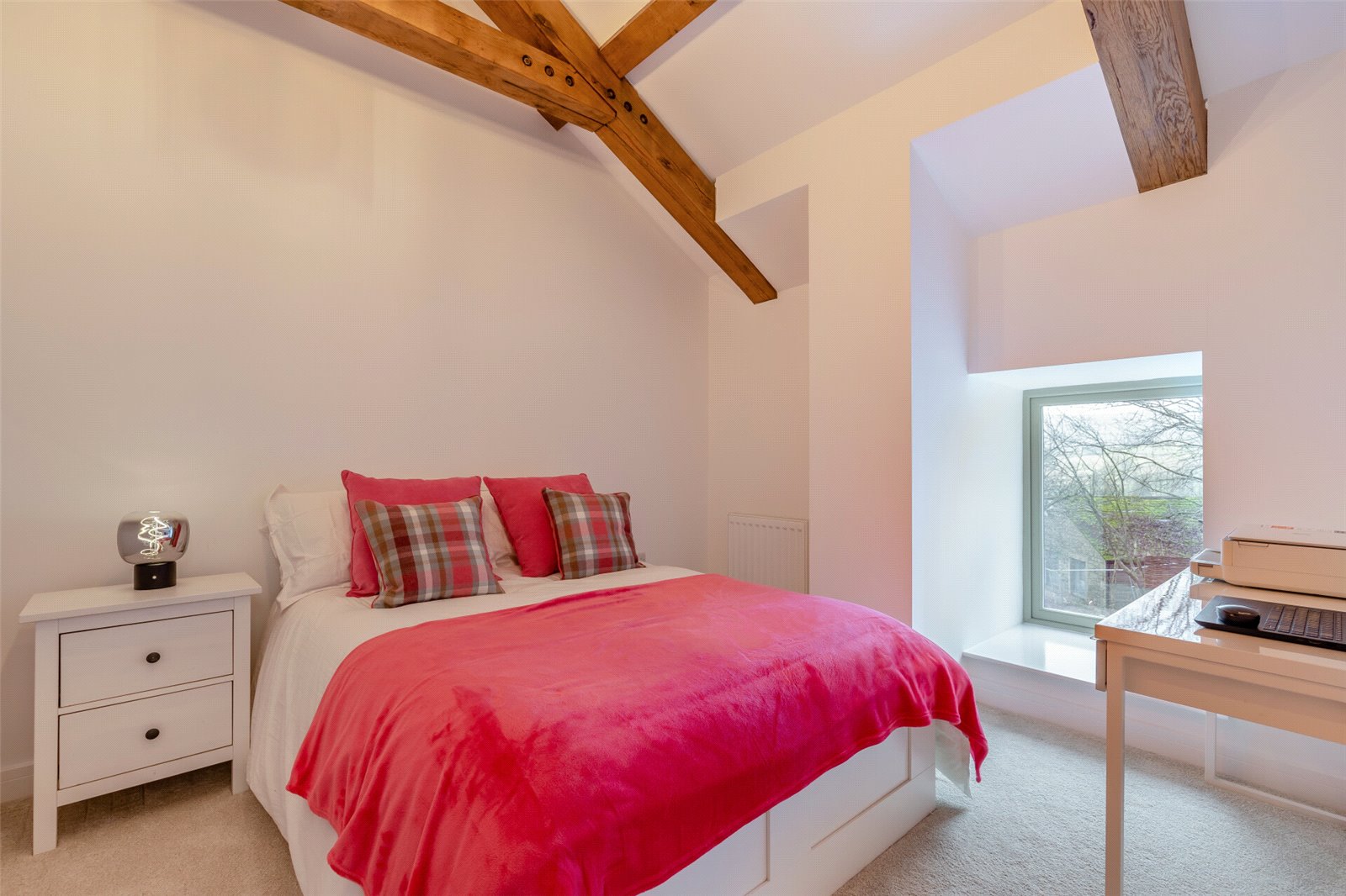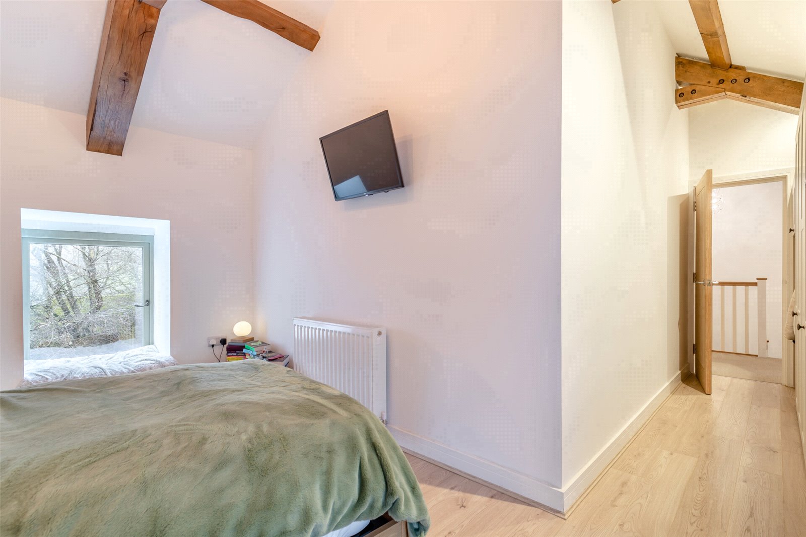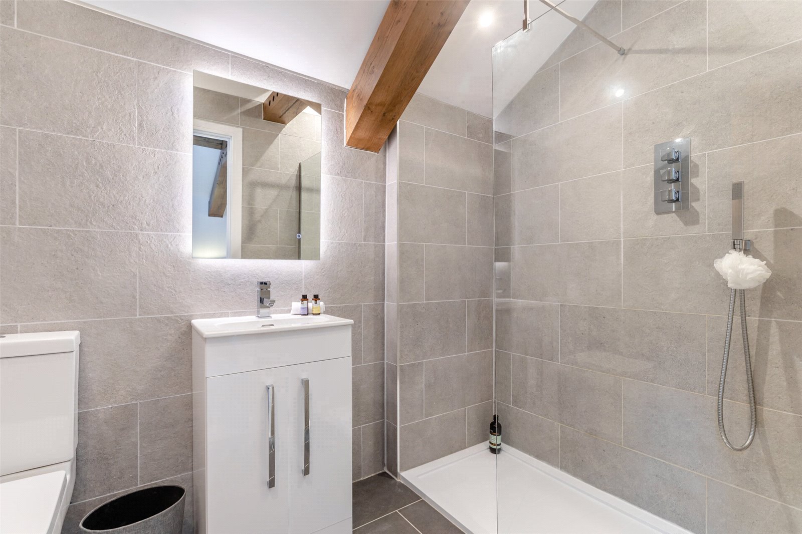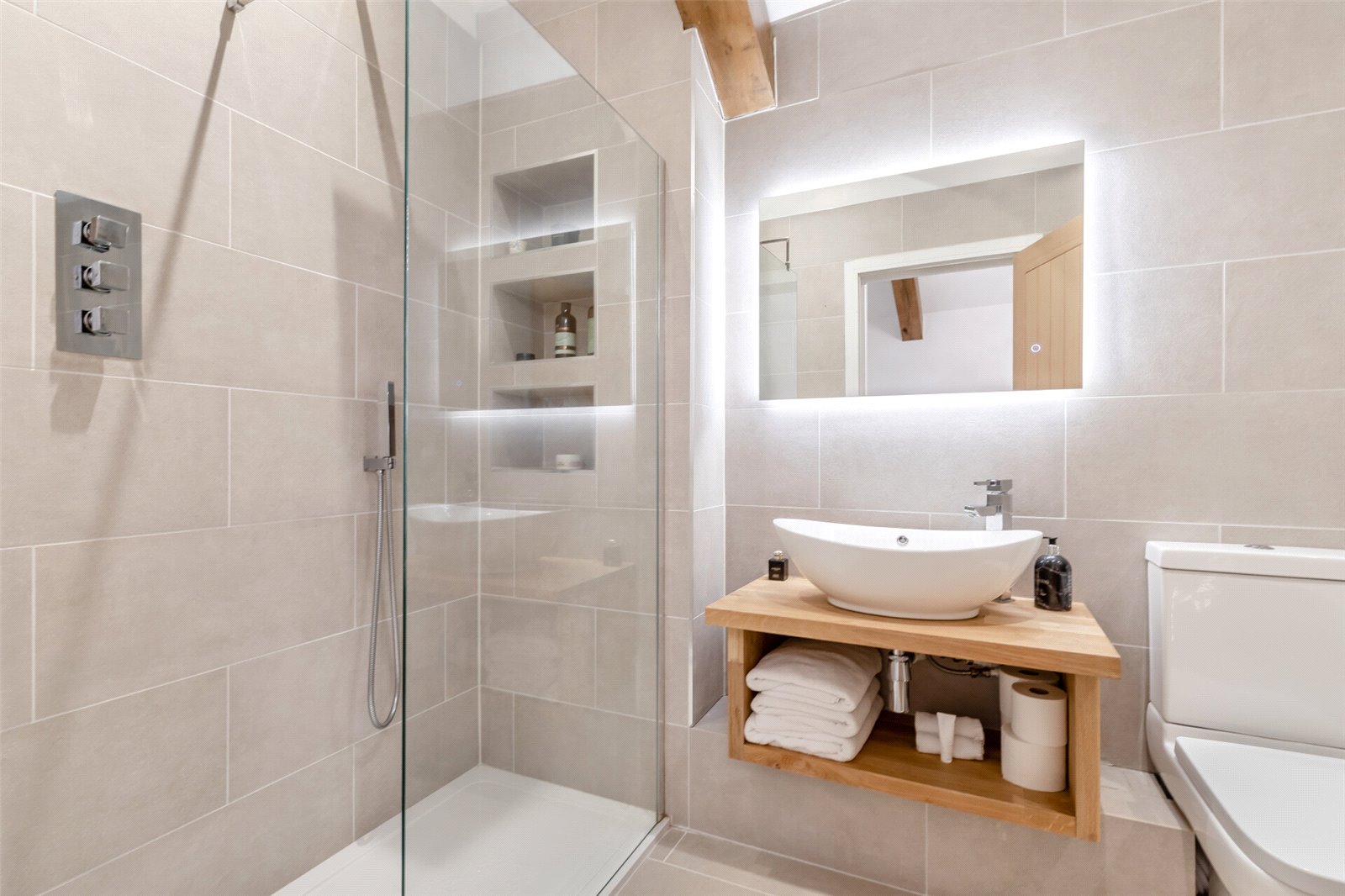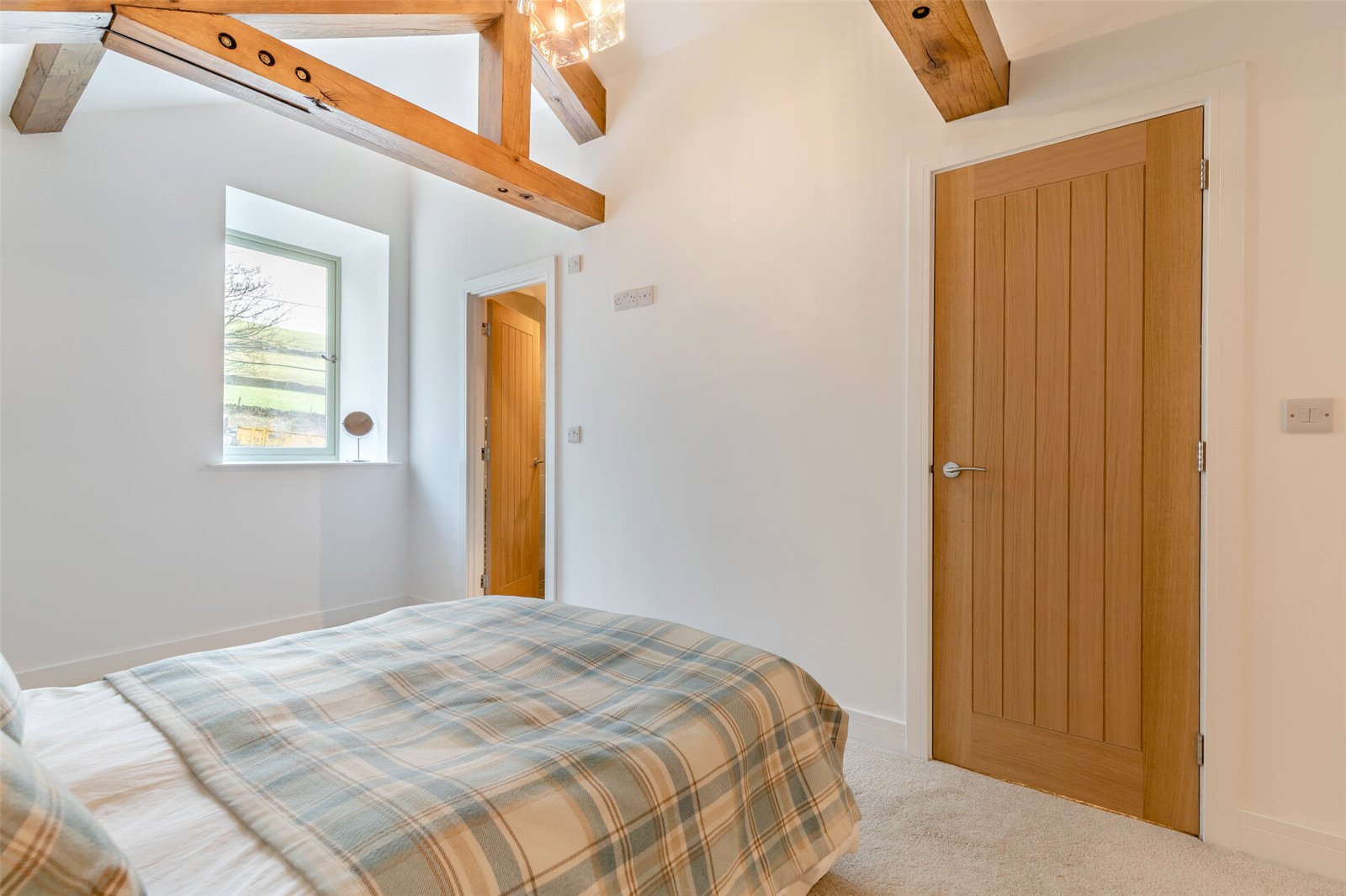 The master suite features striking wooden beams, a walk-in wardrobe, and an en-suite shower room. The second and third bedrooms also boast striking wooden beams and picturesque views. The family bathroom, with its luxurious walk-in shower and freestanding bath, provides a tranquil oasis for rejuvenation.