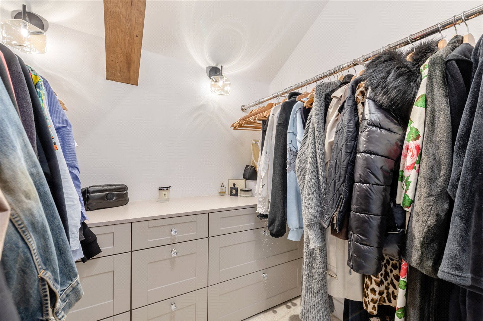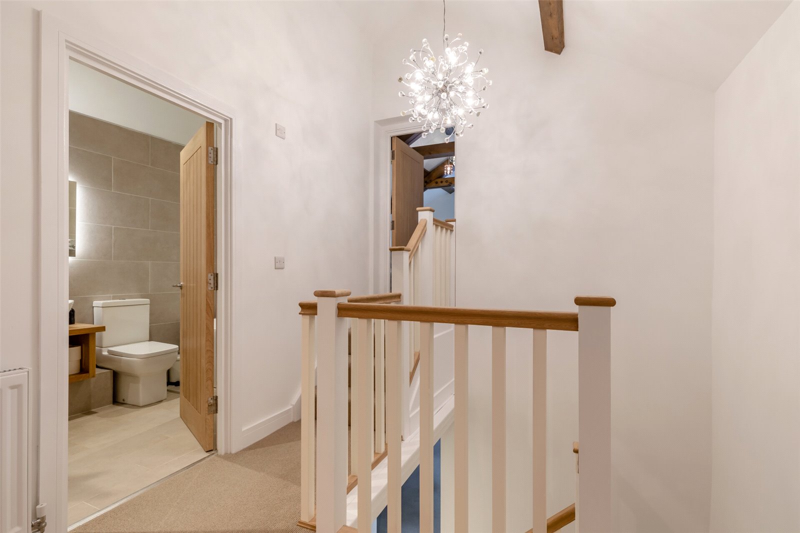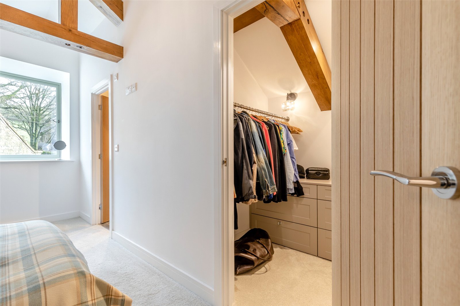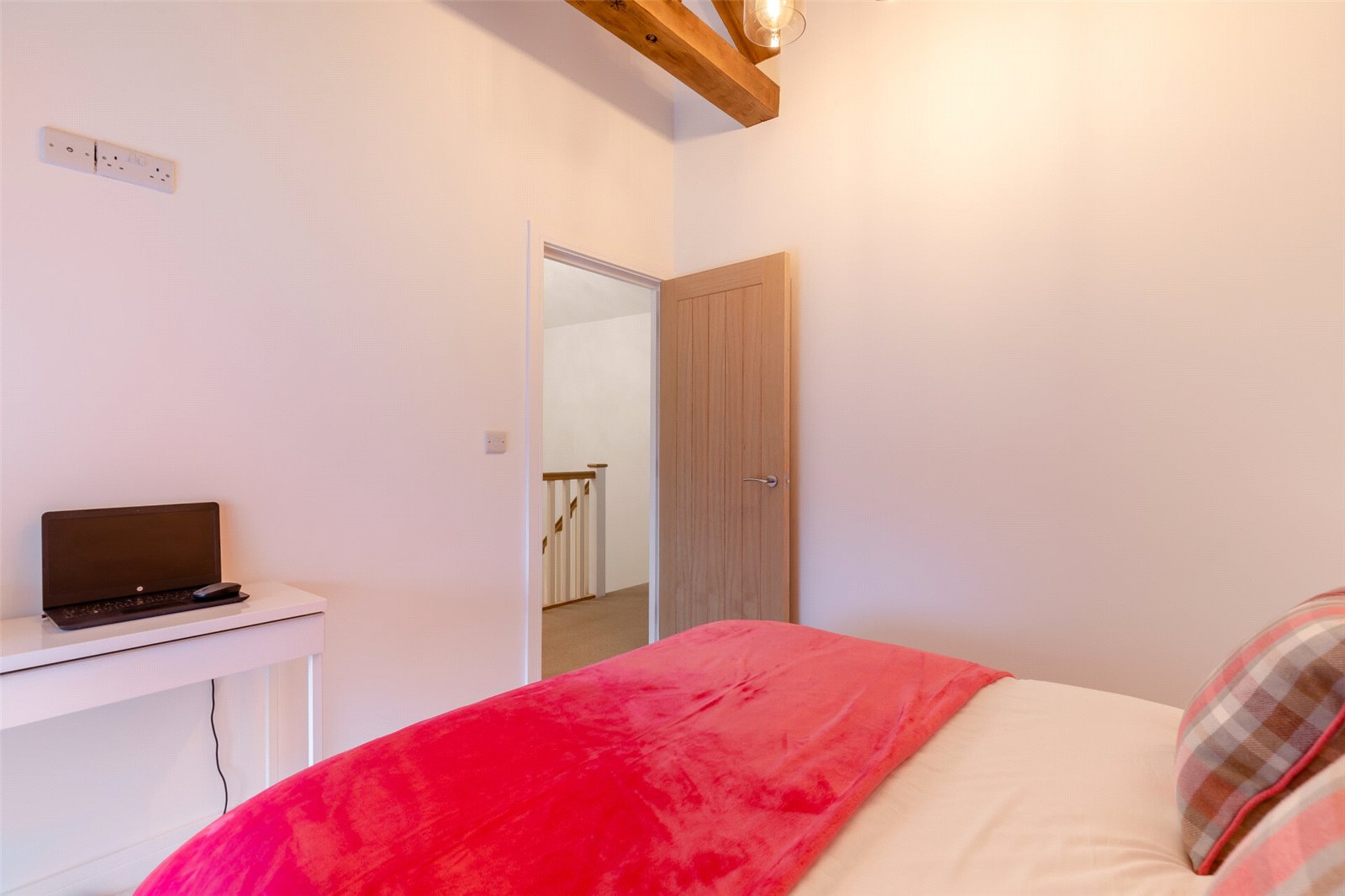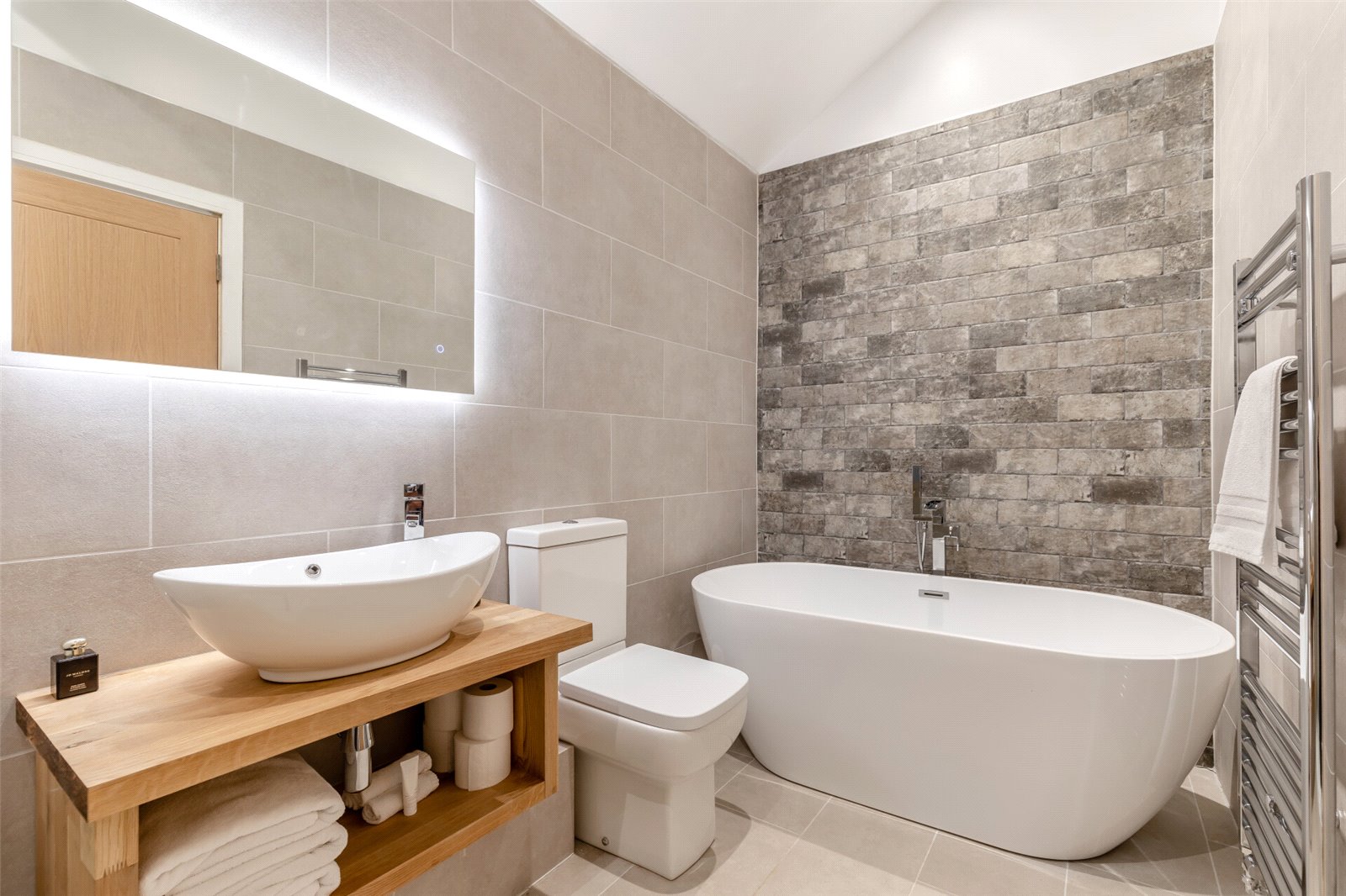 The master suite features striking wooden beams, a walk-in wardrobe, and an en-suite shower room. The second and third bedrooms also boast striking wooden beams and picturesque views. The family bathroom, with its luxurious walk-in shower and freestanding bath, provides a tranquil oasis for rejuvenation.