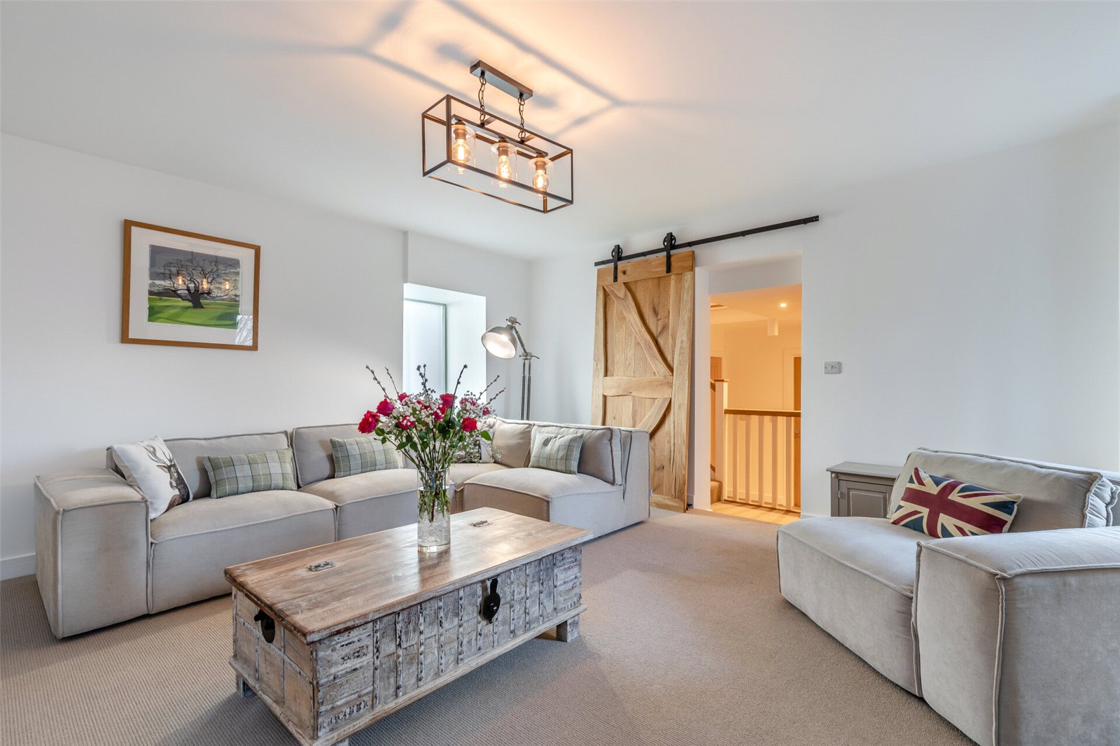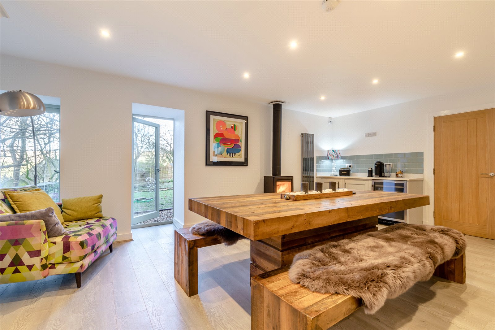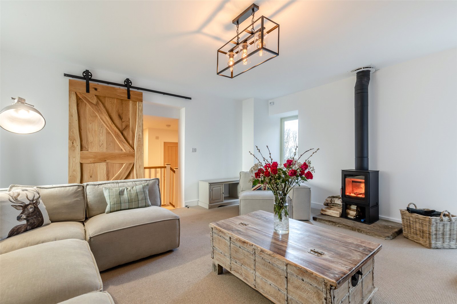 Step inside and be greeted by a welcoming entrance hall, where laminate flooring flows beneath your feet, leading you towards the heart of the home. The spacious living room, bathed in natural light from both front and rear aspect windows, invites relaxation. A crackling log burner adds warmth and ambience, while a stylish barn door adds a touch of rustic elegance.