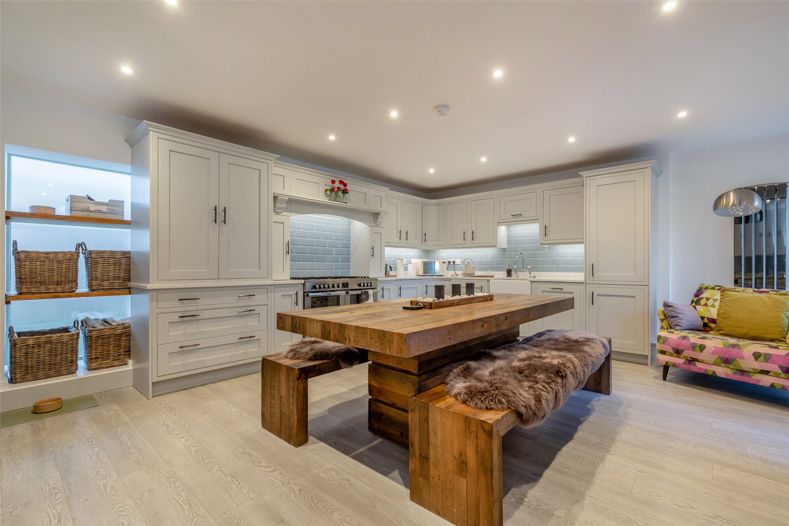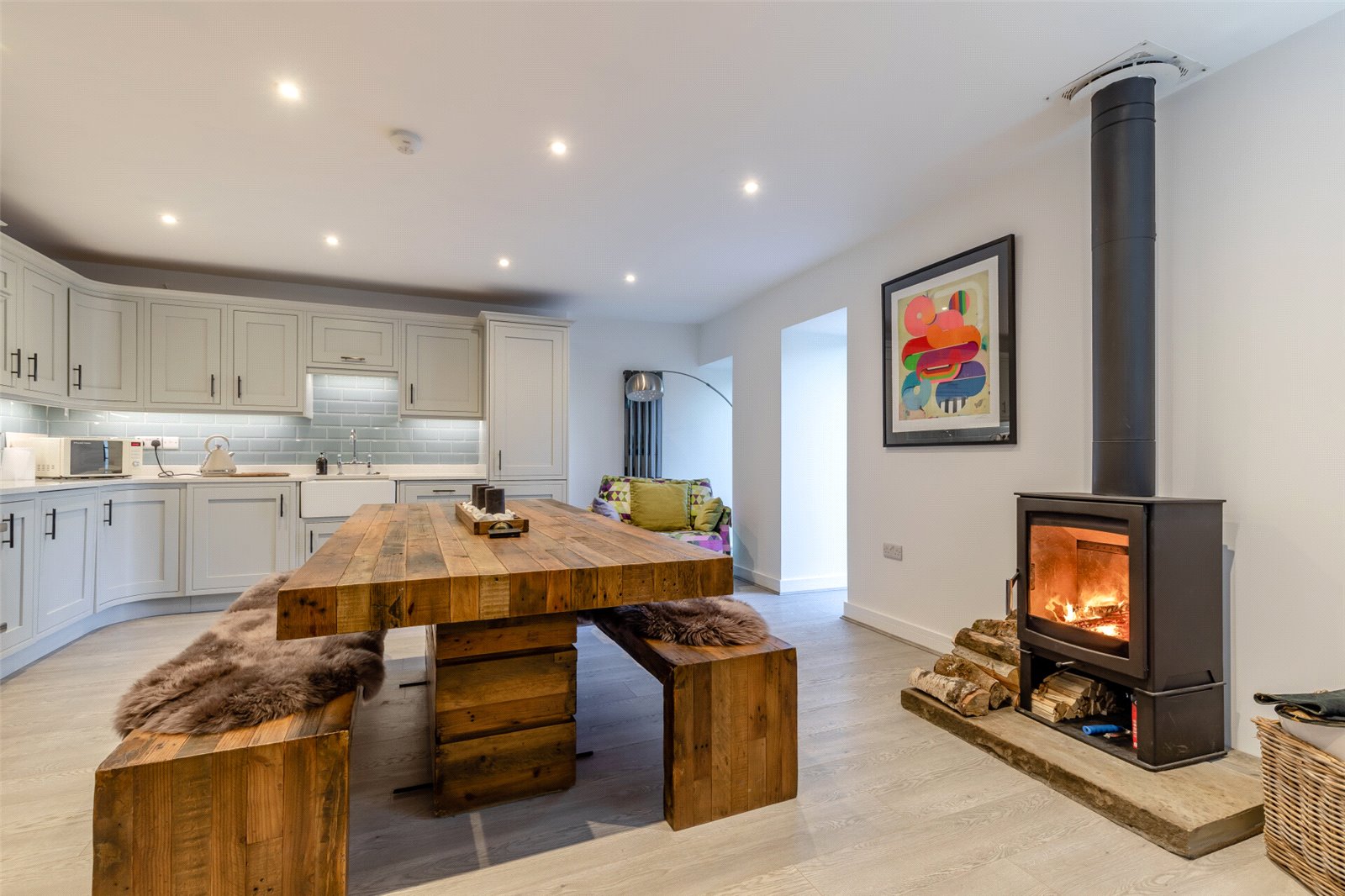 The kitchen/diner is a culinary haven, boasting ample storage space and a range of integrated appliances, including a Belling cooker with an 8-burner hob and double oven. A second log burner creates a cosy atmosphere, perfect for entertaining guests or enjoying a leisurely meal.