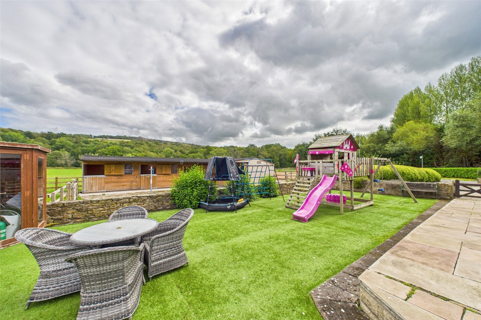 The rear of the property features a large paved patio, ideal for alfresco dining and summer get-togethers. The garden, with its mix of lush grass and low-maintenance artificial turf, is a family-friendly space complete with a delightful play area. This home offers the best of both worlds: a peaceful, rural retreat that's perfectly set up for family life and a serious equestrian pursuit.