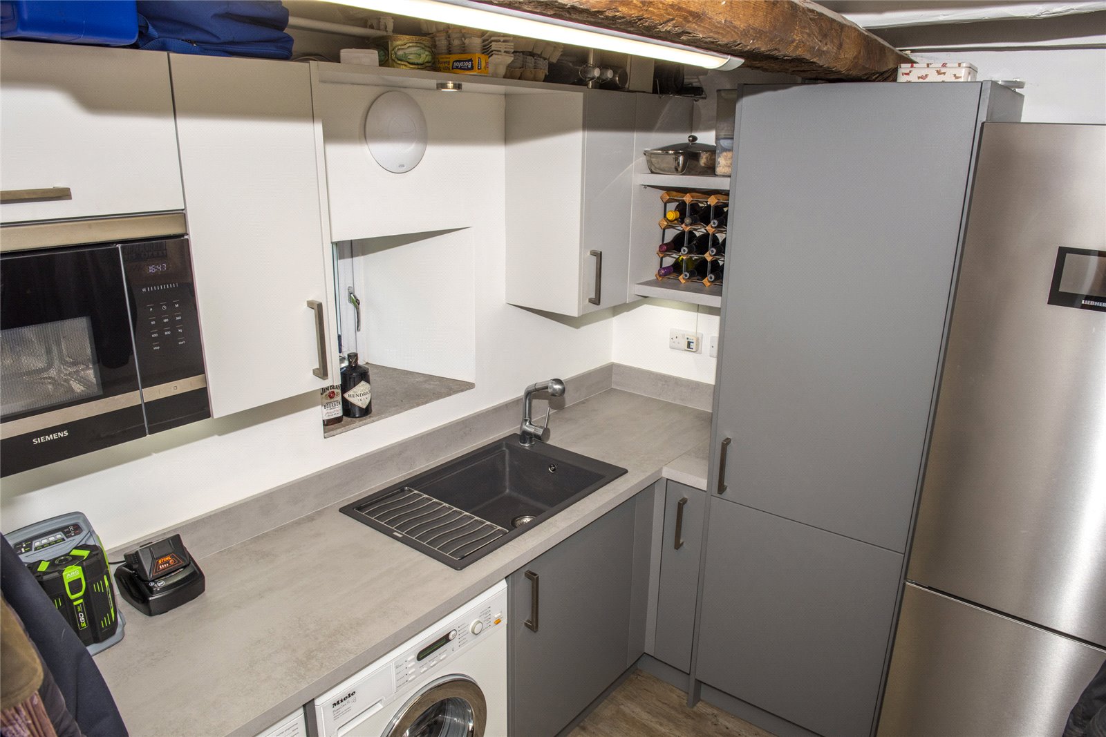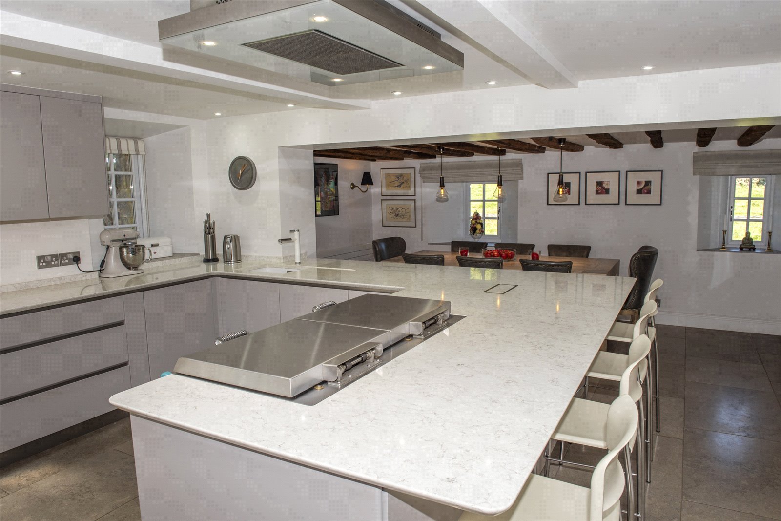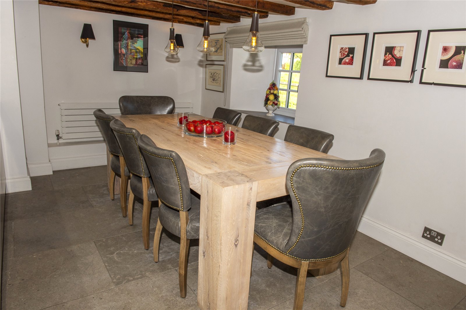 The modern kitchen, equipped with dual-aspect windows, stone countertops, and a striking Everhot cooker, is a chef's dream. The adjacent dining area, with its exposed beams, provides a welcoming space for entertaining guests. A convenient and practical utility room is a great extension of the kitchen.