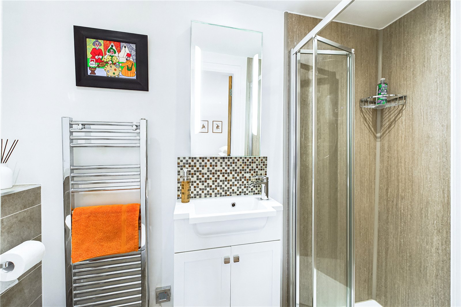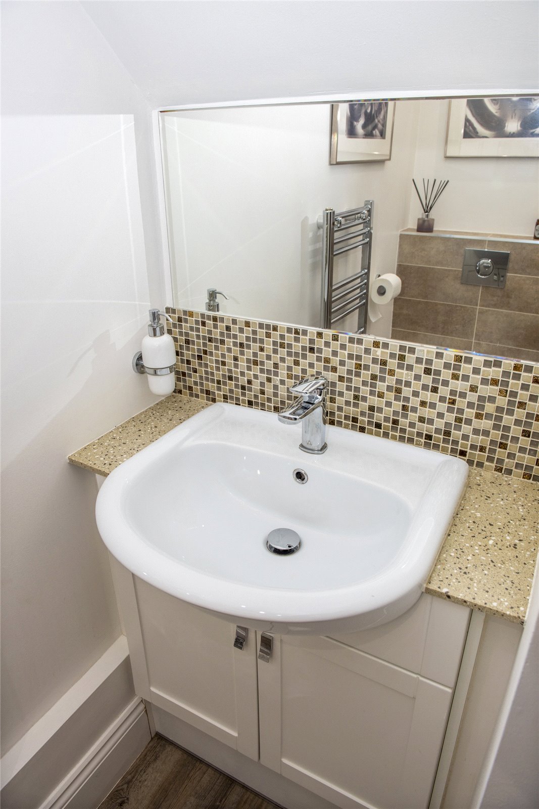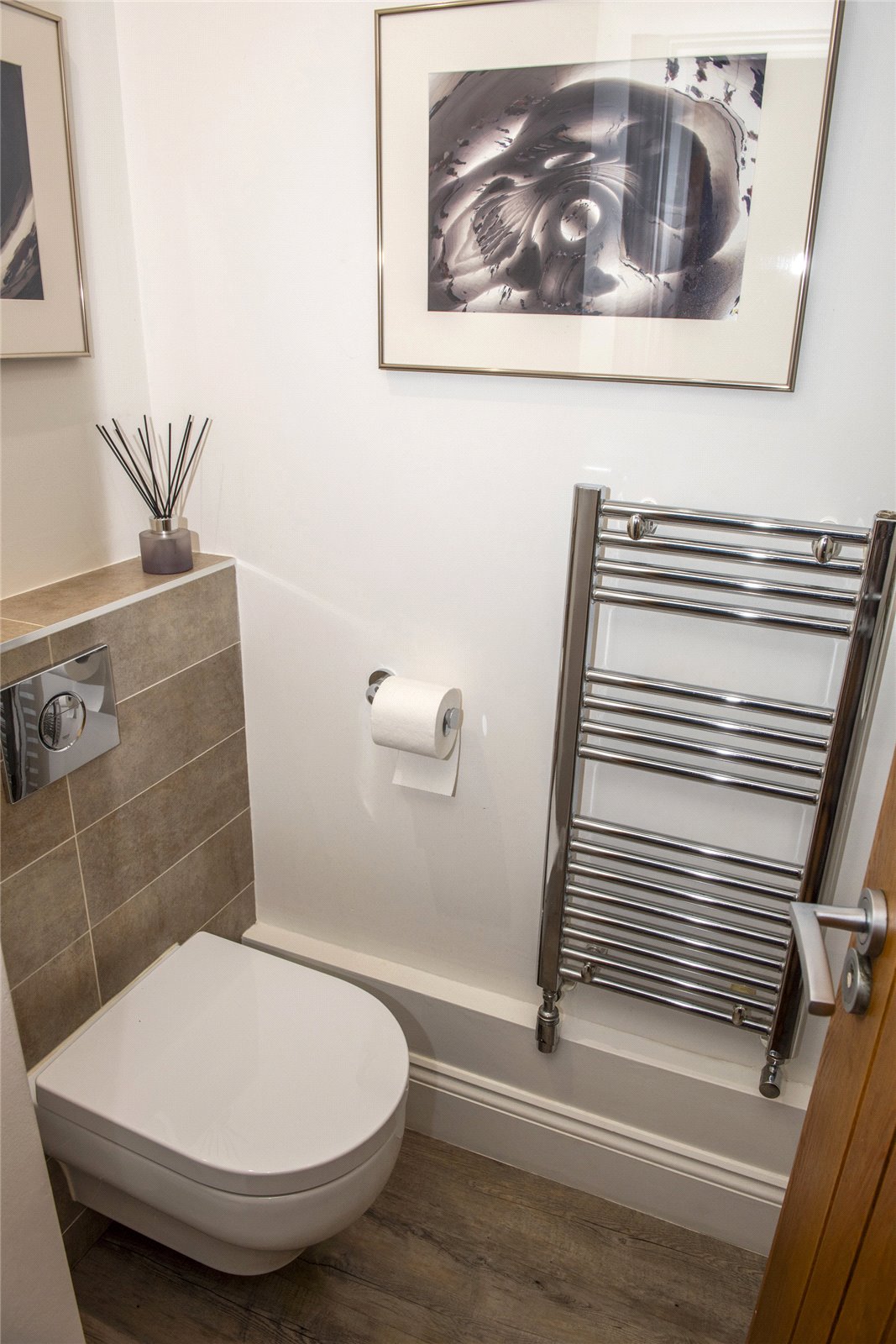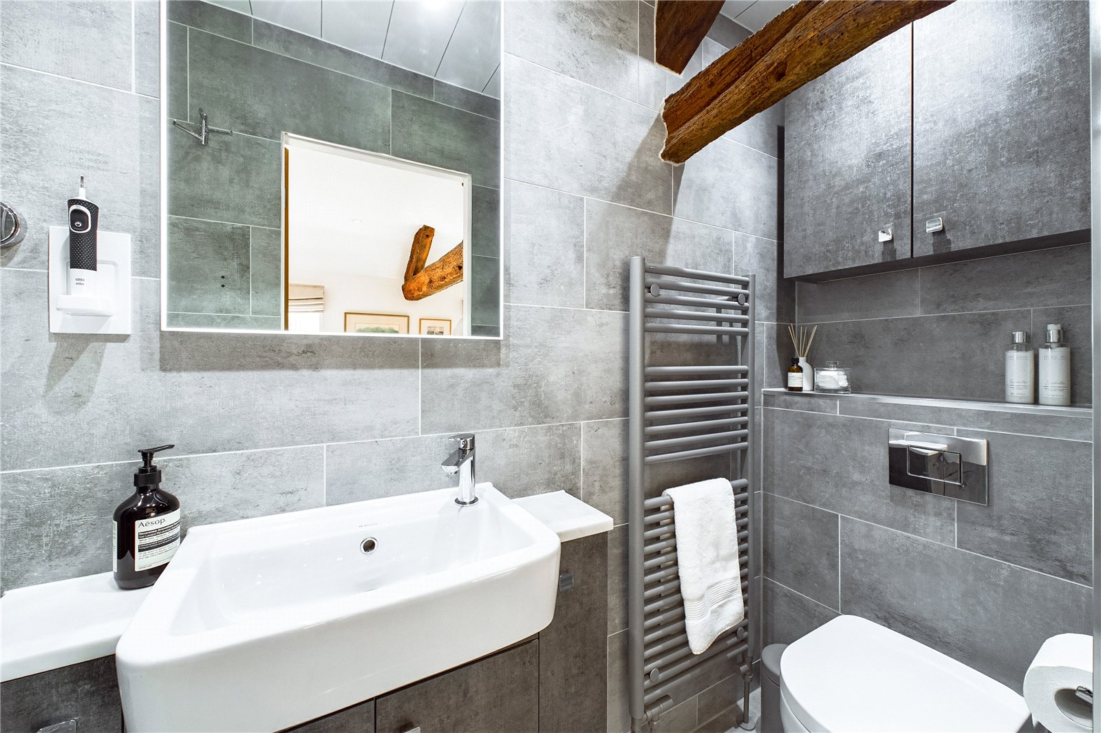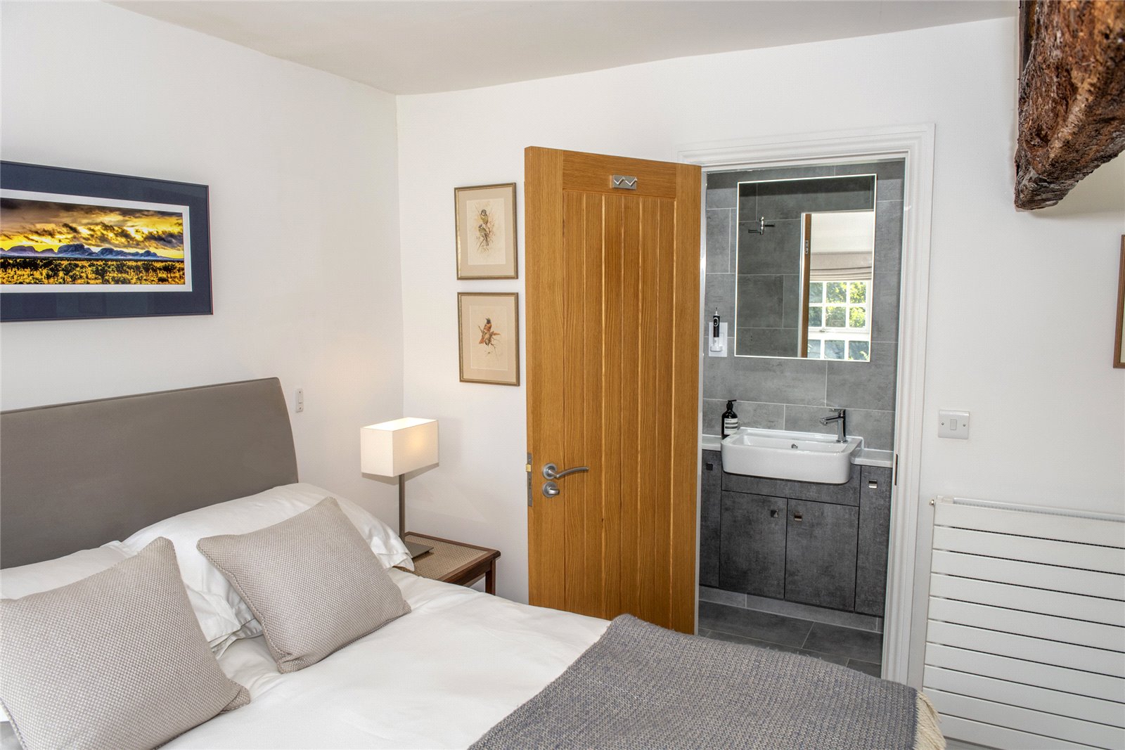 Upstairs, the bedrooms offer a peaceful retreat from the living areas. Three of the bedrooms are carpeted and feature en-suite facilities and built-in wardrobes, ensuring privacy and convenience. The master bedroom, with its striking wooden beams, has a luxurious en-suite shower room, while the fourth bedroom currently serves as a home study. The family bathroom, with its tiled walls, heated towel rail and vaulted ceiling, provides a spa-like experience.