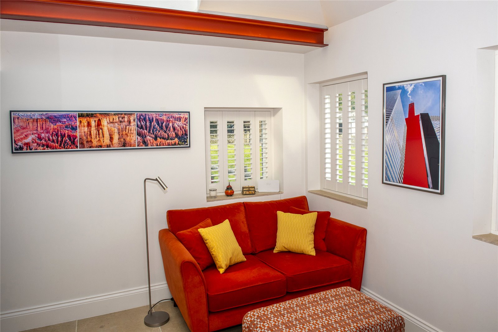Step inside, and you'll be greeted by a series of inviting living spaces. The living room, with its cosy fireplace and solid oak flooring, is the perfect place to relax and unwind. French doors lead out to the garden, allowing for seamless indoor-outdoor living. A snug room featuring stone tiled flooring and plantation shutters offers stunning views of the surrounding countryside. The glass ceiling window in this room provides a flood of natural light, creating a bright and airy atmosphere. The snug also serves as an inter-room to the studio. For those seeking a creative space, the art studio boasts white-painted stone walls and provides a versatile and inspiring environment.