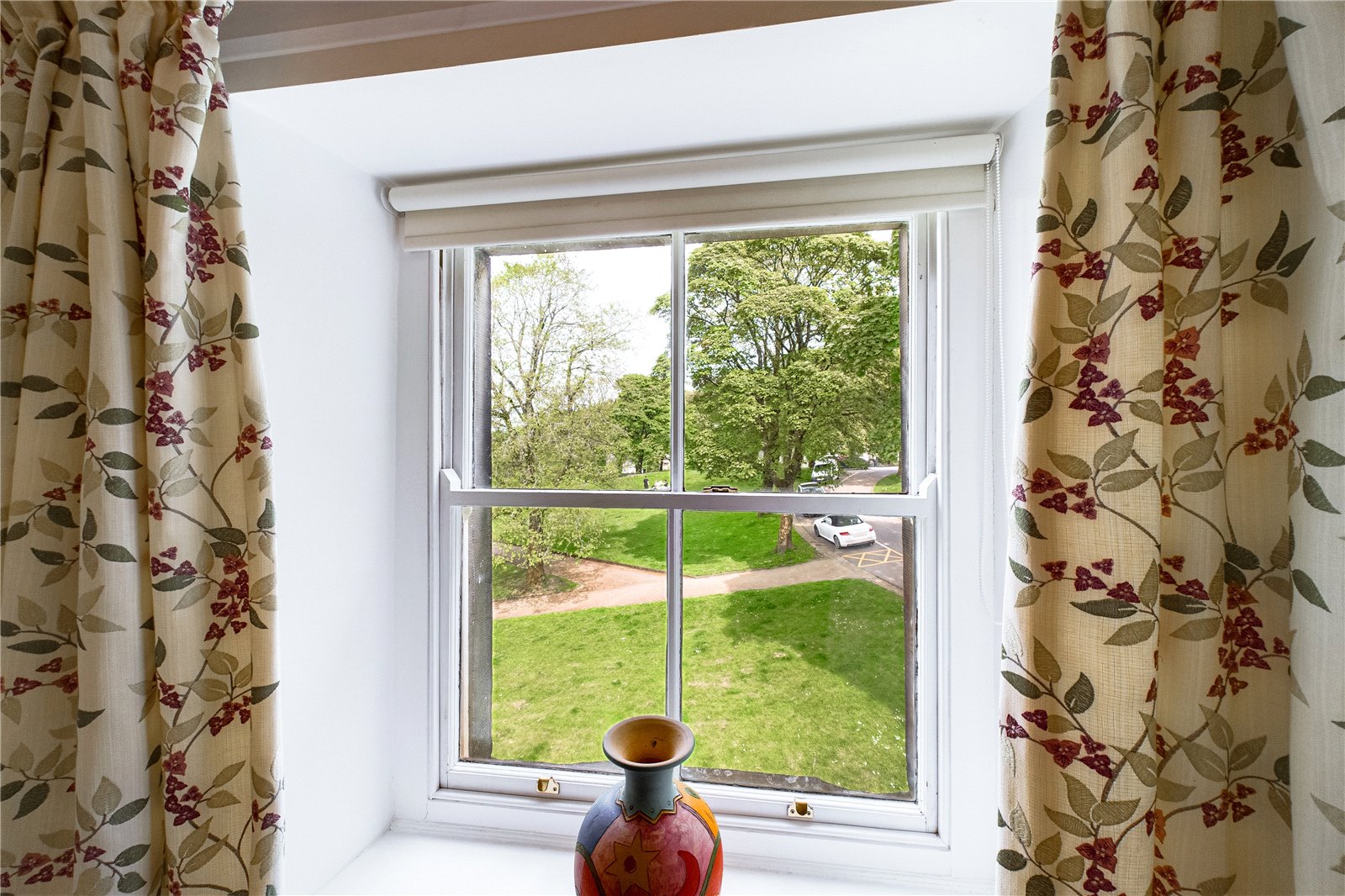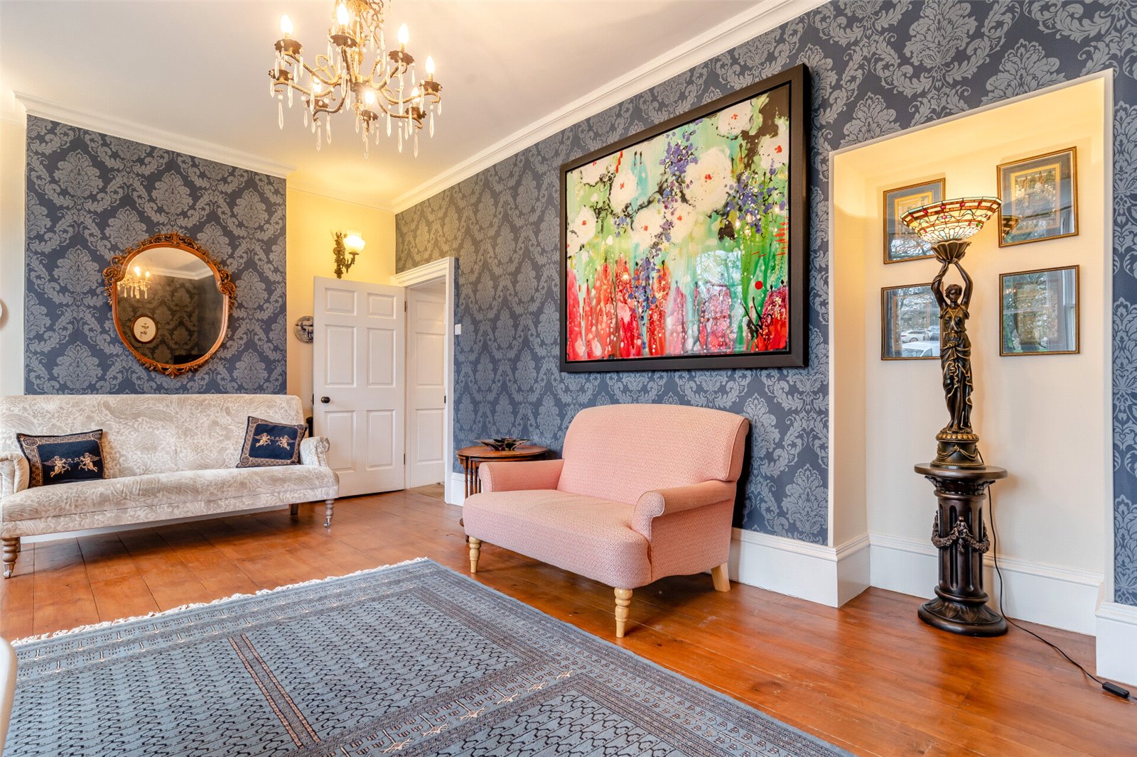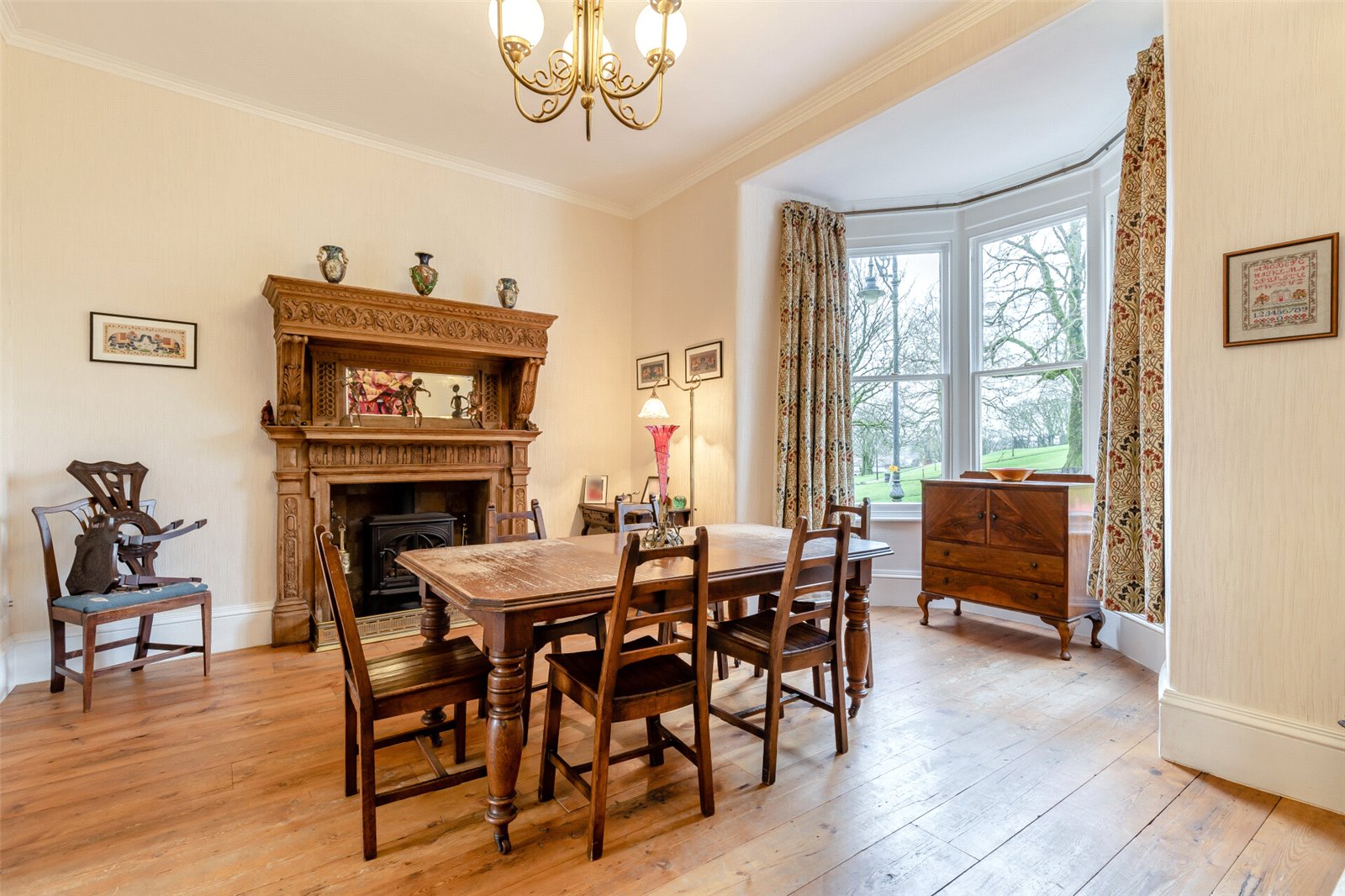 The entrance hall features gleaming checkerboard floors and a grand Derbyshire stone staircase. The dining room has original oak floors, luxurious silk wallpaper, a striking mantlepiece and a gas fireplace. The large bay windows offer breathtaking park views.