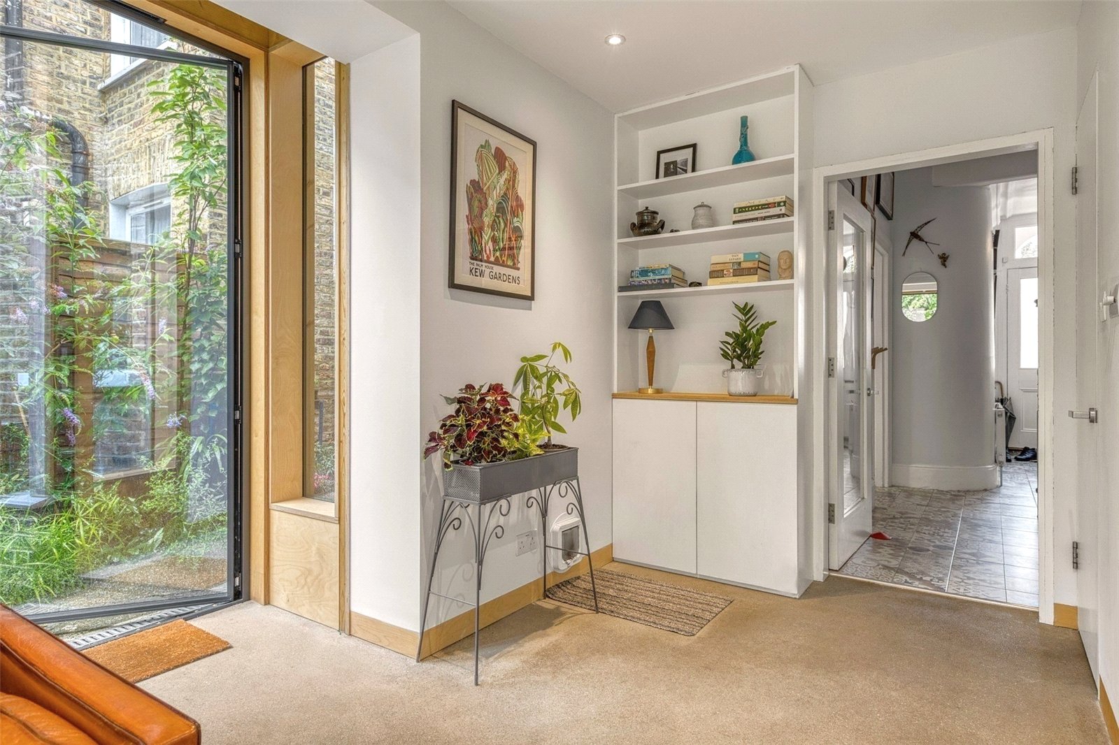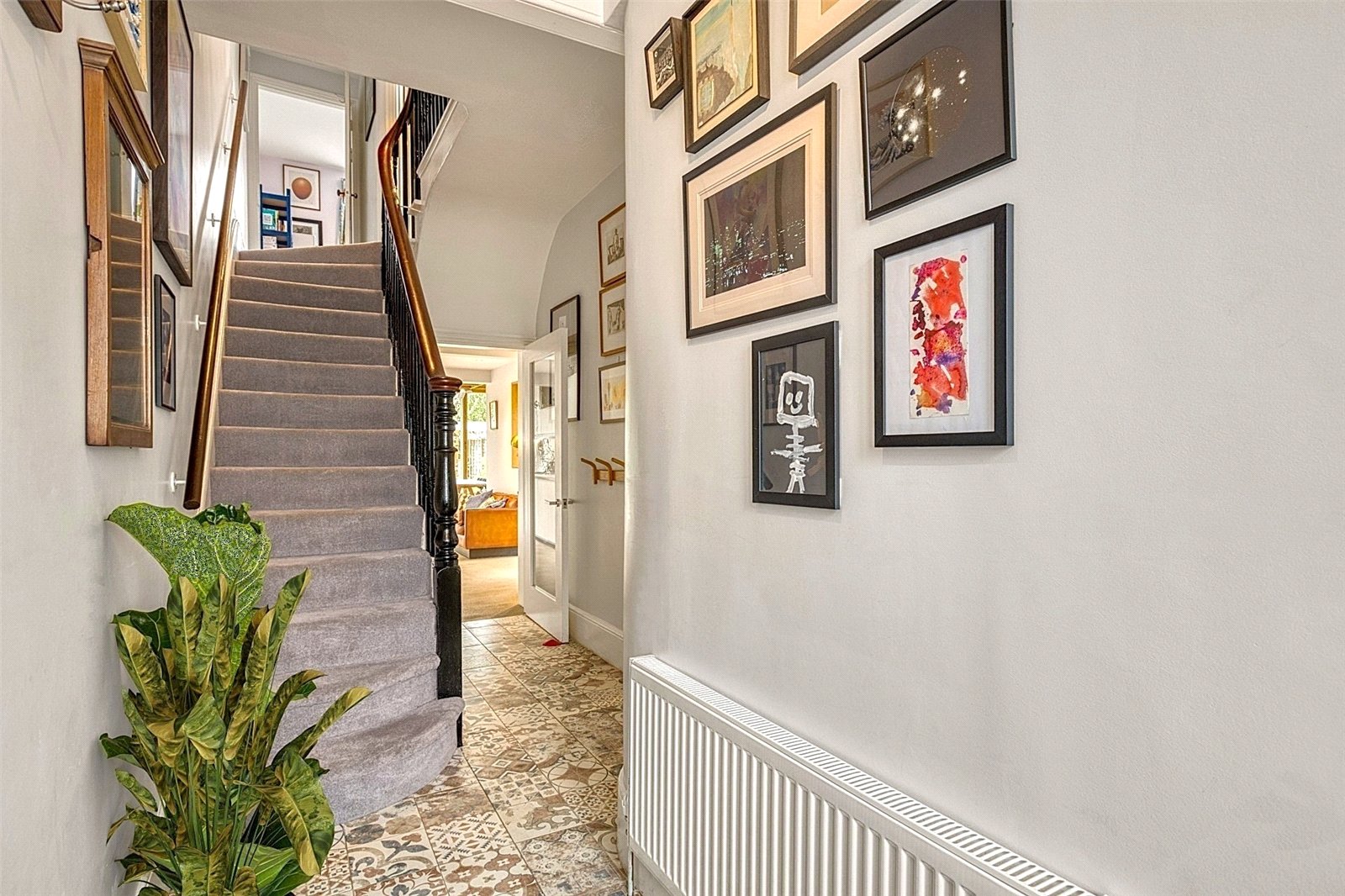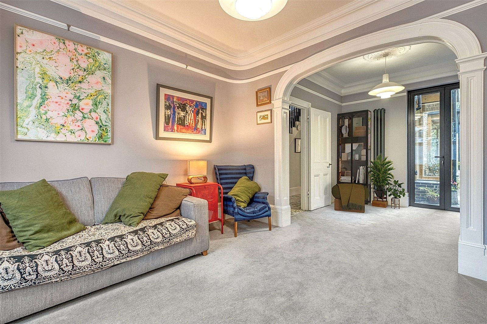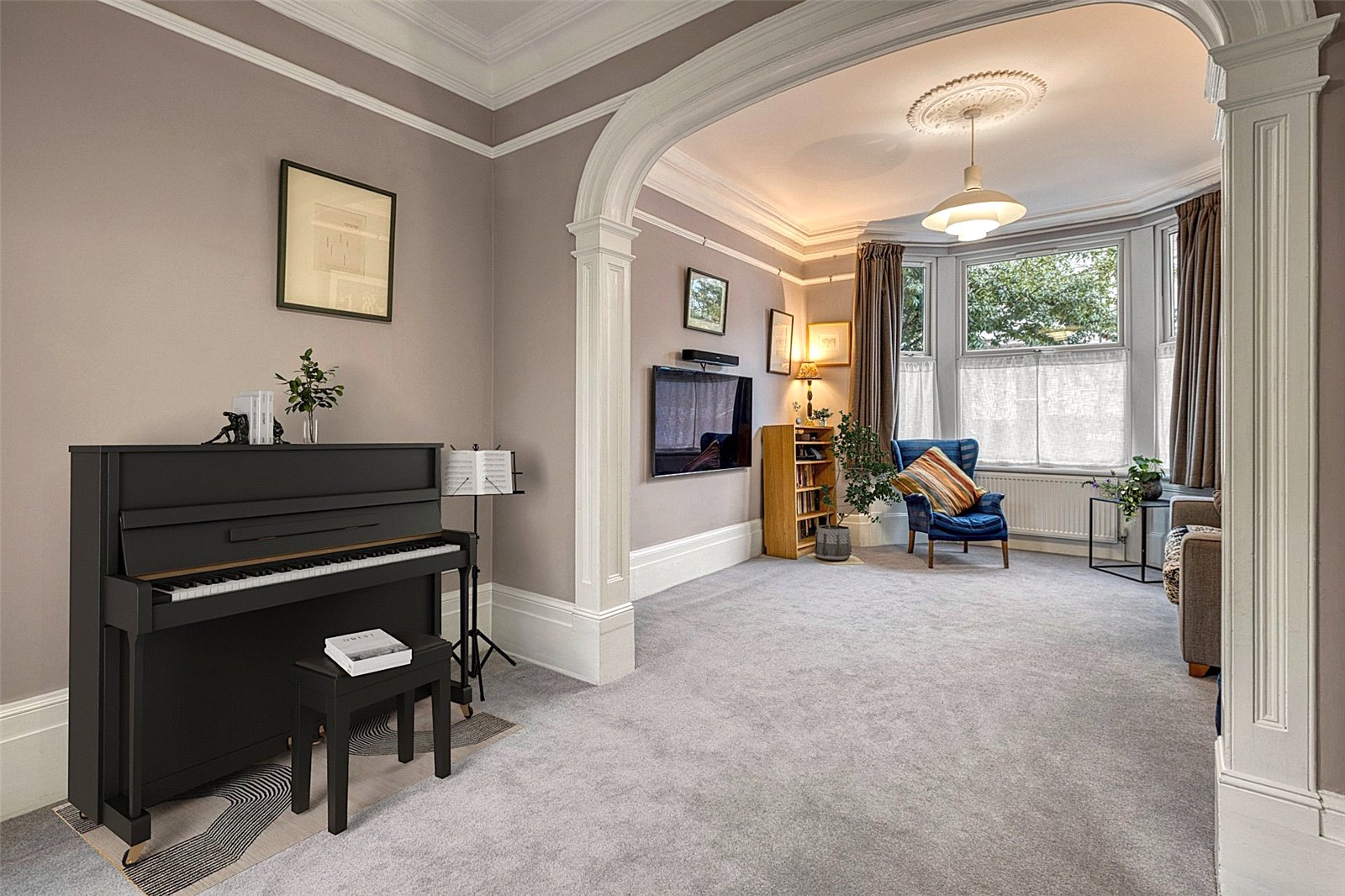 Step inside and you're greeted by a wide, light-filled hallway that sets the tone for the home's effortless calm. To the right, a double reception room stretches from front to rear, an elegant and welcoming space with beautiful cornicing, original detailing, and a striking curved archway that links both rooms with a graceful flow. At the rear, large French doors open directly to the garden, allowing the outdoors to spill in and flooding the space with natural light.