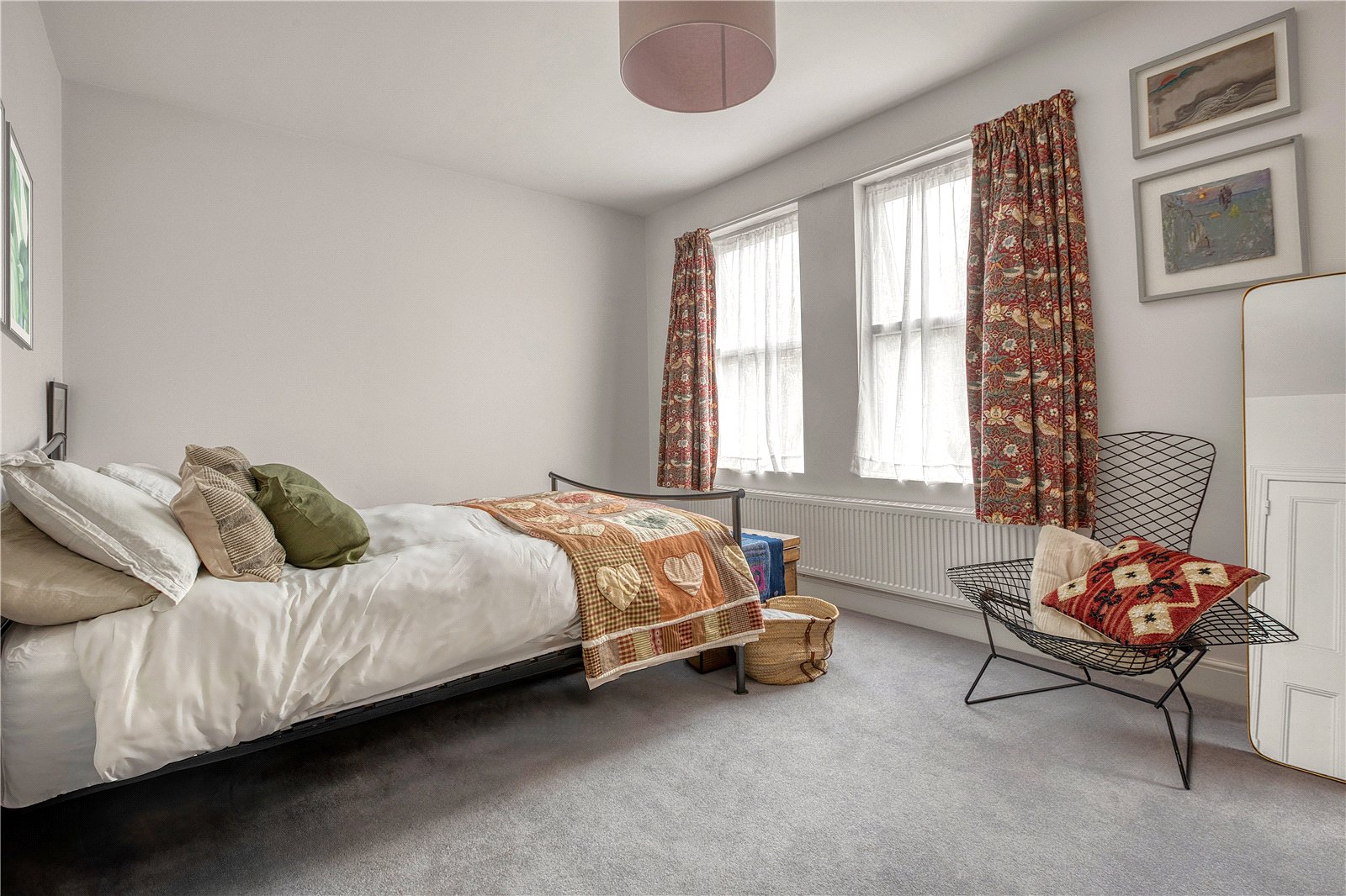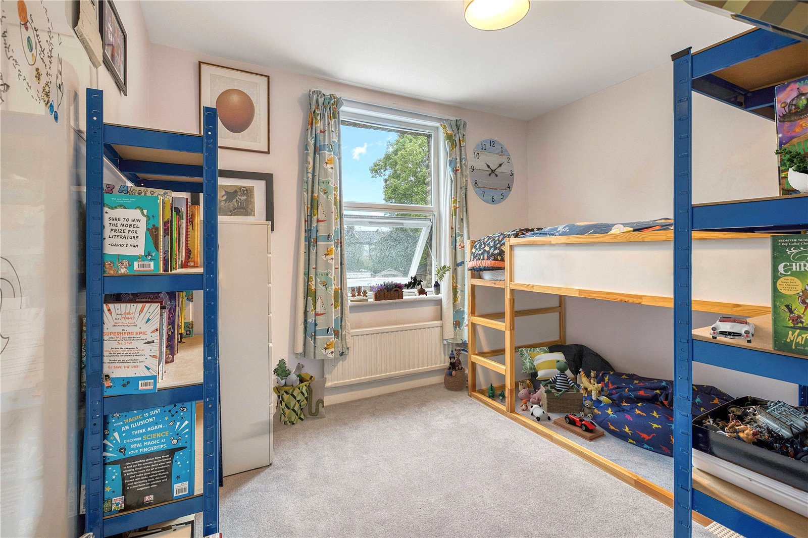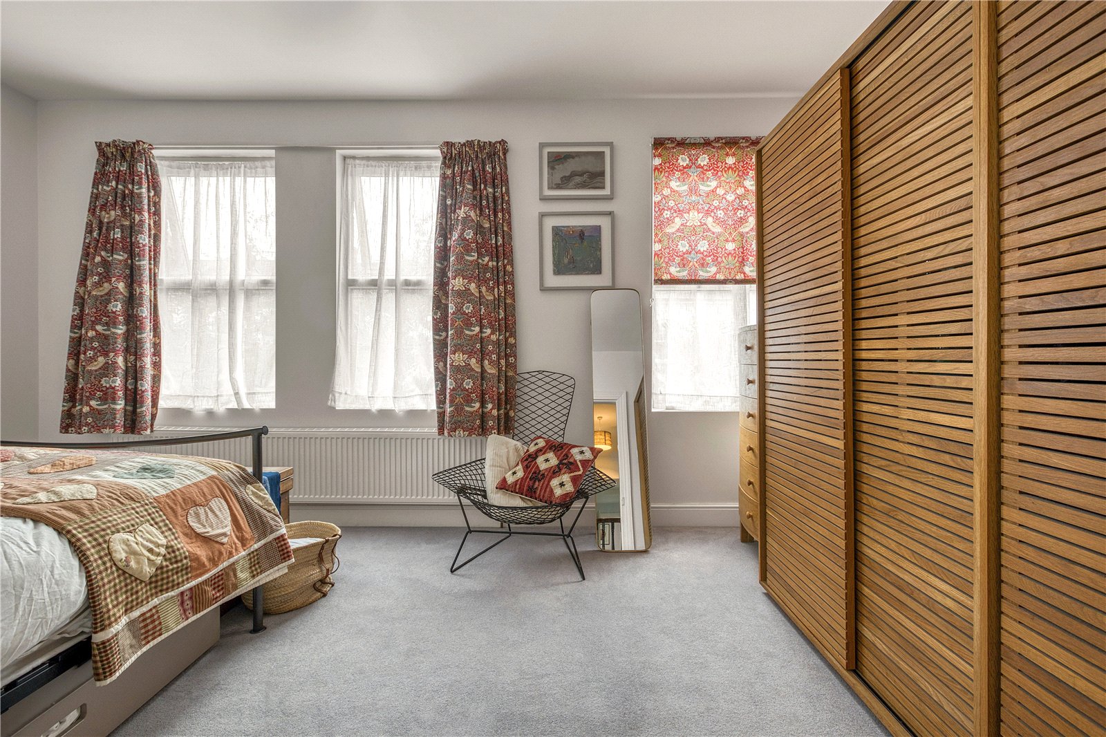 Upstairs, the home continues to impress. A bright and airy children's bedroom is situated at the rear, while the centrally positioned family bathroom, completely reimagined during the renovation, features high-spec fittings, including a matte black Vellamo shower, re-glazed windows, and a refined, modern aesthetic. A second bedroom overlooks the garden and offers peace, making it ideal for guests or use as a study. At the front, the master bedroom benefits from three tall windows and a soothing aspect, creating a space that feels genuinely restorative.