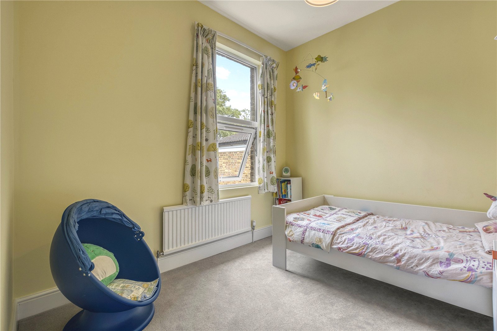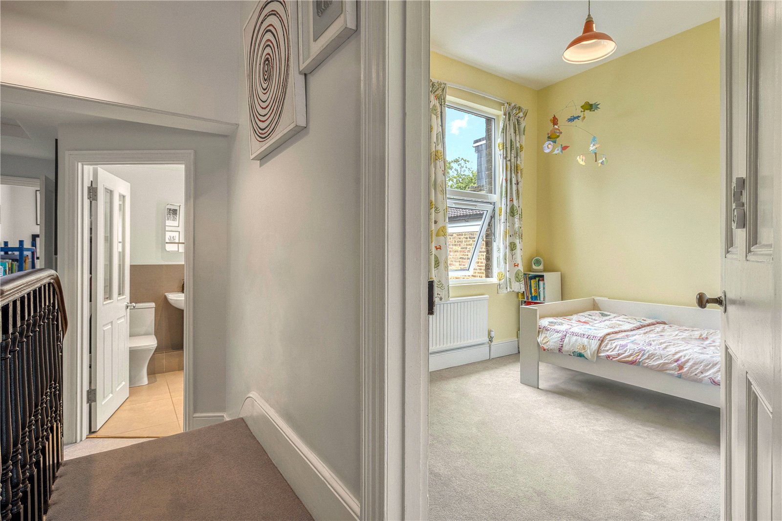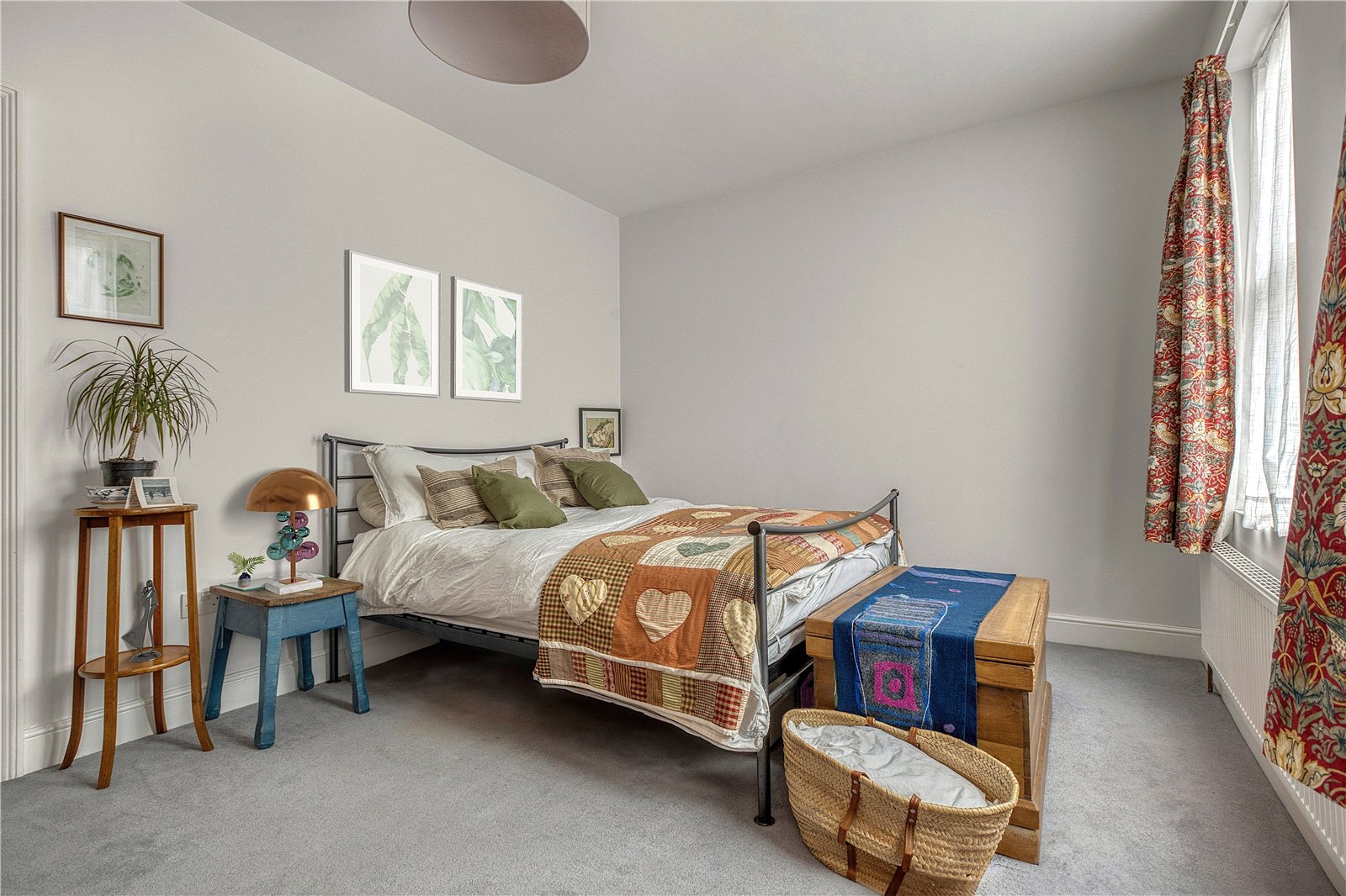 Upstairs, the home continues to impress. A bright and airy children's bedroom is situated at the rear, while the centrally positioned family bathroom, completely reimagined during the renovation, features high-spec fittings, including a matte black Vellamo shower, re-glazed windows, and a refined, modern aesthetic. A second bedroom overlooks the garden and offers peace, making it ideal for guests or use as a study. At the front, the master bedroom benefits from three tall windows and a soothing aspect, creating a space that feels genuinely restorative.