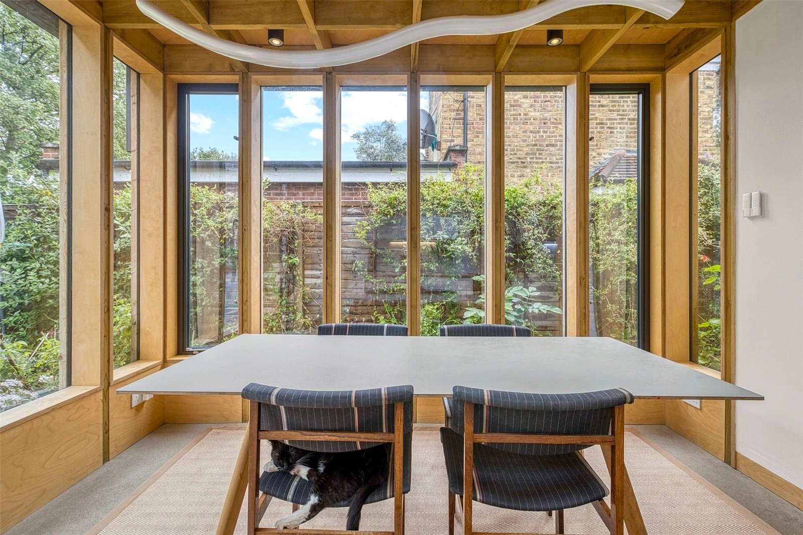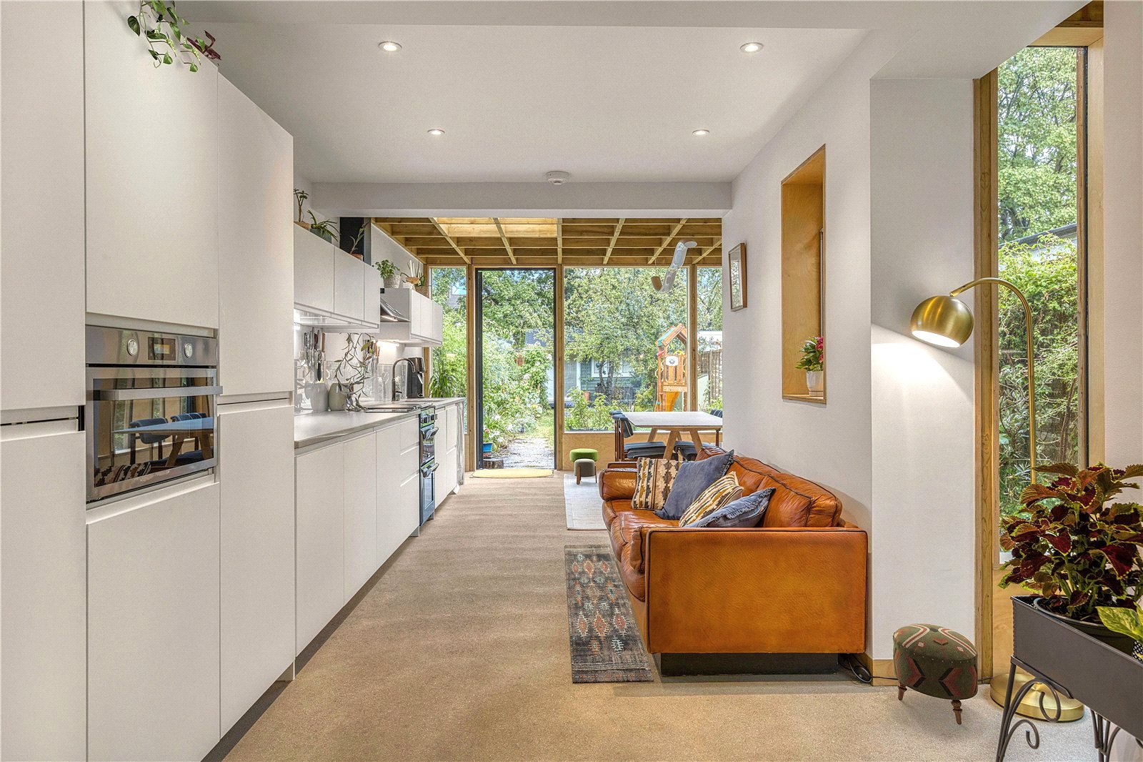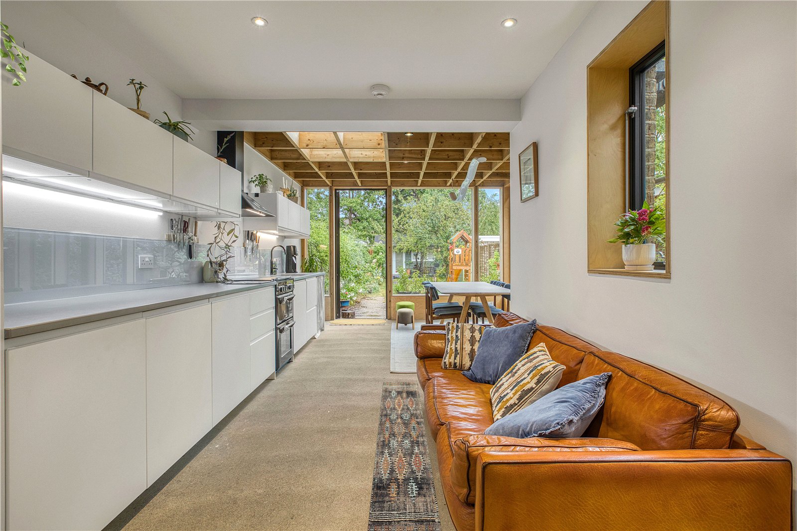 Just off the hallway, there's a convenient understairs storage area and a guest WC, discreetly tucked away for everyday ease. The rear extension is a triumph of designcreated by Knott Architects and completed as part of a significant renovation. This kitchen-living space is all about clarity, connection, and quiet sophistication. White cabinetry contrasts beautifully with warm wood accents and integrated appliances, while underfloor heating adds comfort beneath your feet.