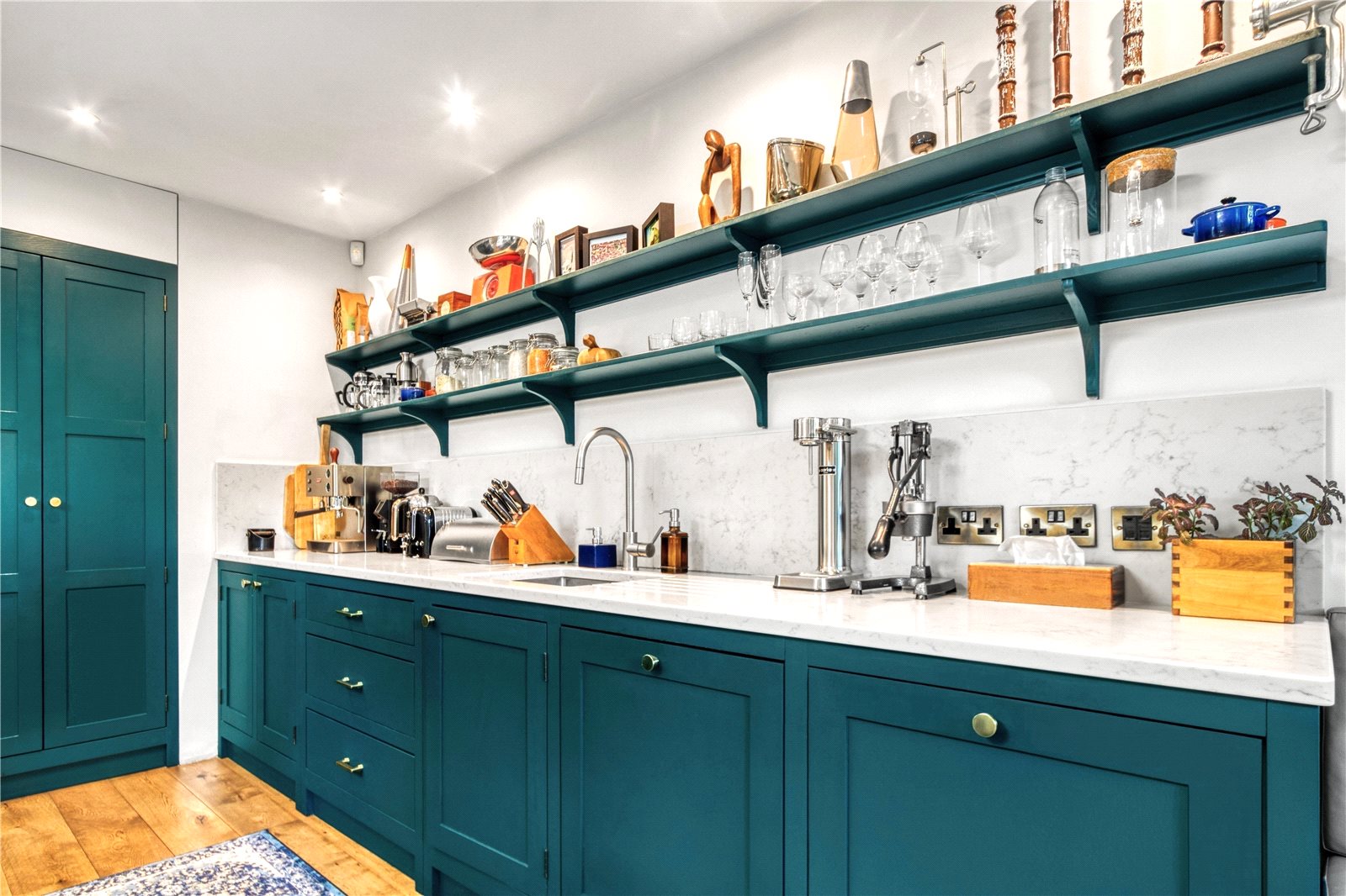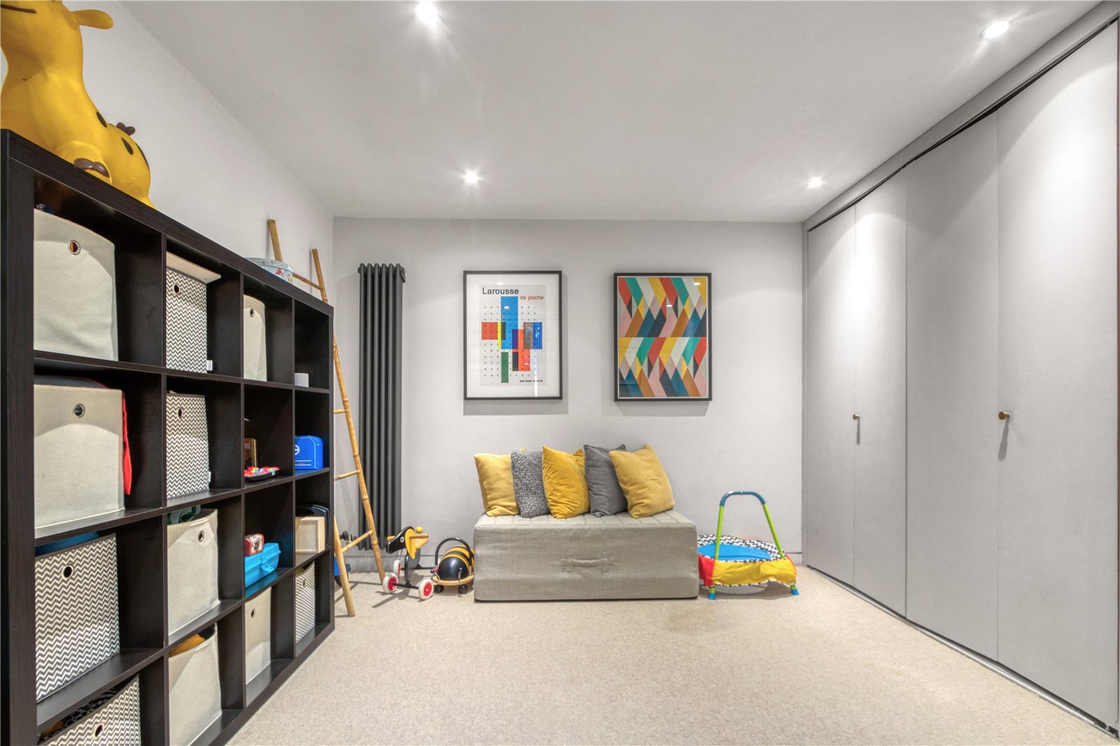 The homes spaces are flexibly designed to equally suit family nights in, quiet moments and large group entertaining. At the heart of the home is its luxurious bespoke kitchen, equipped with state-of-the-art appliances, a larder, bespoke banquette seating, and an integral wine fridge. Large glass doors open to the tranquil, mature garden and BBQ patio, complemented by the large sun-soaked roof terrace. Attention to detail is apparent in every aspect of this property, including abundant storage, a feature glass-box skylight, a working log burner, and a smart heating system (underfloor and radiator). With an eye to both the playful and practical, a self-contained play/cinema room and utility room efficiently accommodate every aspect of life.