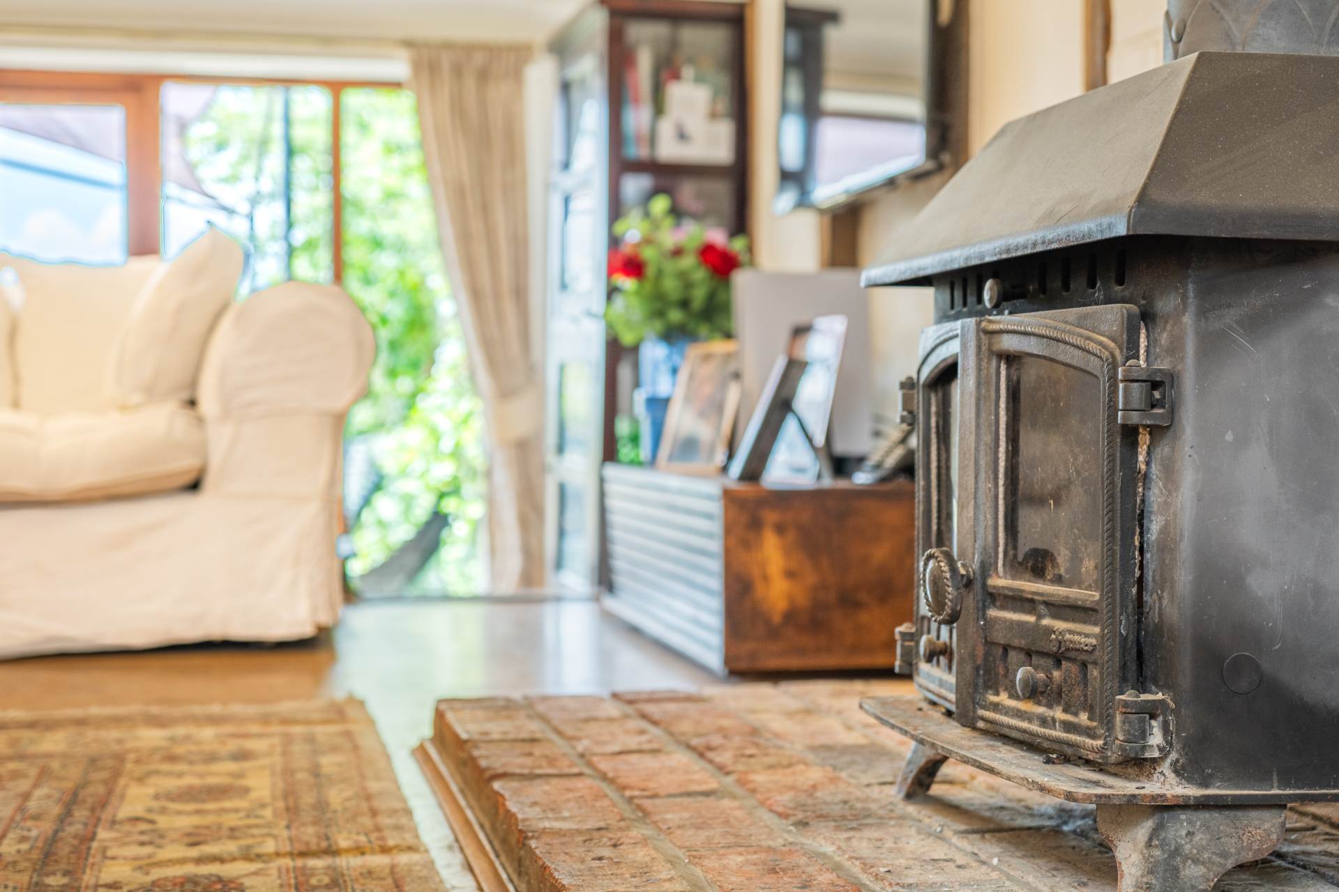 The heart of the home is the spacious, character-filled living area with exposed beams and a wood-burning stove ideal for family gatherings or quiet evenings. The kitchen is well-appointed for everyday living and entertaining alike.