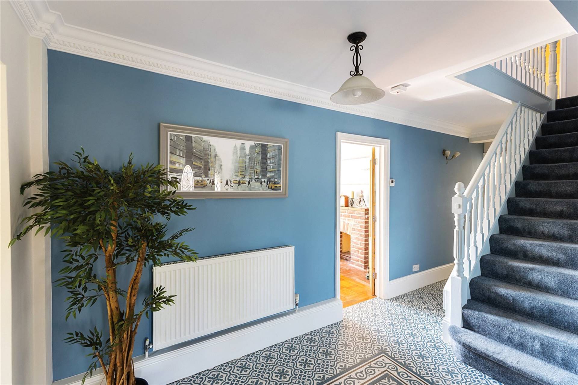 The hallway leads seamlessly into a well-proportioned, double-aspect sitting room, where the cast iron fireplace with a coal-effect electric fire creates a warm and inviting focal point.