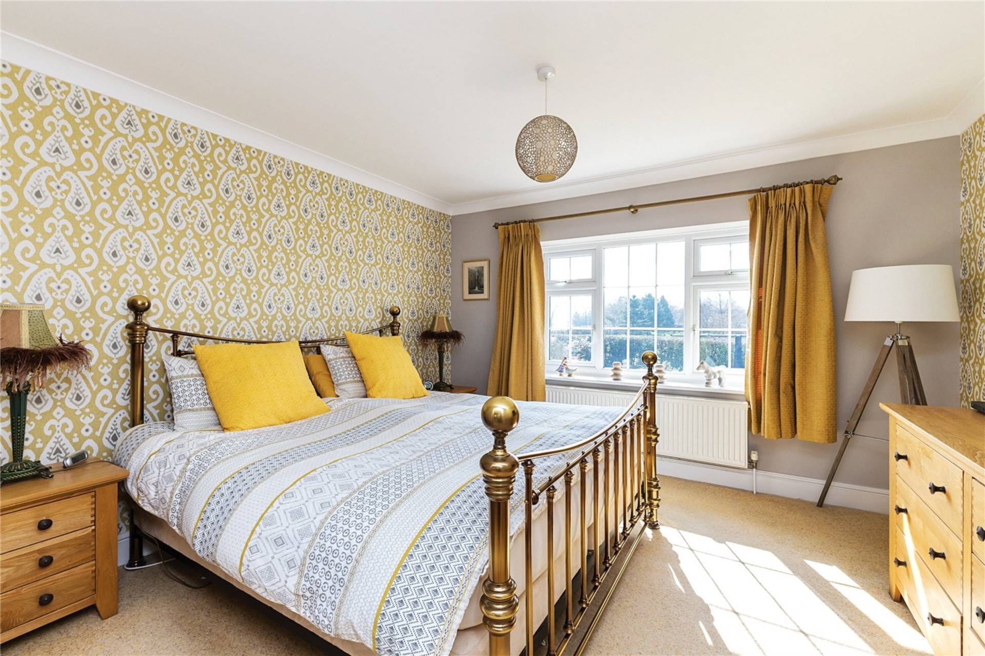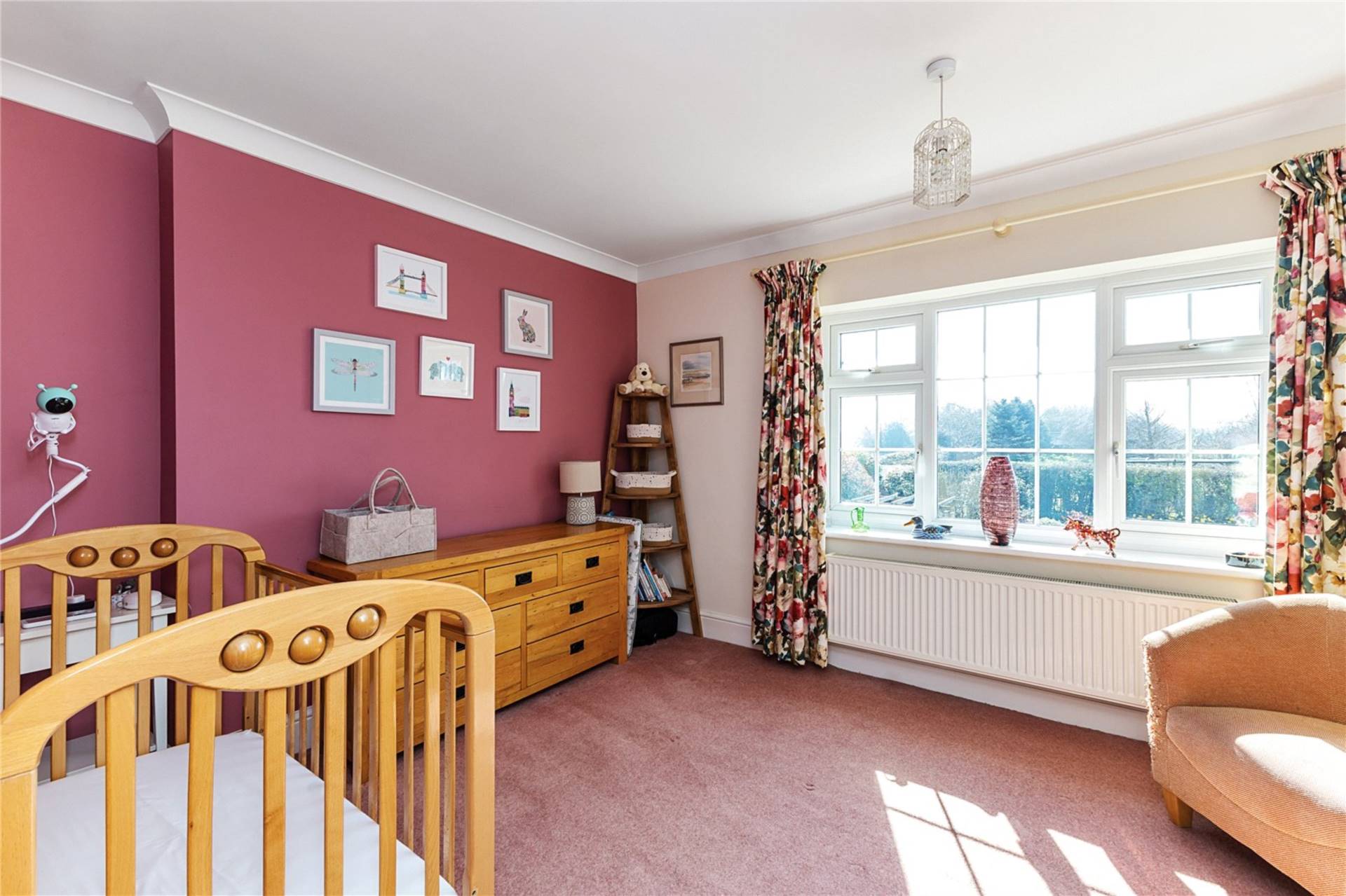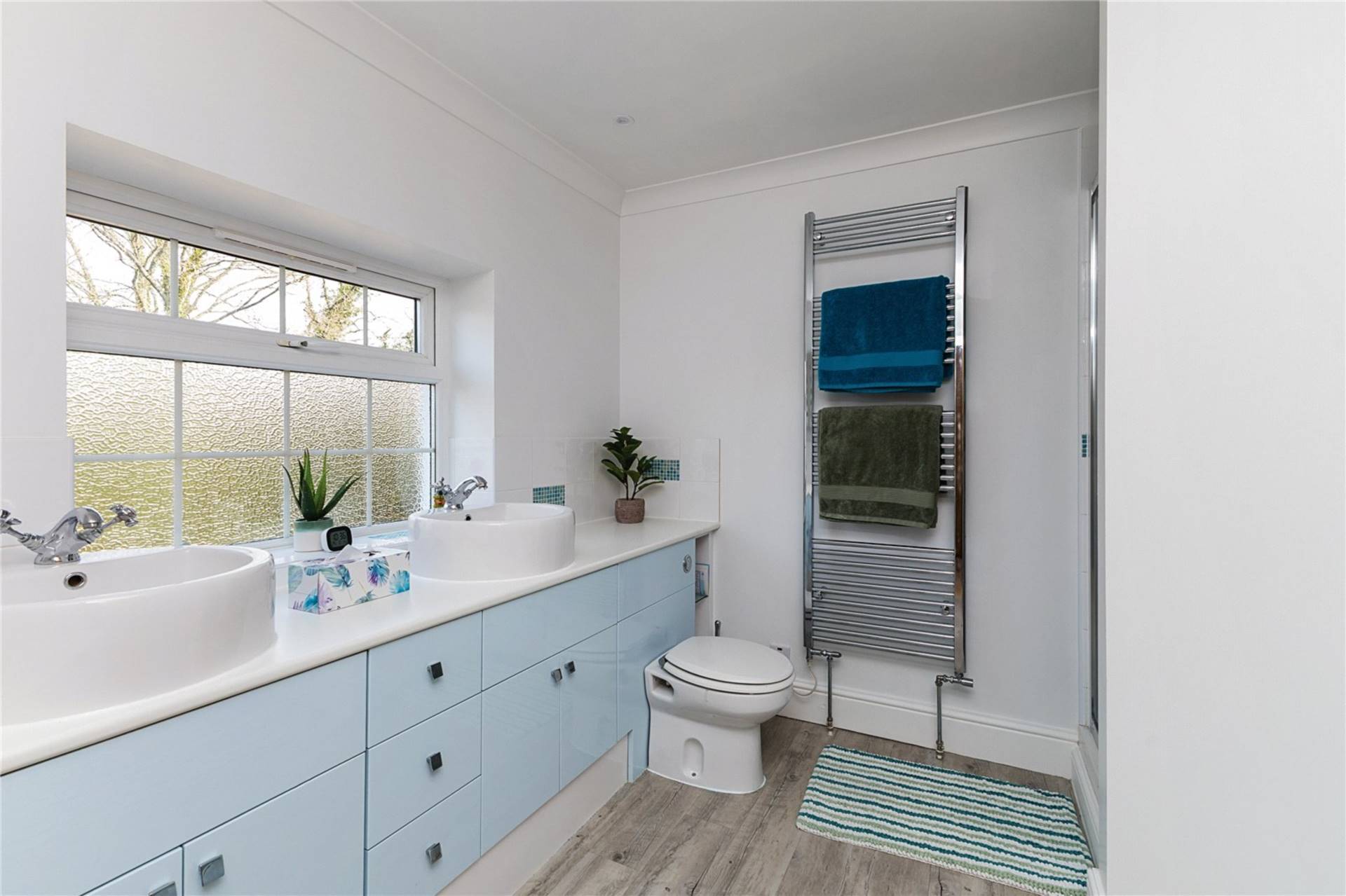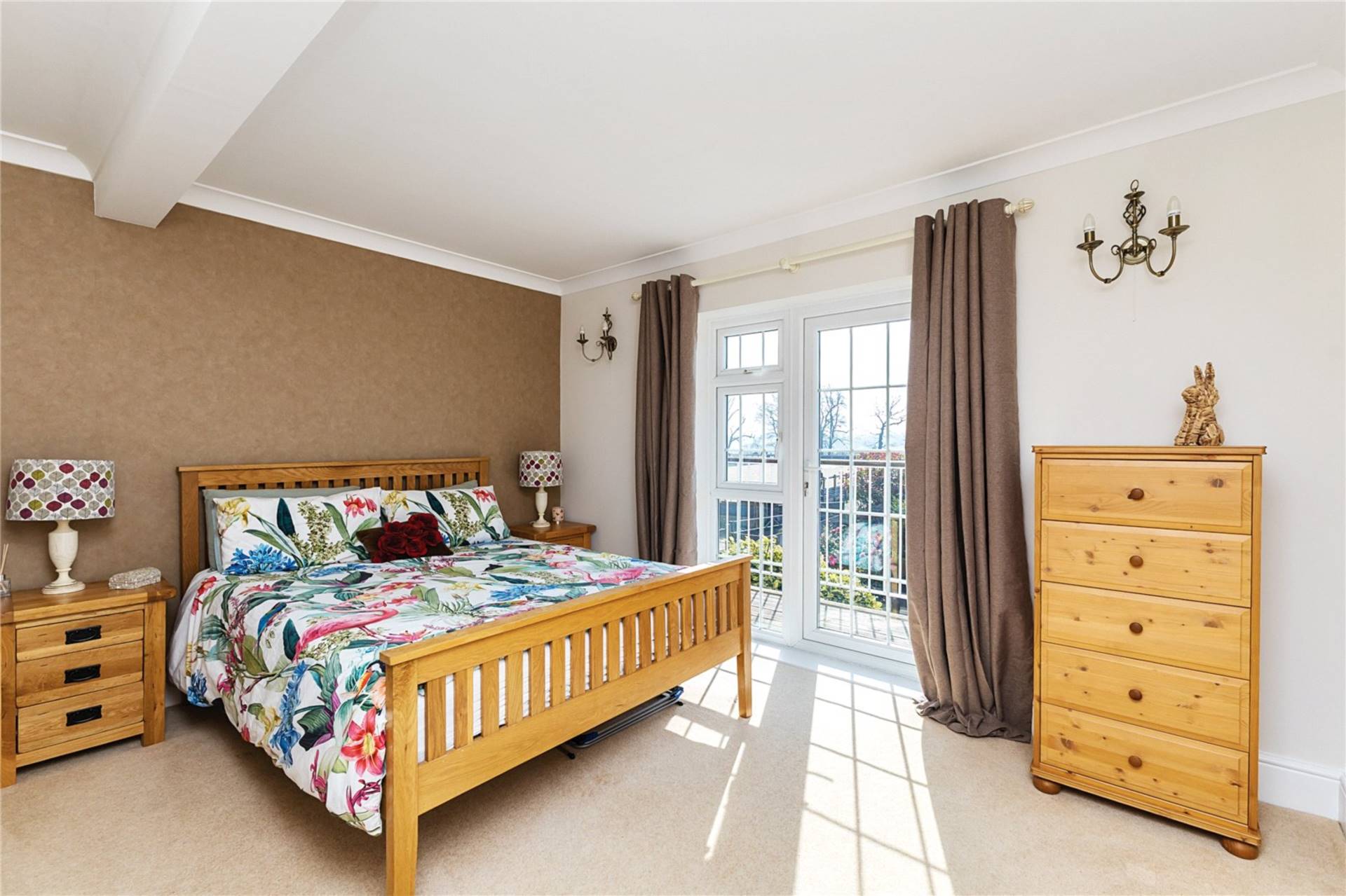 Four further bedrooms offer versatile accommodation, with bedroom four boasting double doors that open onto a balcony, providing a peaceful spot to take in the garden and views beyond. The main family bathroom features a large walk-in shower, separate bath, twin wash basins, and a heated towel rail, all complemented by stylish vanity storage in a neutral-decor.