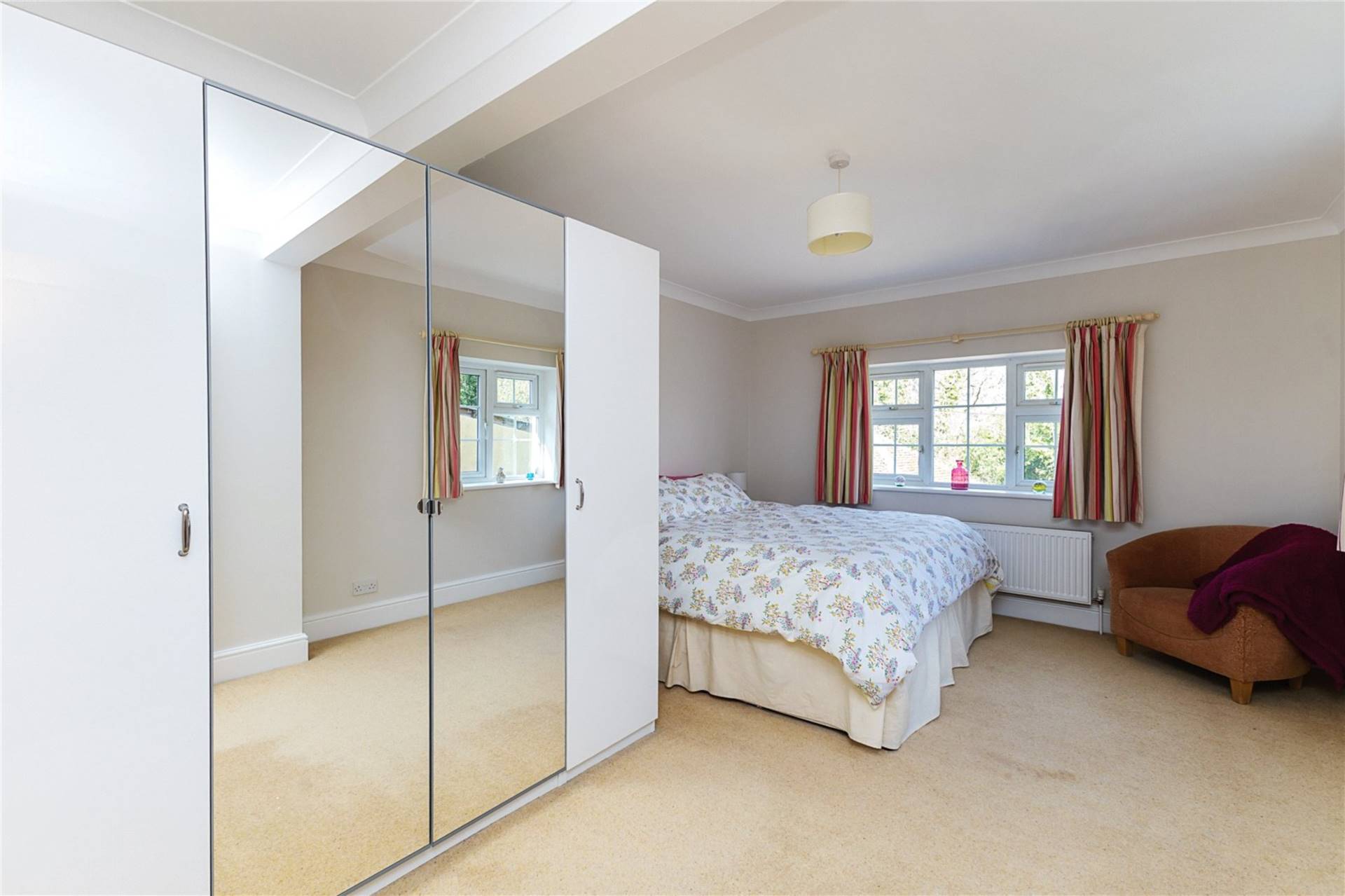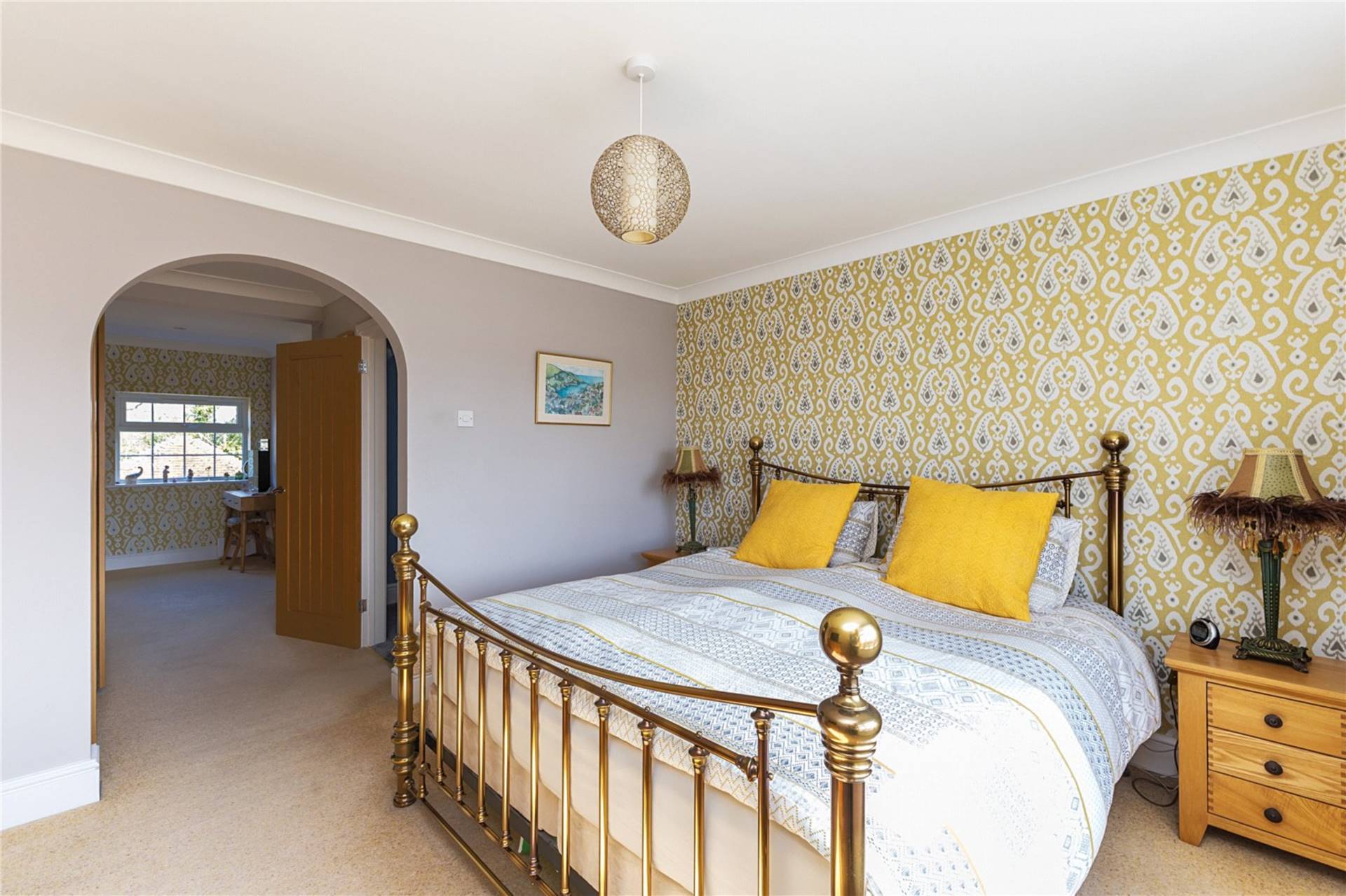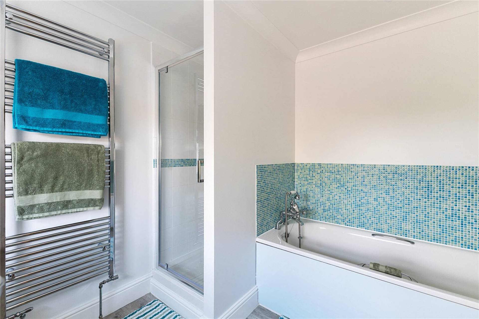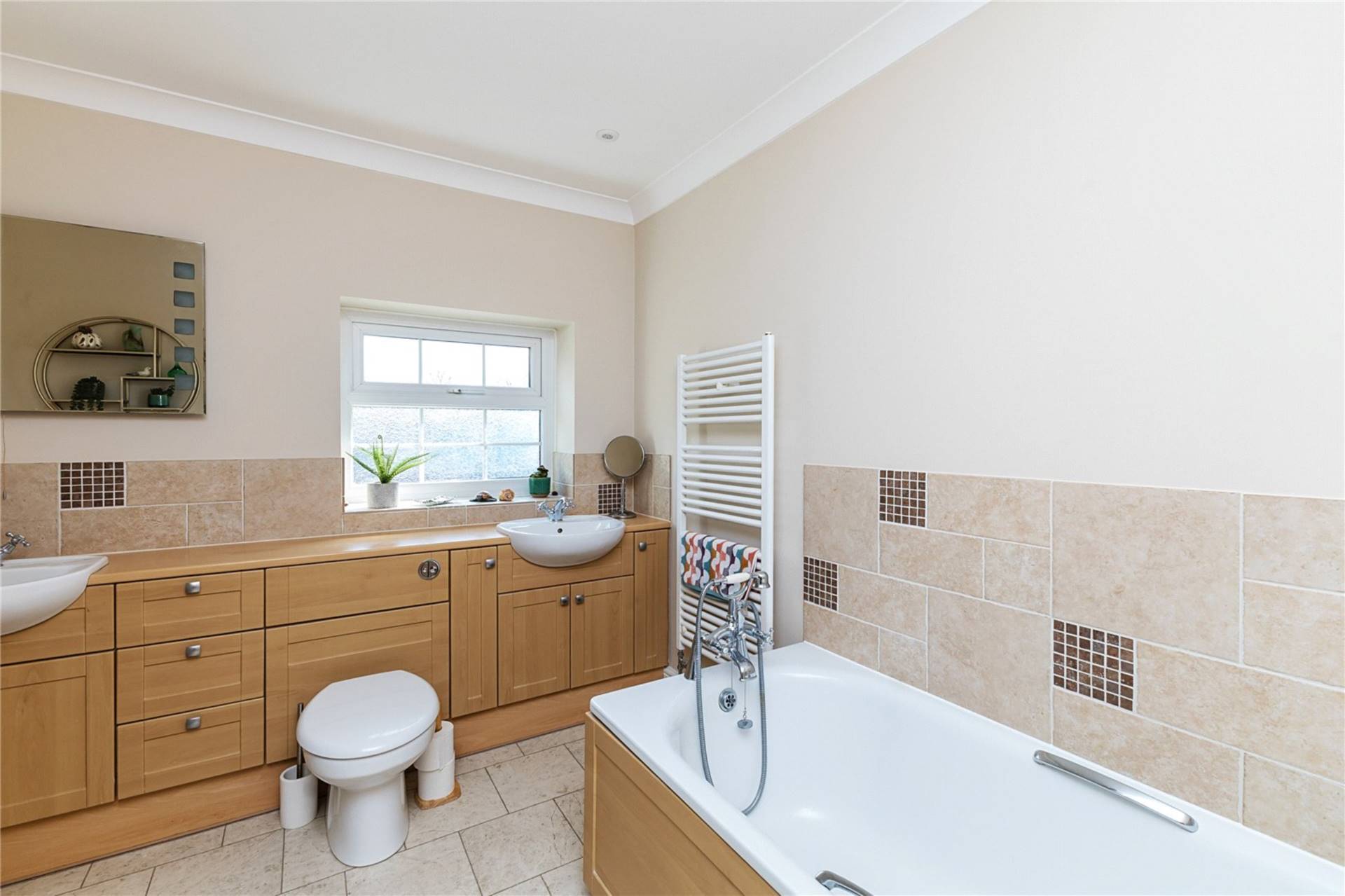 Four further bedrooms offer versatile accommodation, with bedroom four boasting double doors that open onto a balcony, providing a peaceful spot to take in the garden and views beyond. The main family bathroom features a large walk-in shower, separate bath, twin wash basins, and a heated towel rail, all complemented by stylish vanity storage in a neutral-decor.