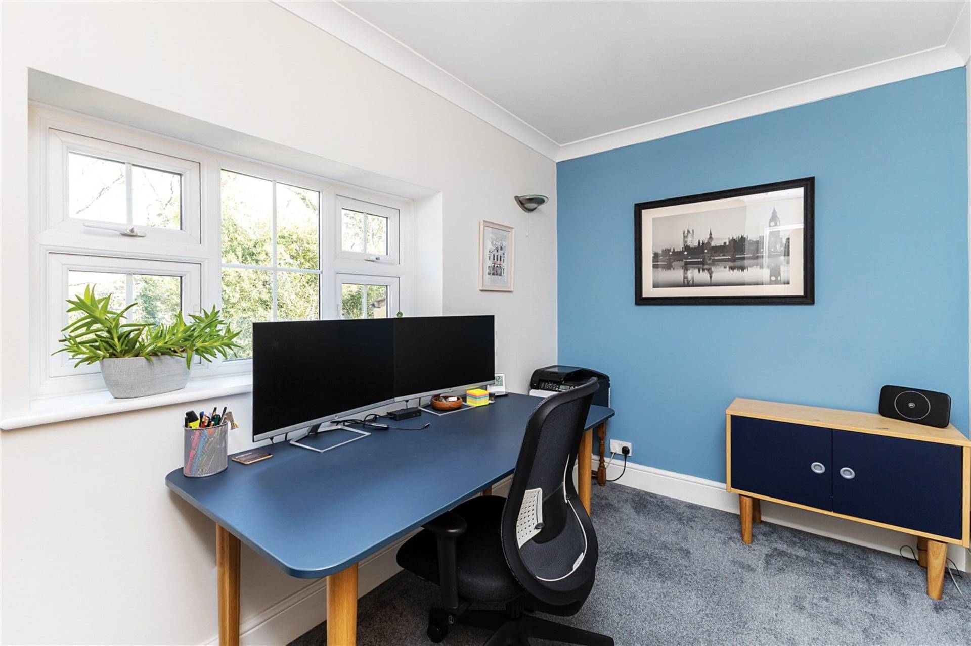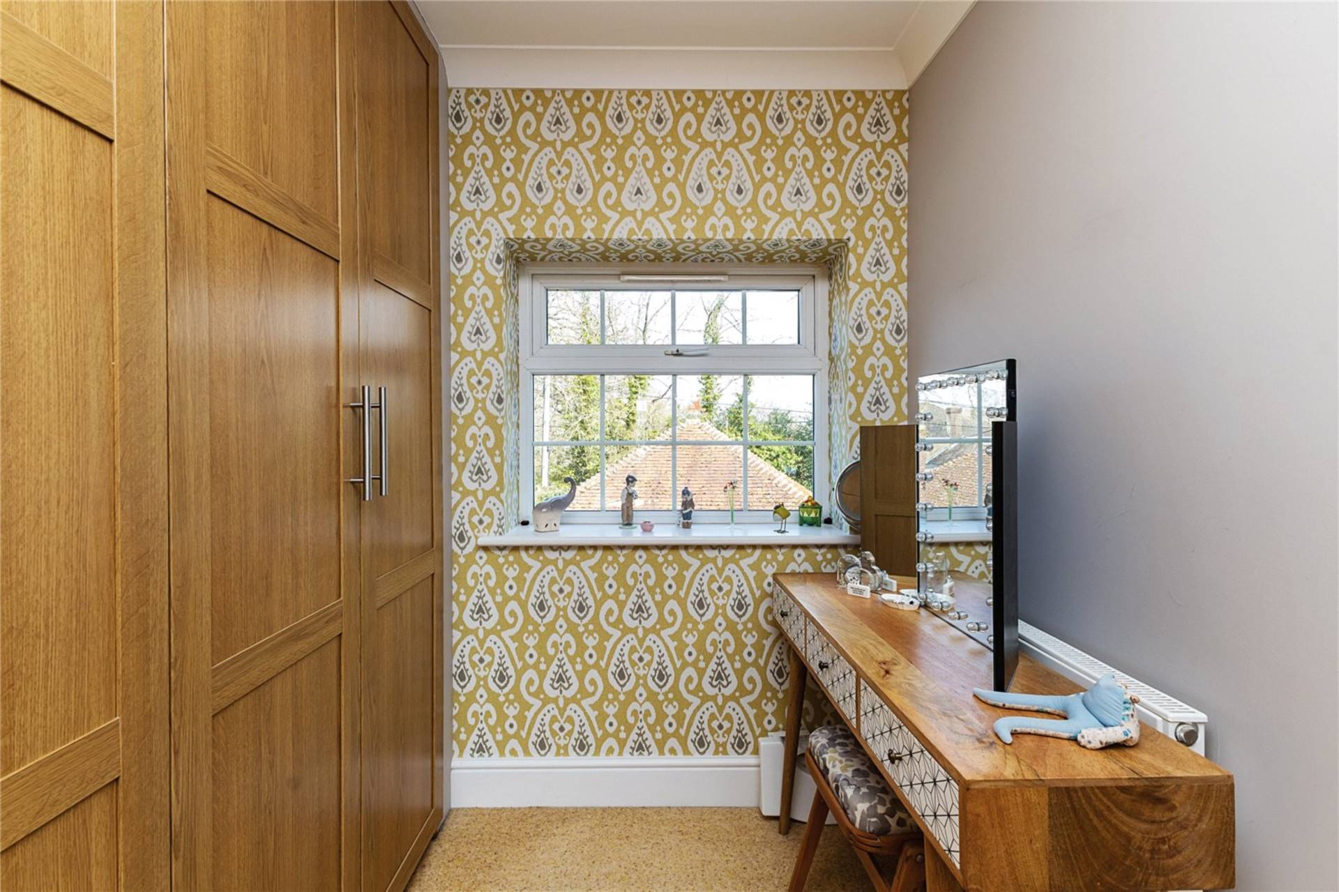 The staircase rises to the first floor, where the principal suite enjoys elevated views over the rear garden. A walk-through dressing room, complete with fitted wardrobes and bespoke cabinetry, leads into a luxurious en-suite bathroom. Thoughtfully designed, this space features twin wash basins, a large walk-in shower, a separate bath, and ample storage within the vanity units.