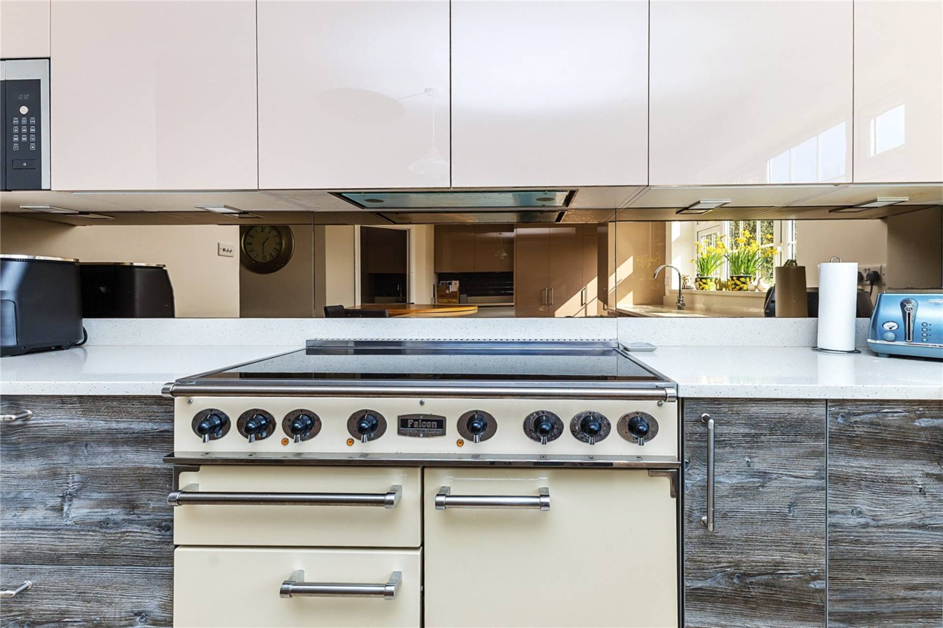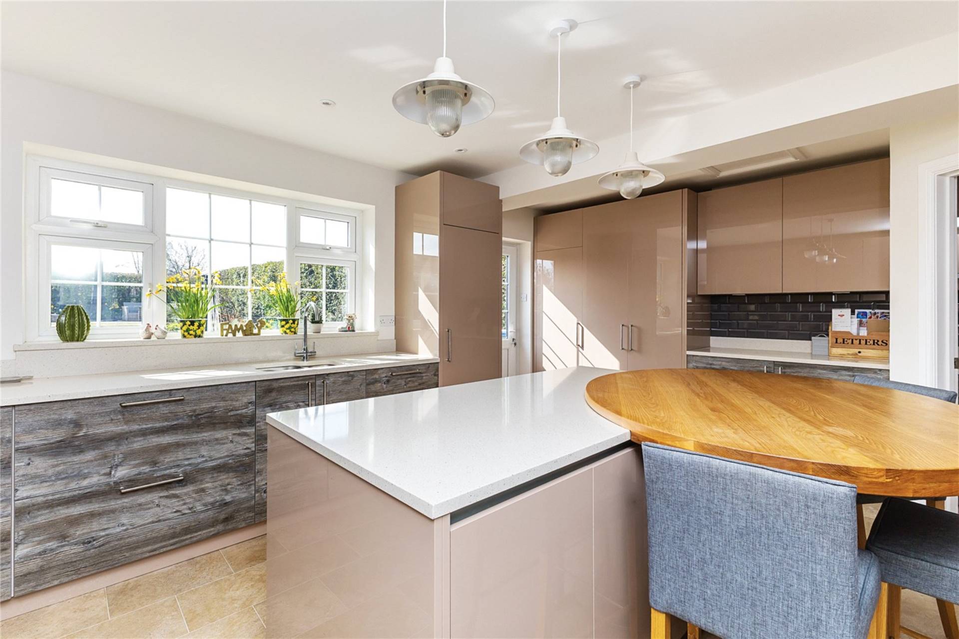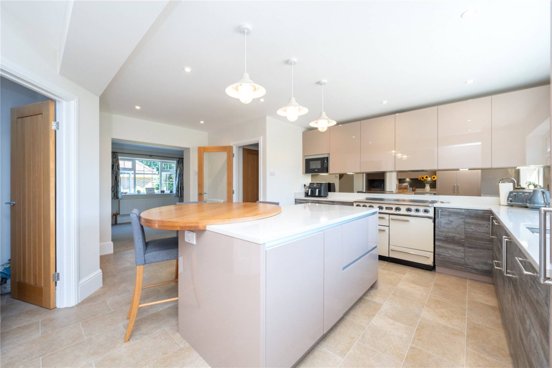 At the heart of the home, the beautifully designed kitchen has been thoughtfully reimagined by the current owners. Featuring a stylish combination of wall and base cabinetry with contrasting finishes, sleek Quartz work surfaces, and a convenient sit-up breakfast bar, this space is both practical and visually impressive.