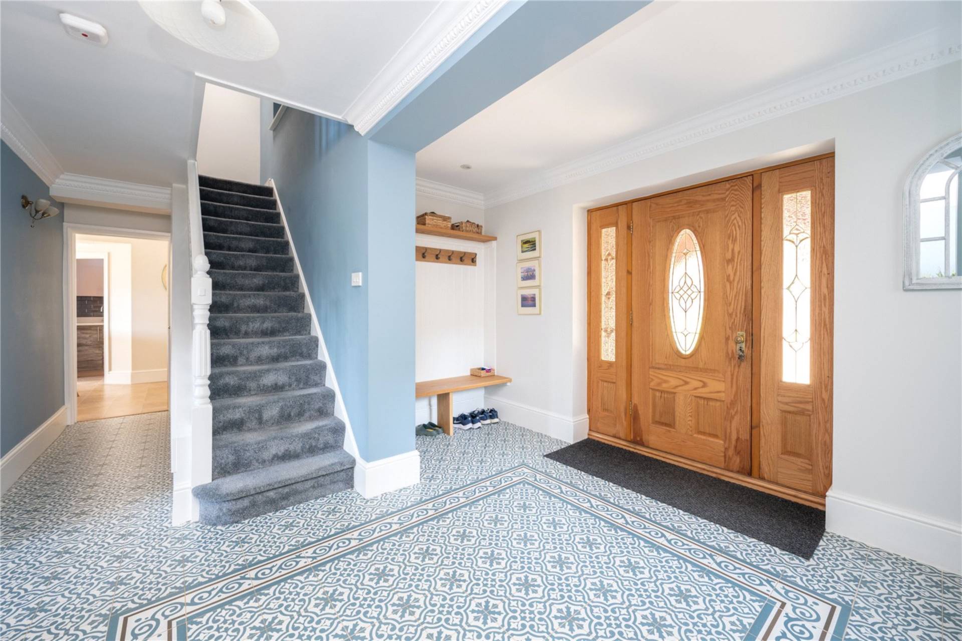 Upon entering, the reception hallway immediately sets the tone for this refined residence, featuring decorative tiled flooring that adds a touch of classic elegance.