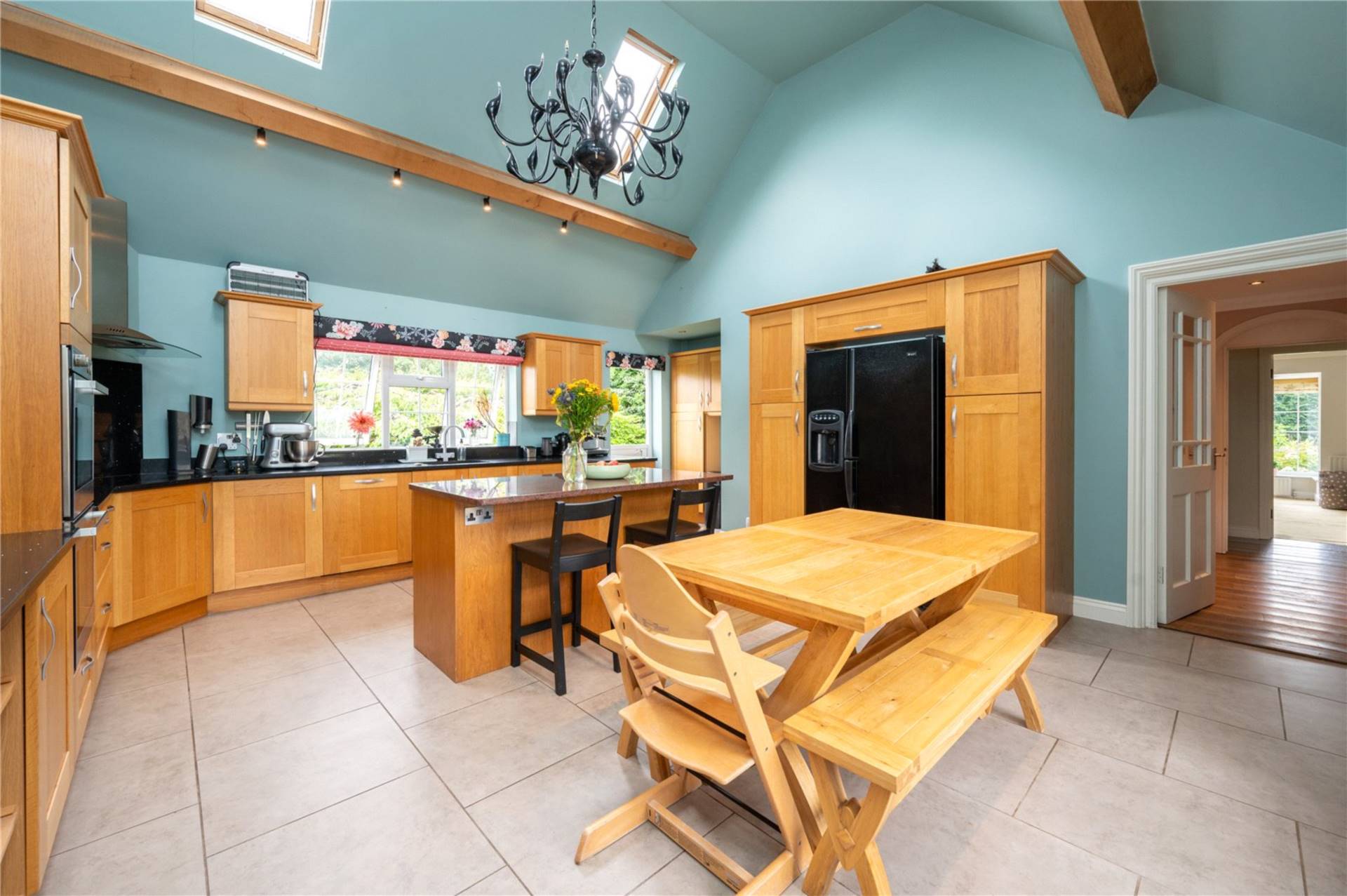 The kitchen/diner is the real heart of this home, with vaulted ceilings, Velux windows and space for a dining room table. From the kitchen the hallway leads around to the downstairs cloakroom and the utility room, providing space for a washing machine, tumble dryer and an area for drying.