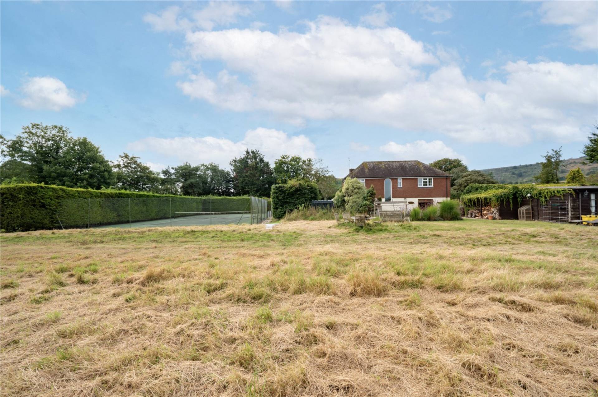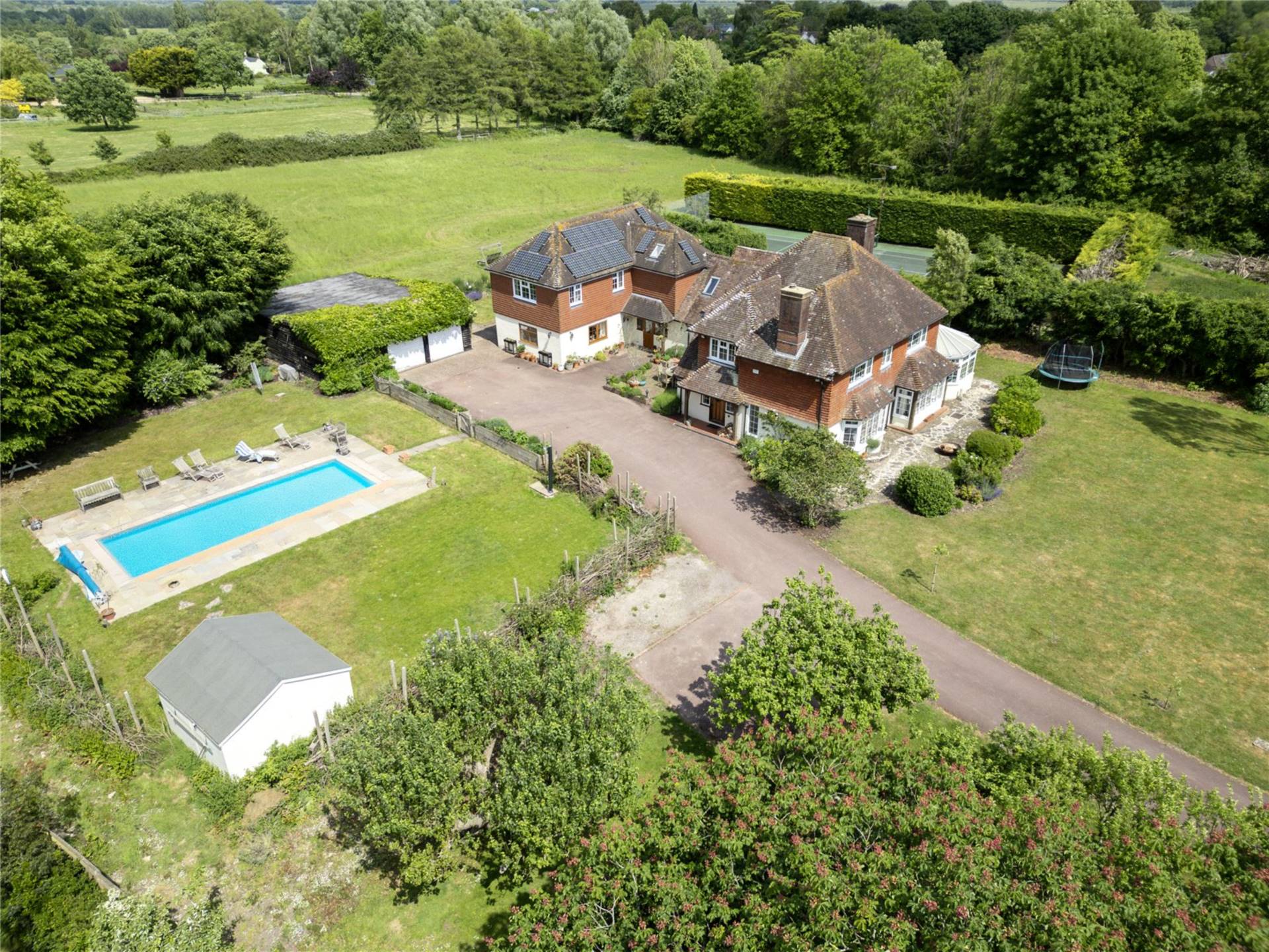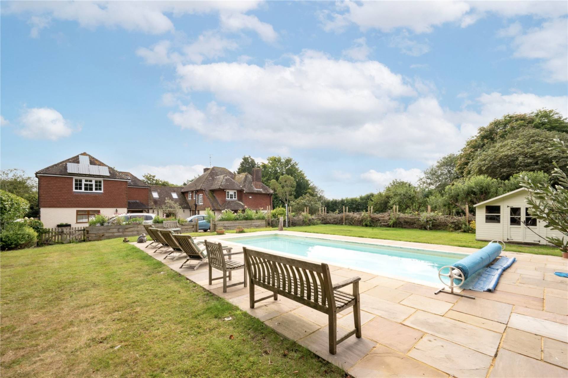 The expansive grounds total to cira 3.4 acres, with stunning views to the front of the house overlooking the Arun Valley. The heated swimming pool is the perfect spot to enjoy the view and the grounds surrounding it, with York stone paving and a pretty timber summer house/changing room. The tennis courts are in fantastic condition with open views onto the field. The triple bay garage has two door access, and attached at the rear there is a large Games/store room. The field completing the grounds is a delightful space and can be accessed via a separate gate.