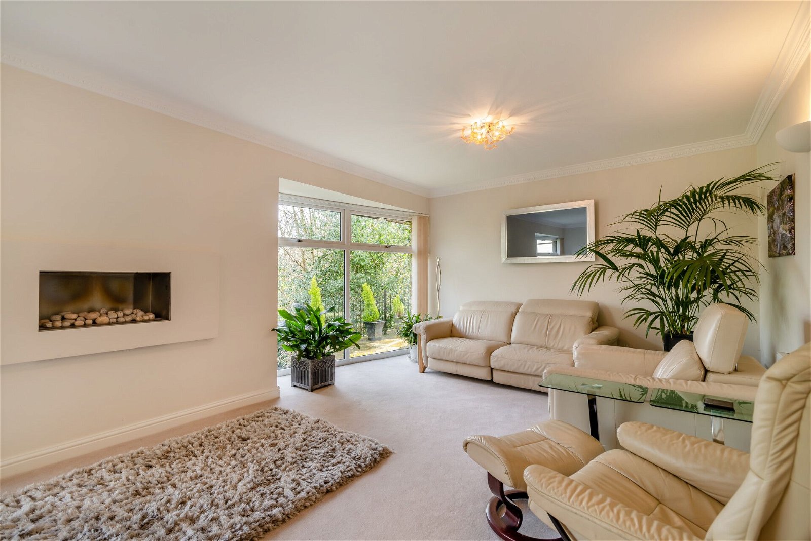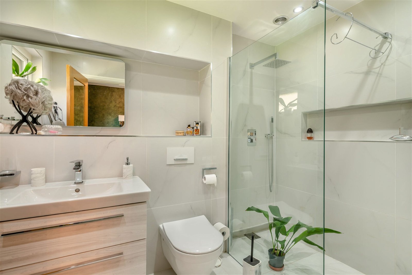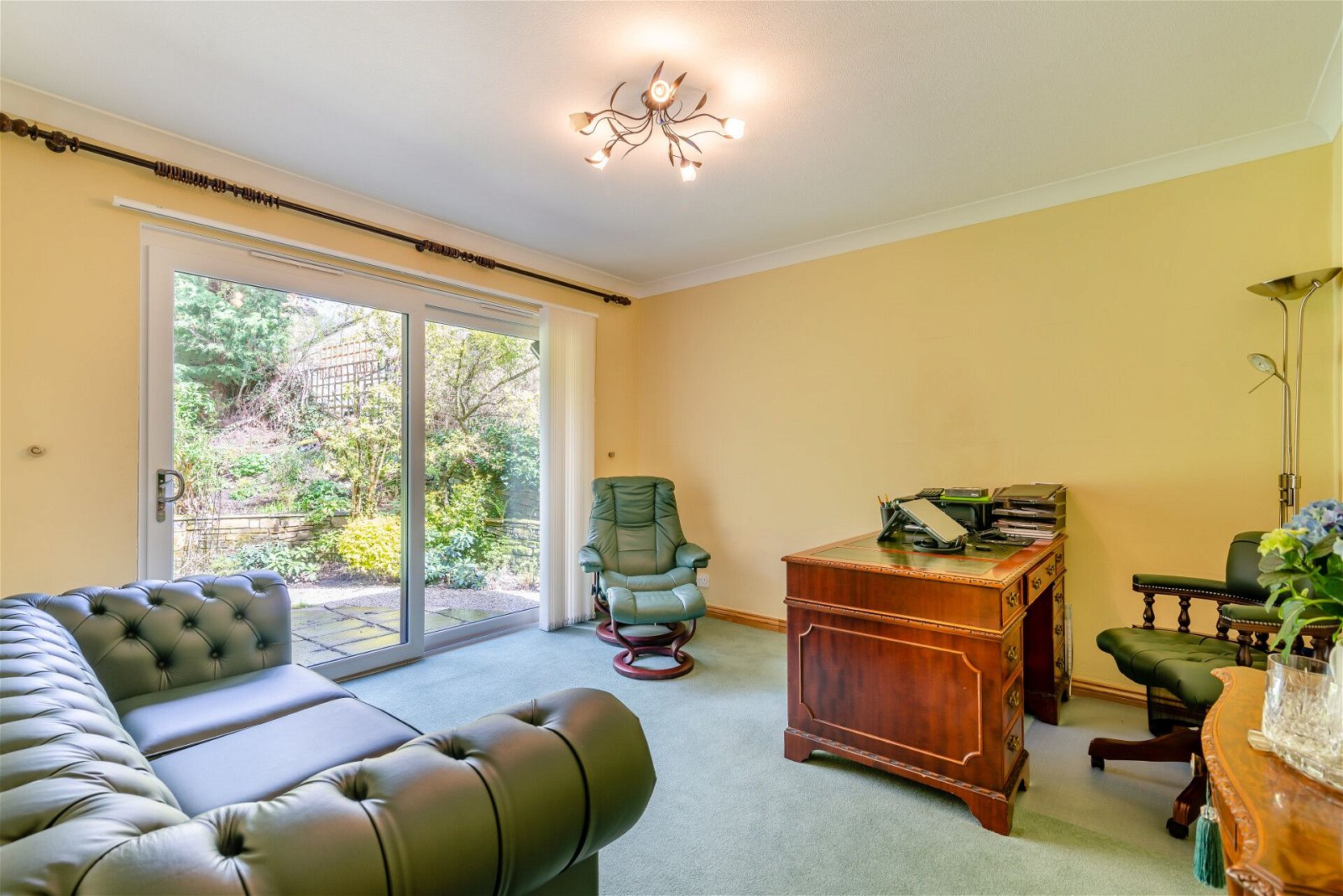 From the driveway parking, a sweeping staircase leads to the balcony area and front door. which is the perfect area for morning coffee. This leads into the entrance hall, which by preference of the current owners has been fitted with carpeting over existing wood flooring which extends into the dining room. An open wooden staircase with wrought iron detail leads to the first floor study area and large storage space. Leading from the entrance hall, fully glazed double doors open into the lounge. This lovely spacious room offers modern neutral colours benefitting from an abundance of natural light with large full height windows to the side aspect of the property. To the centre of the room, framed by the windows there is a contemporary hole in the wall living flame gas fire to add a focal point. In the formal dining room there are large full height windows with an outlook to the front of the property, this provides a perfect vista to enjoy the woodland aspect on the doorstep, and if you’re lucky, to spot a wild deer in its natural habitat. The kitchen sits adjacent to the formal dining room and has been designed with a high quality contemporary finish. Completed with handless base and wall units which provide plenty of storage, with integrated appliances including ovens and induction hob with extractor fan over, dishwasher, washing machine, fridge and freezer. Work surfaces are completed in a quality granite with inset sink and Quooker hot tap. There is breakfast bar seating for relaxed sociable dining. Fully glazed doors lead out to the terrace patio located at the front of the property and the garden to the rear. A side window with an aspect to the open woodland invites nosy wildlife to sneak a peek into the house. There are 3 double bedrooms at the property. The master bedroom is located at the rear and has striking views into the private garden with access through fully glazed French doors onto a paved patio. There are fitted wardrobes within an open dressing area and an en suite which comprises a step in shower cubicle with a glass screen, WC and hand wash basin with vanity unit, with tiles to the walls and tiles to the floor with under floor heating. Bedroom 2 is currently used as a home office although it could easily accommodate a double bed. With sliding doors leading to the garden this lovely versatile room would be ideal to be enjoyed as a garden room to admire the outlook of the rear garden. Bedroom 3 has a full wall of fitted wardrobes and full height windows with a pleasant outlook to the side aspect. The house bathroom has been completed with a modern 4 piece suite which comprises a bath, step in shower cubicle, WC and sink with vanity unit storage, tiles to the walls and tiles to the floor with under floor heating.