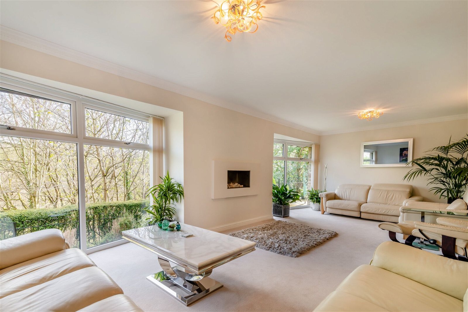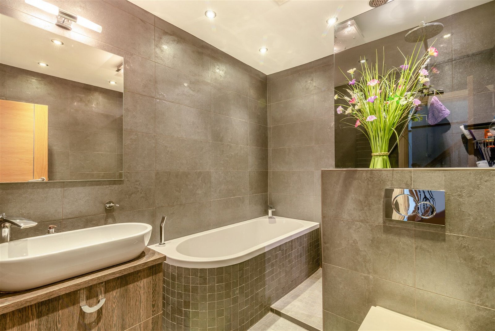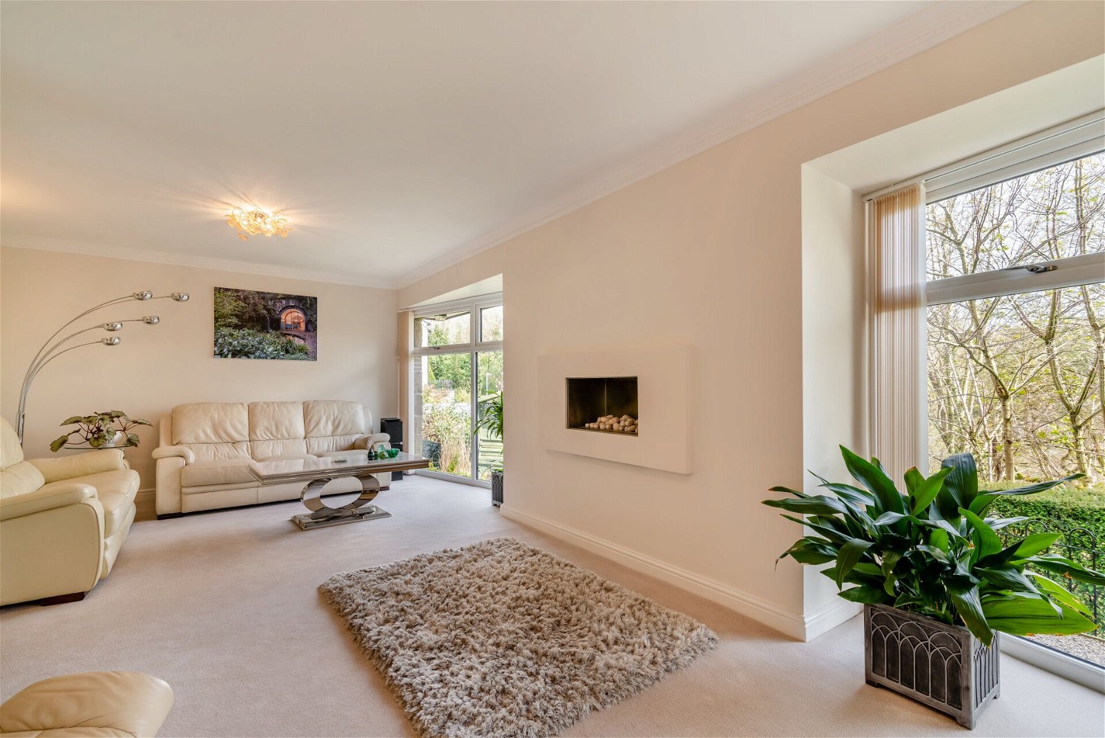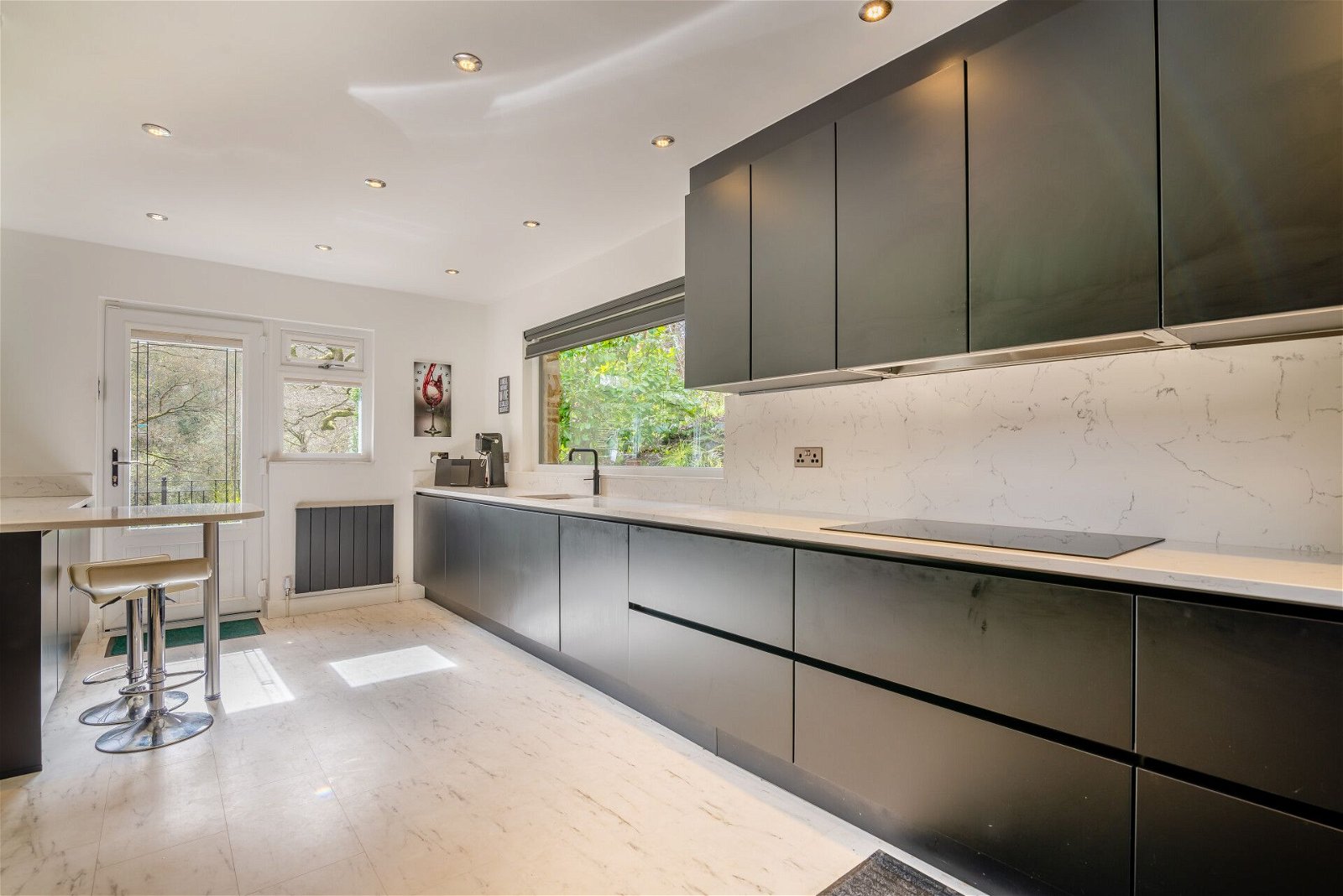 From the driveway parking, a sweeping staircase leads to the balcony area and front door. which is the perfect area for morning coffee. This leads into the entrance hall, which by preference of the current owners has been fitted with carpeting over existing wood flooring which extends into the dining room. An open wooden staircase with wrought iron detail leads to the first floor study area and large storage space. Leading from the entrance hall, fully glazed double doors open into the lounge. This lovely spacious room offers modern neutral colours benefitting from an abundance of natural light with large full height windows to the side aspect of the property. To the centre of the room, framed by the windows there is a contemporary hole in the wall living flame gas fire to add a focal point. In the formal dining room there are large full height windows with an outlook to the front of the property, this provides a perfect vista to enjoy the woodland aspect on the doorstep, and if you’re lucky, to spot a wild deer in its natural habitat. The kitchen sits adjacent to the formal dining room and has been designed with a high quality contemporary finish. Completed with handless base and wall units which provide plenty of storage, with integrated appliances including ovens and induction hob with extractor fan over, dishwasher, washing machine, fridge and freezer. Work surfaces are completed in a quality granite with inset sink and Quooker hot tap. There is breakfast bar seating for relaxed sociable dining. Fully glazed doors lead out to the terrace patio located at the front of the property and the garden to the rear. A side window with an aspect to the open woodland invites nosy wildlife to sneak a peek into the house. There are 3 double bedrooms at the property. The master bedroom is located at the rear and has striking views into the private garden with access through fully glazed French doors onto a paved patio. There are fitted wardrobes within an open dressing area and an en suite which comprises a step in shower cubicle with a glass screen, WC and hand wash basin with vanity unit, with tiles to the walls and tiles to the floor with under floor heating. Bedroom 2 is currently used as a home office although it could easily accommodate a double bed. With sliding doors leading to the garden this lovely versatile room would be ideal to be enjoyed as a garden room to admire the outlook of the rear garden. Bedroom 3 has a full wall of fitted wardrobes and full height windows with a pleasant outlook to the side aspect. The house bathroom has been completed with a modern 4 piece suite which comprises a bath, step in shower cubicle, WC and sink with vanity unit storage, tiles to the walls and tiles to the floor with under floor heating.